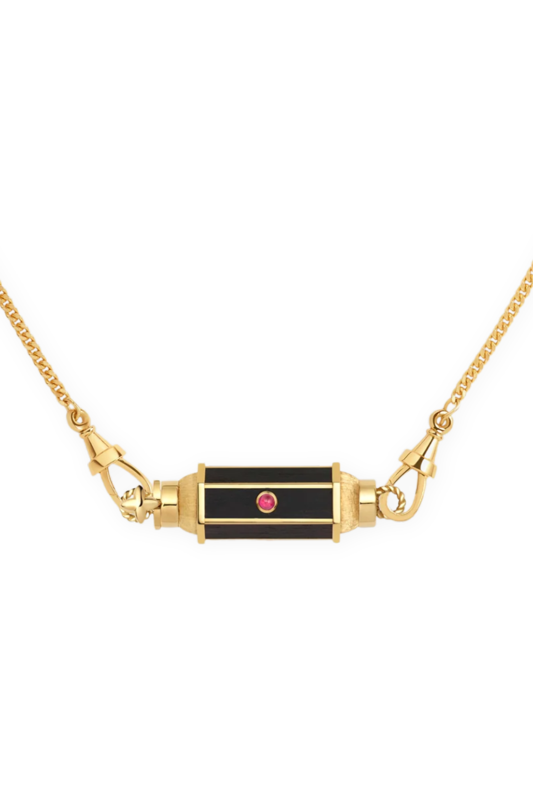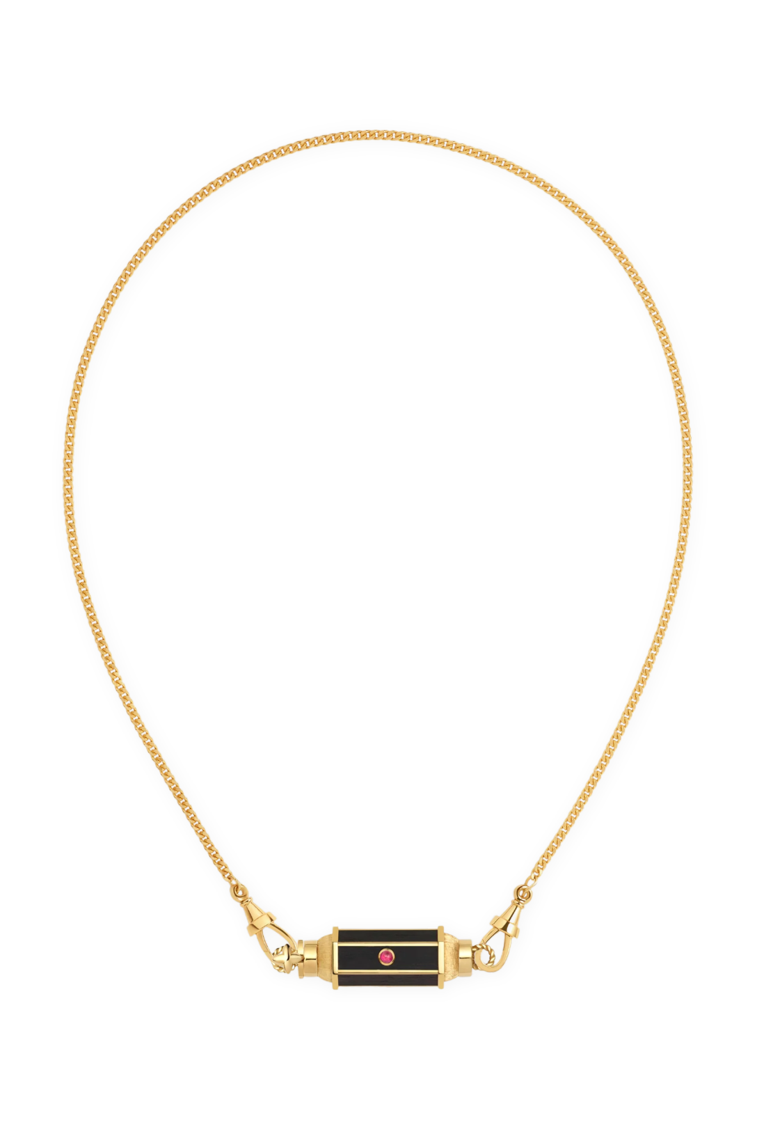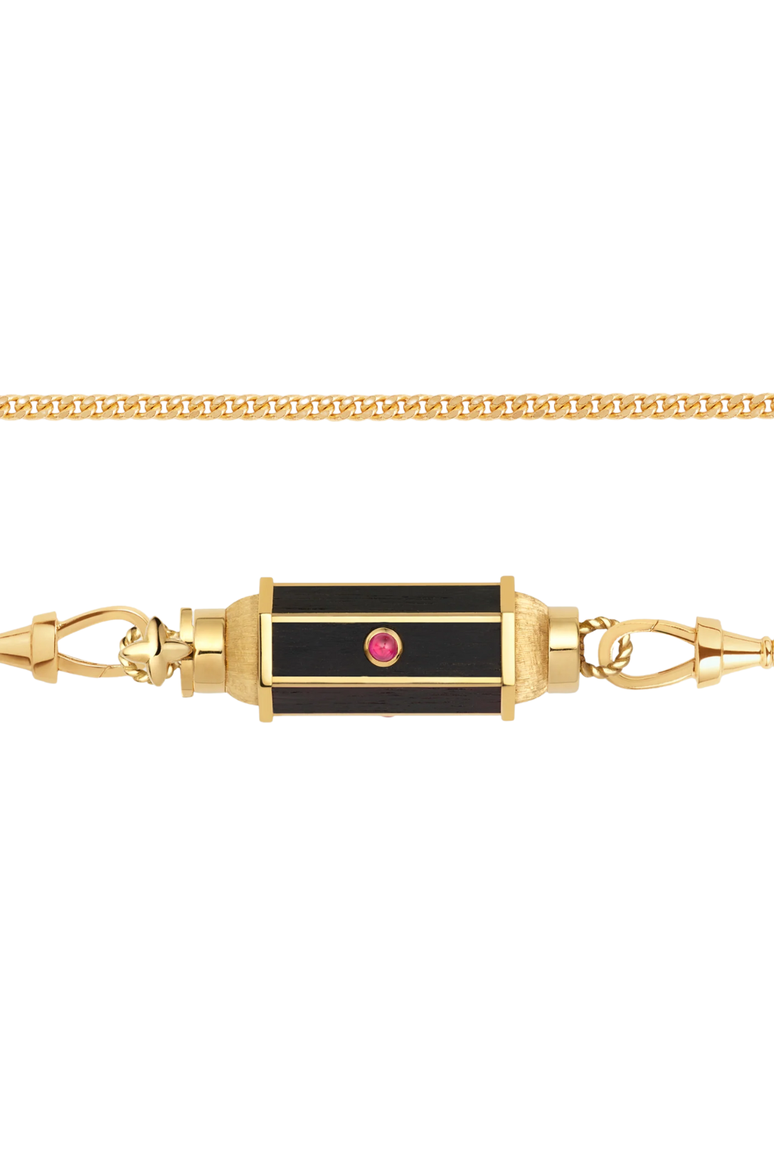 Thin gold pendant barrel, adorned with ebony and set with a ruby.