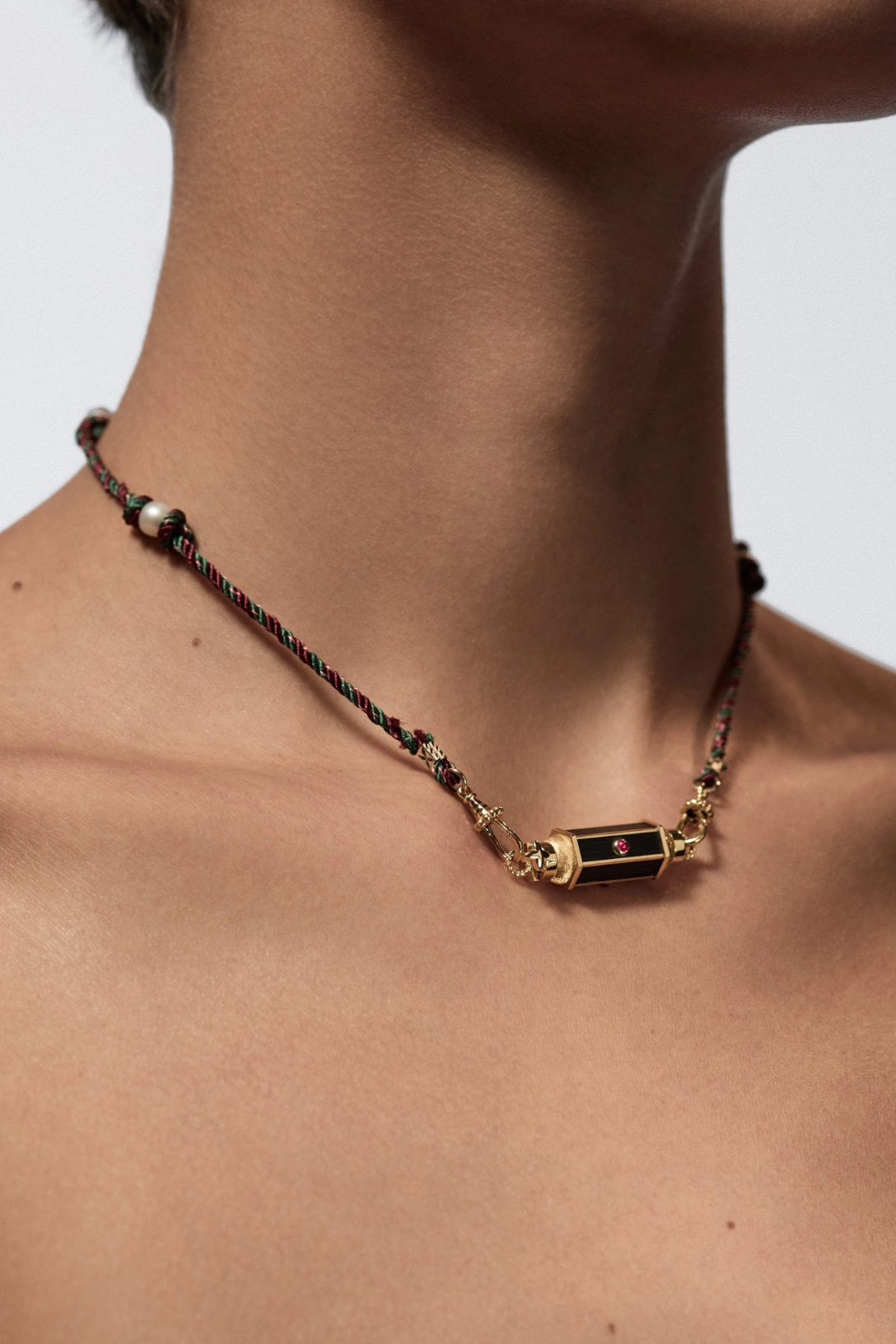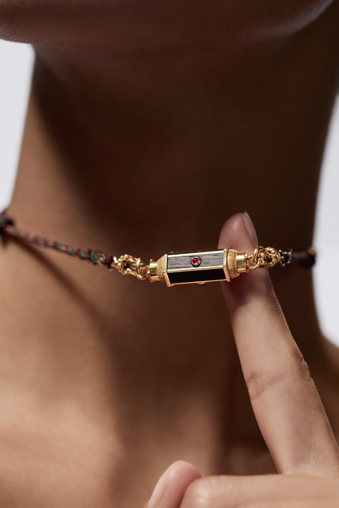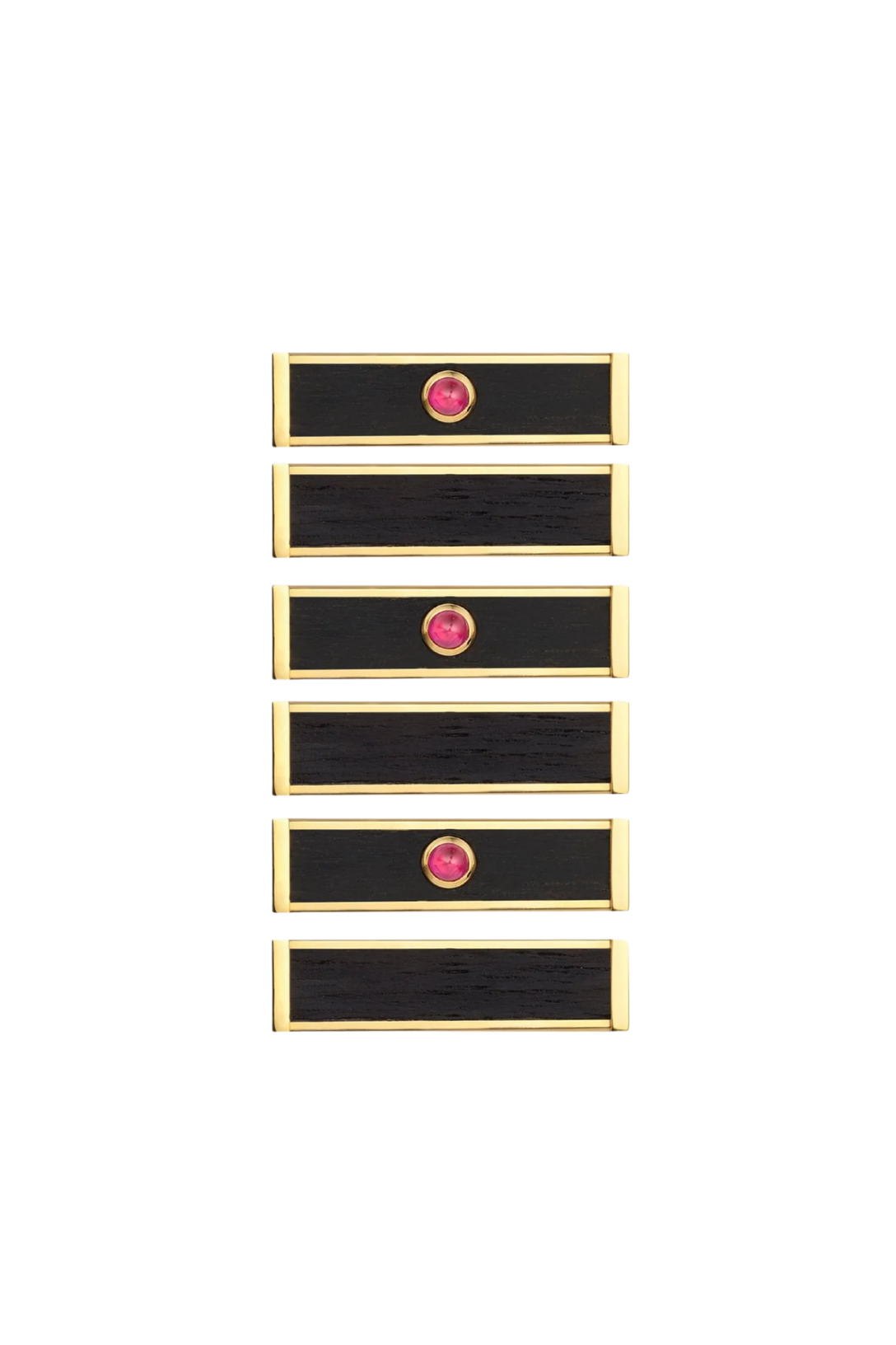 Thin gold pendant barrel, adorned with ebony and set with a ruby.