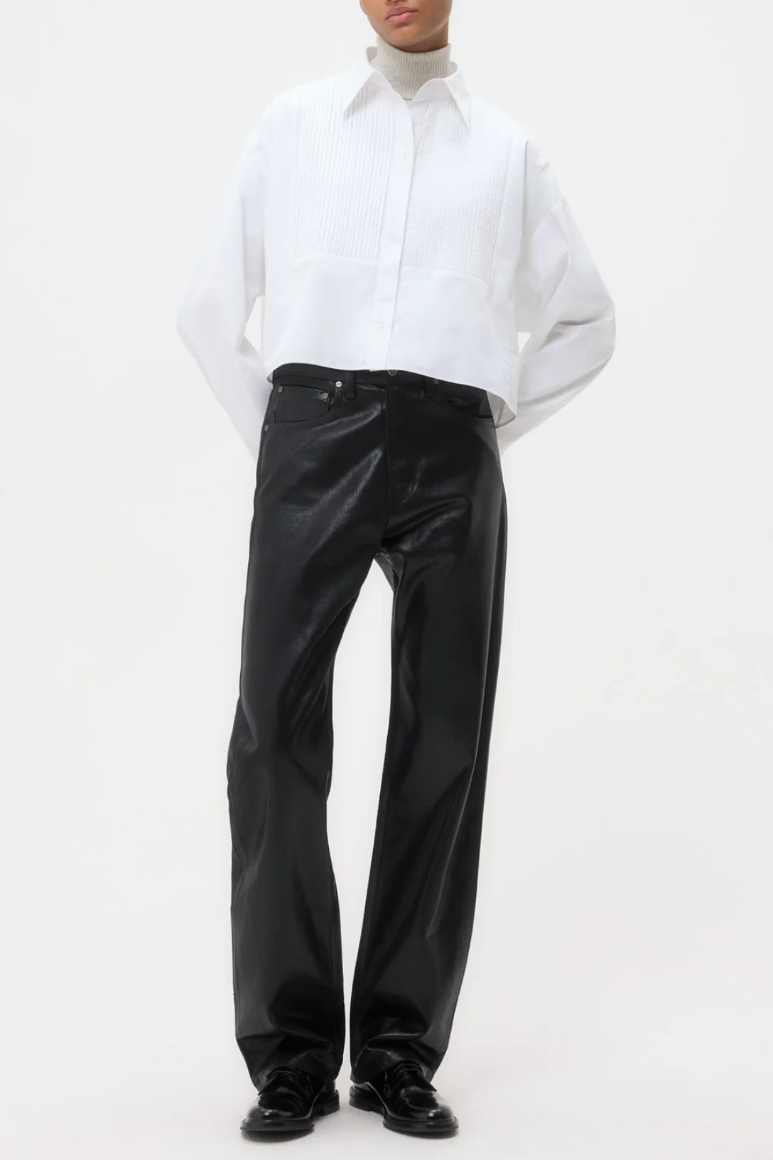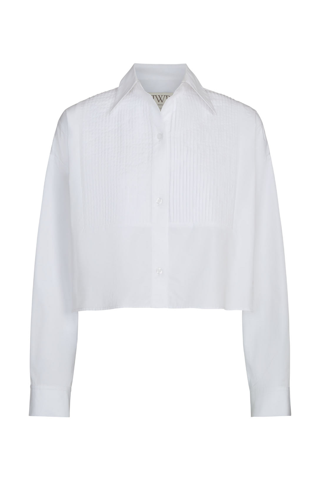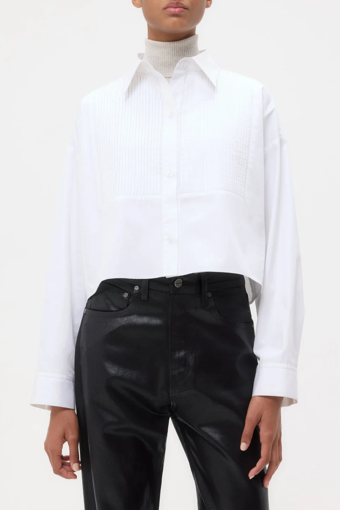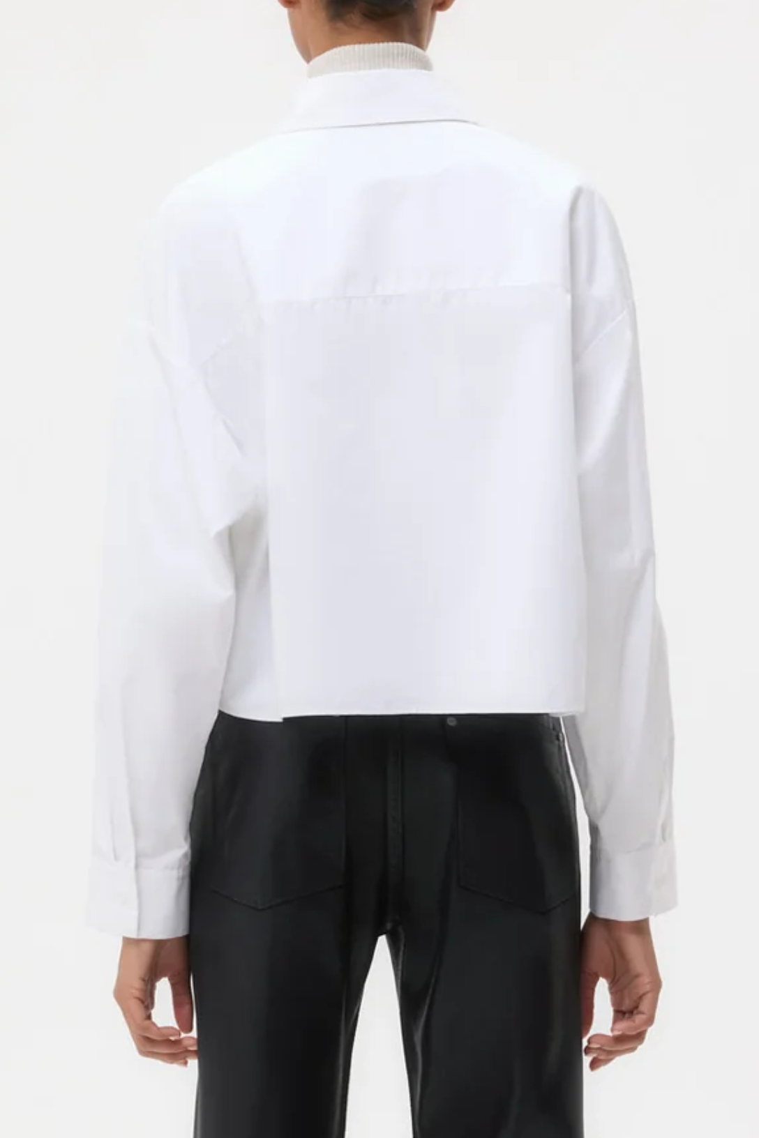 Cropped long-sleeve button-down in cotton poplin. The Soon To Be Ex features a boxy silhouette with a tuxedo-style bib. Complete with an exposed button-up placket, chest patch pocket, and single-pick up button cuffs.