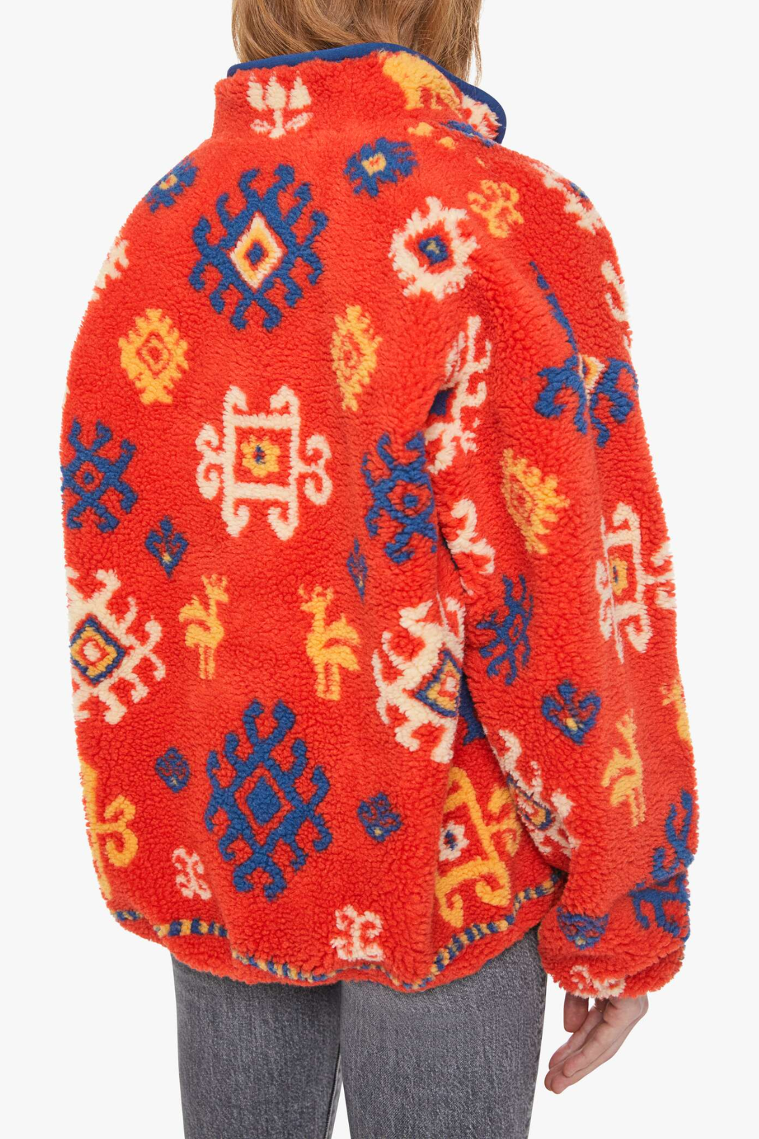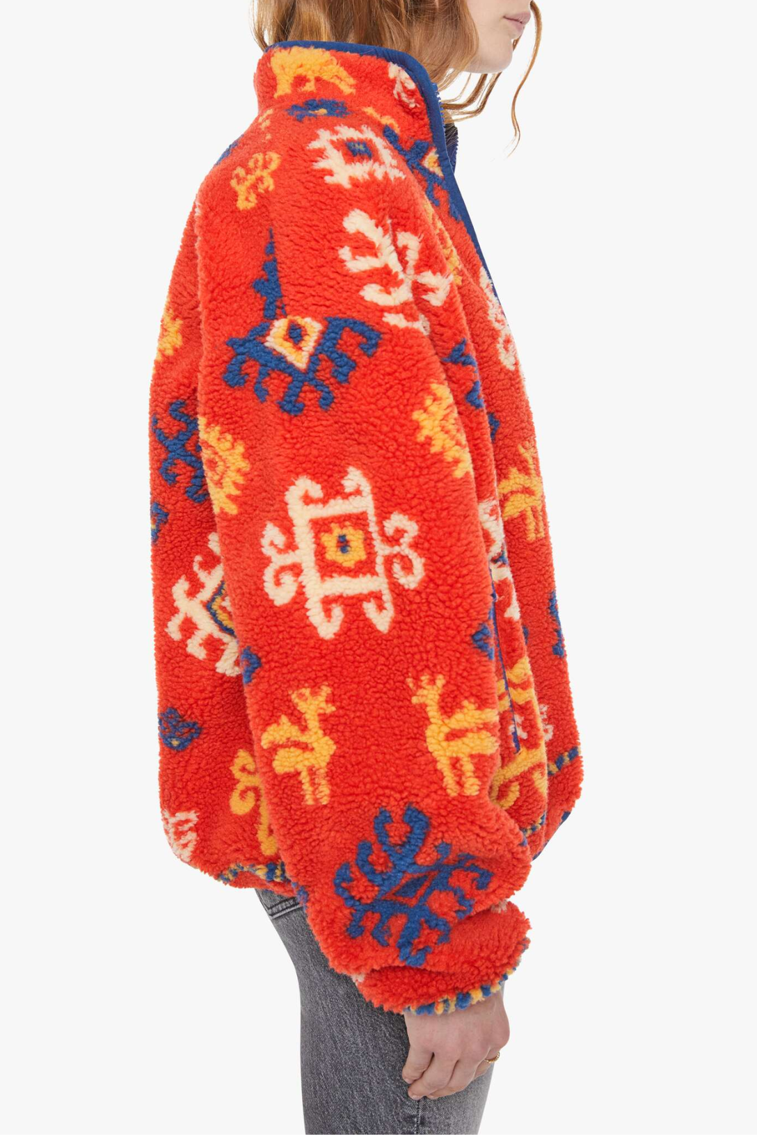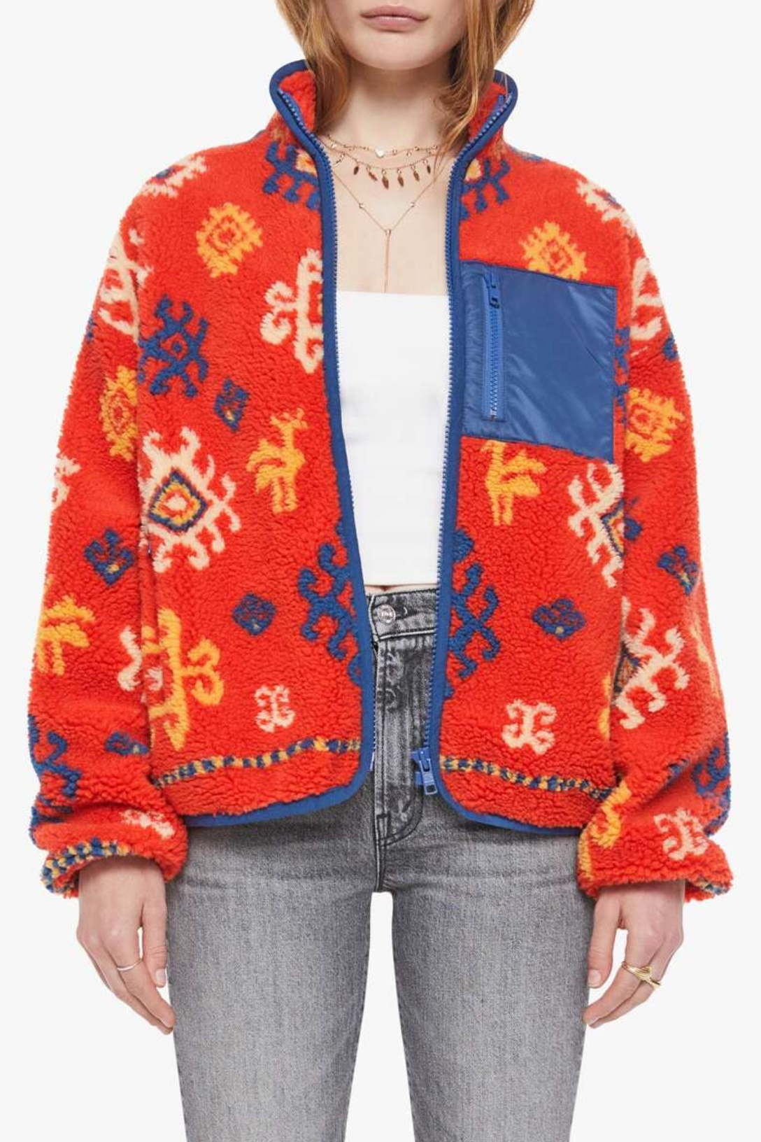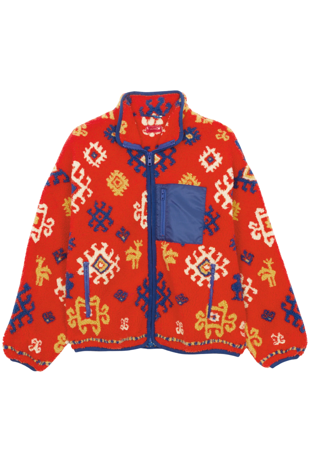 It's showtime. A cozy fleece jacket with a high neck, drop shoulders, zip pockets and curved hems. Designed in red, Sing For Your Supper features a folk art-inspired graphic print with blue trim and details.