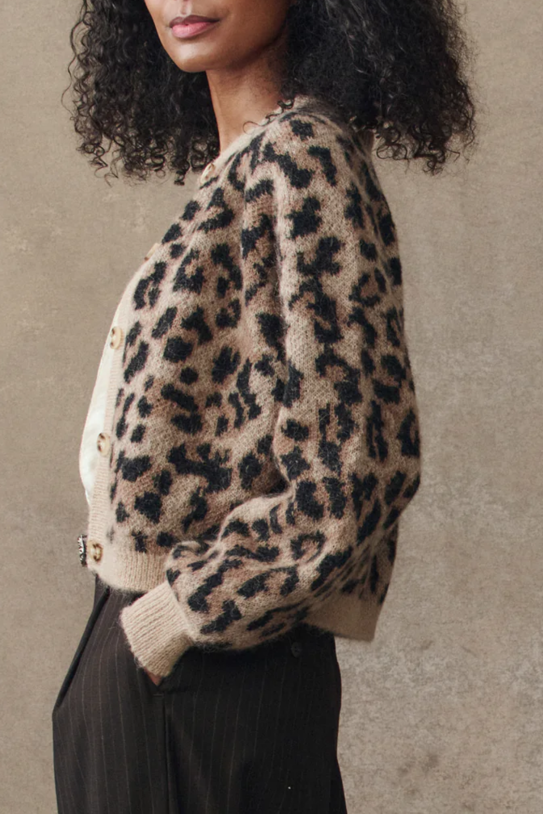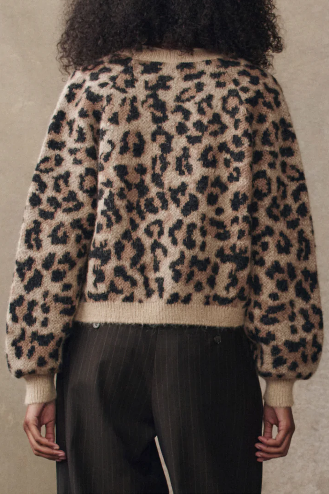 Classic with a twist, this cropped cardigan is spun from a lofty alpaca blend and knit with a bold leopard jacquard in a playfully oversized scale this versatile sweater is finished with blouson sleeves and light horn buttons.