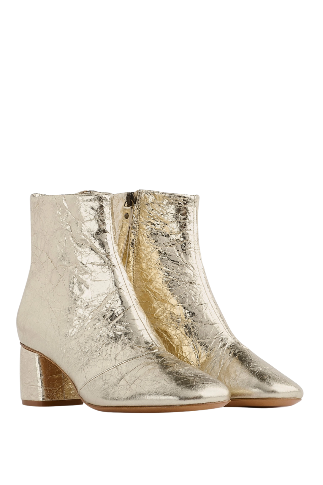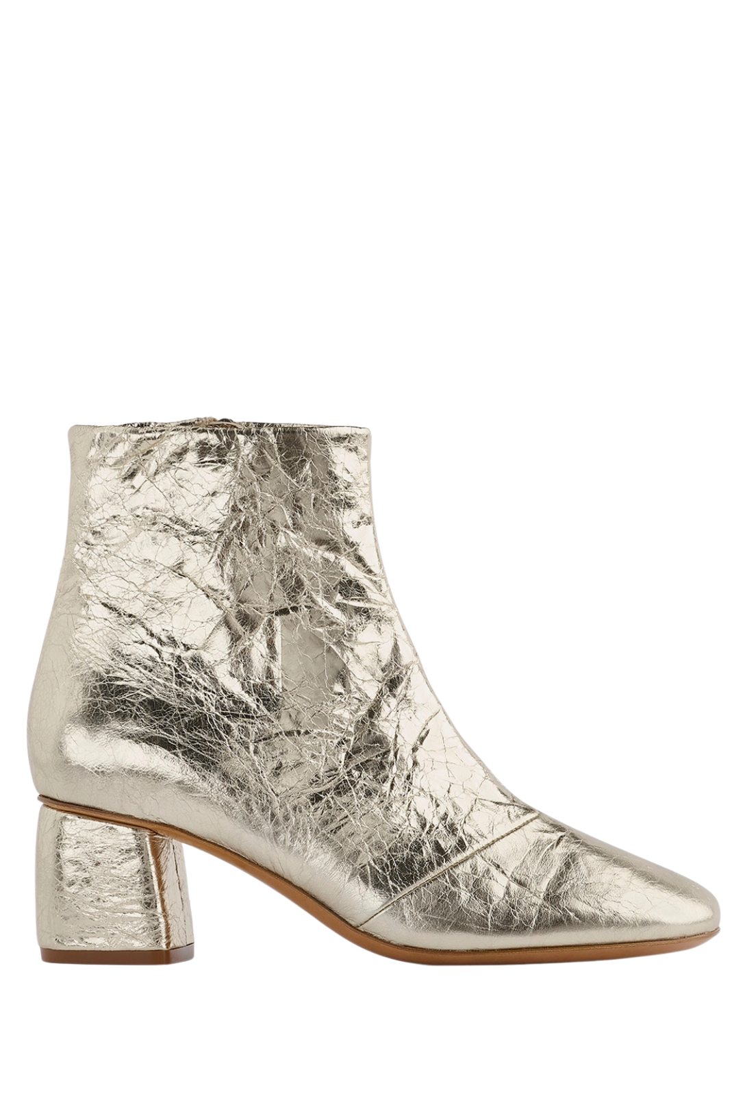 The crackled lamé finish elevates this ankle boot in calfskin with a soft sheen. It has a rounded toe, contoured heel and an inner–leg zip for a comfortable fit.