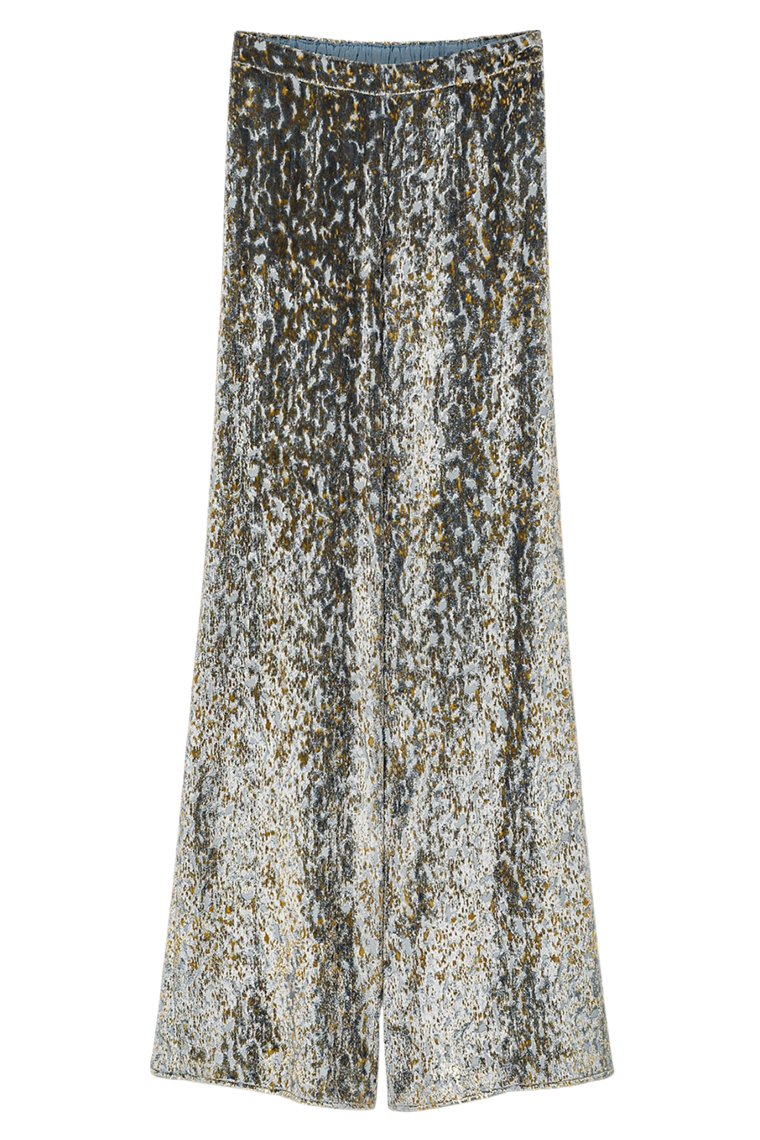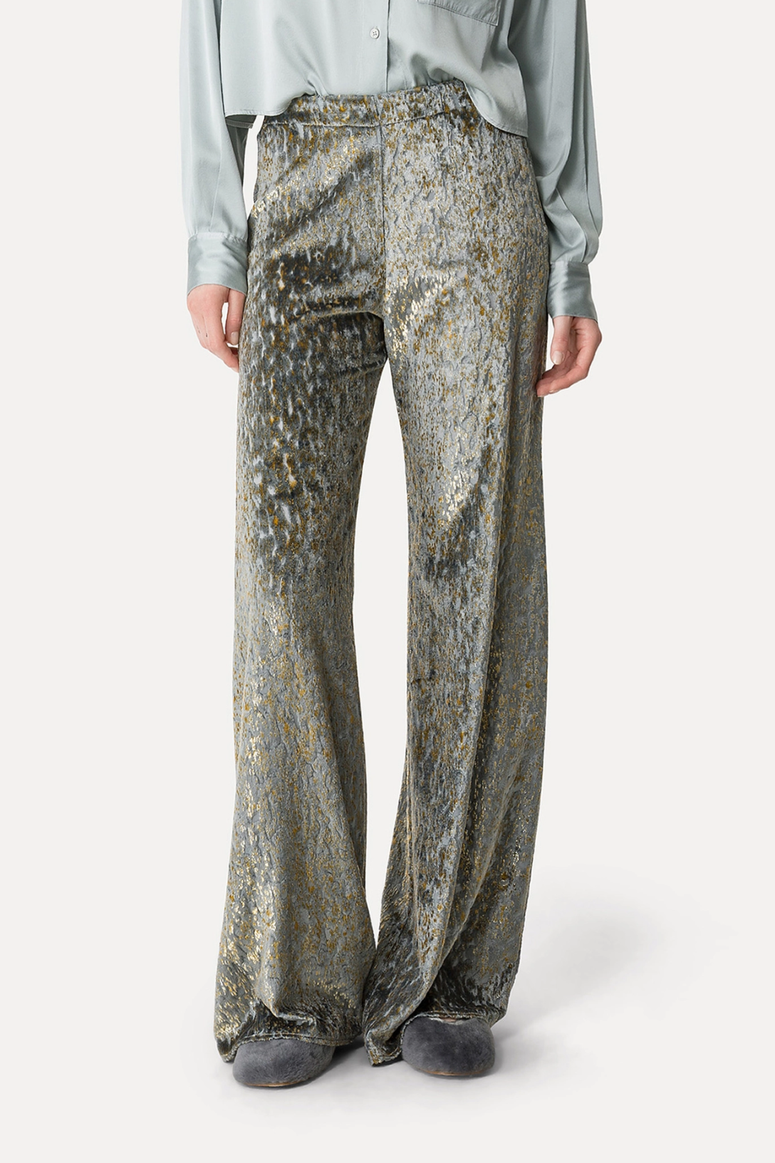 With a fluid naturally elegant drape, the flared trousers in “en rêve” fil–coupé are doused in a nocturnal palette. The refined silk–and–viscose velvet is warm to the touch and has been embellished with a devoré pattern that gives depth and dimension. The elasticated casing at the back of the waist brings a mellow touch to this signature Forte Forte creation.