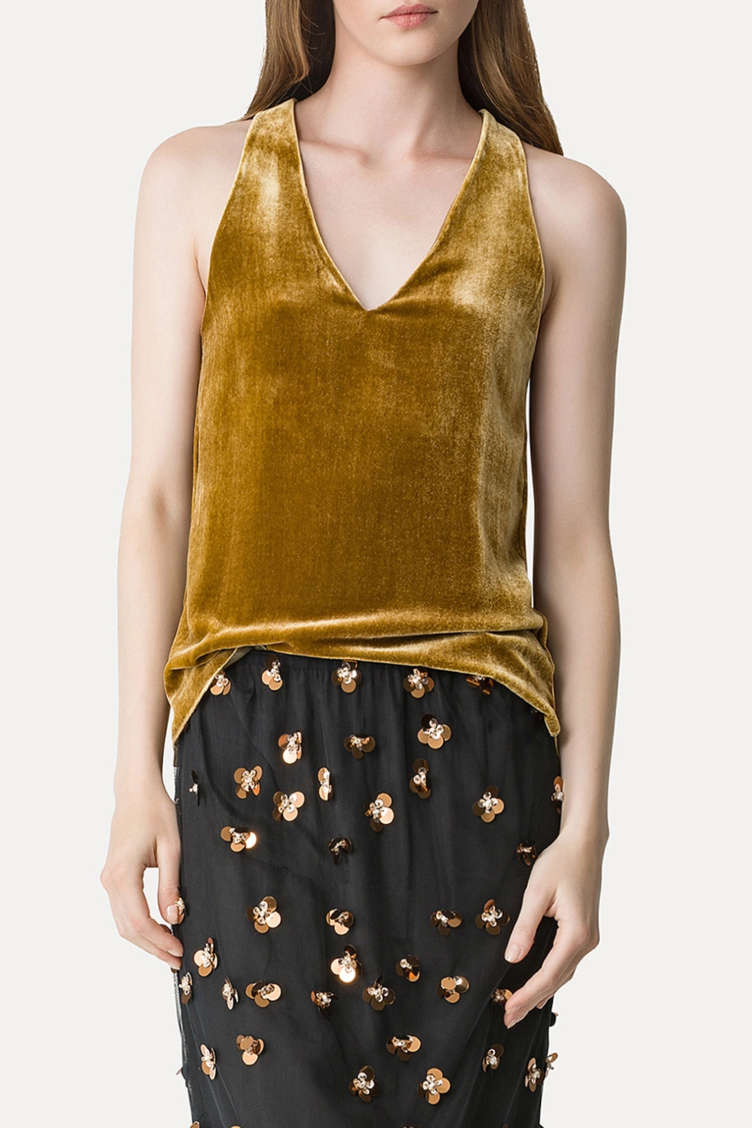 With bare shoulders and a revealing front neckline, the v–neck top in plain velvet has been made from a silk and viscose blend, making it sumptuously soft against the skin. It is invitingly plush and has a lustrous sheen that will brighten any look.