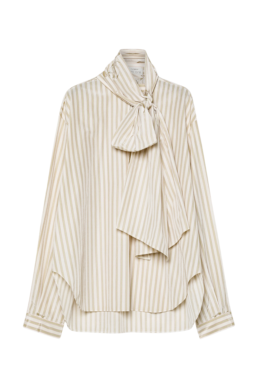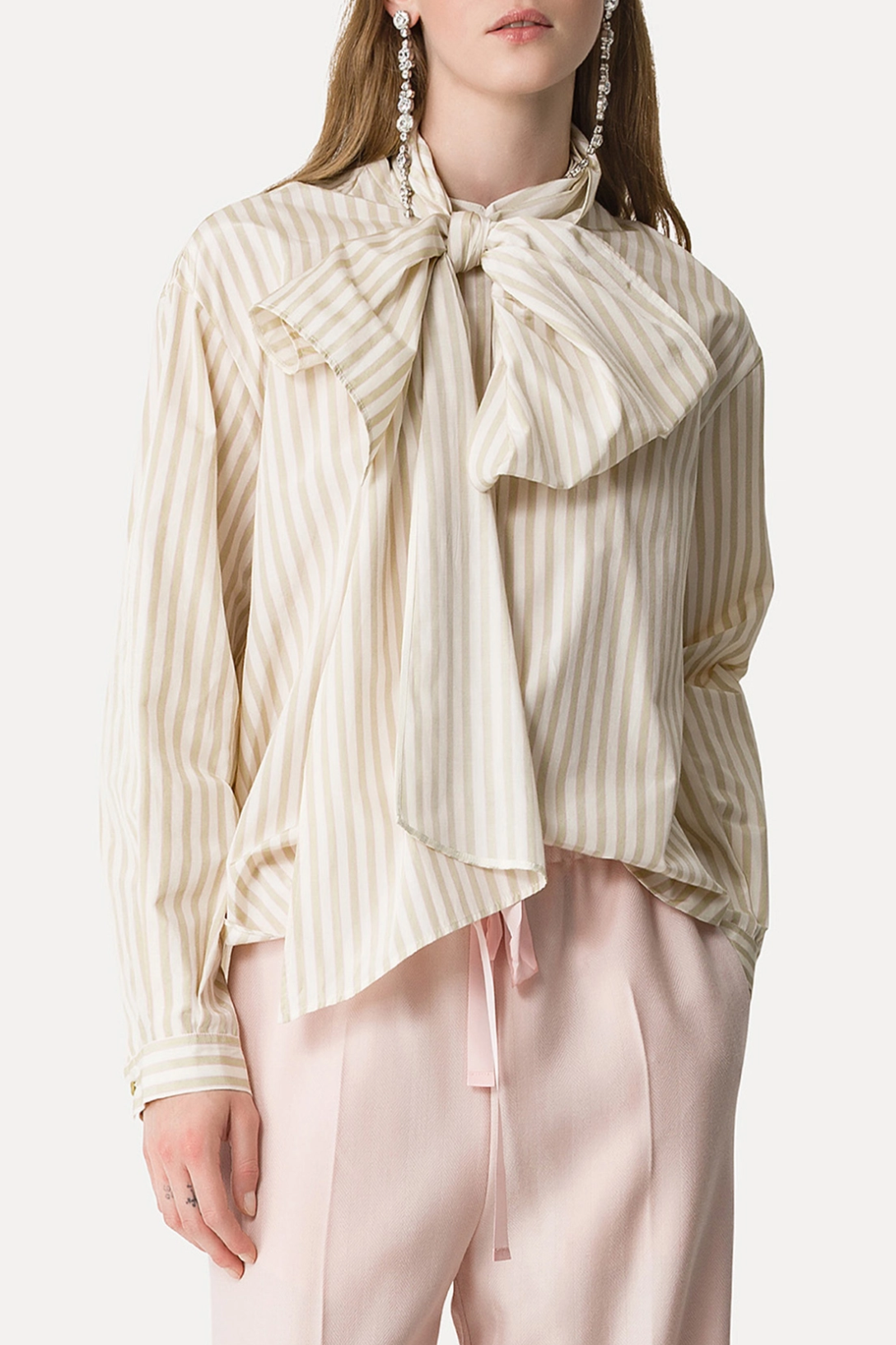 With a dropped shoulder and fresh riviera stripe motif, this taffeta shirt with a striped pattern and detachable bow detail has a loose oversized fit. The cool fabric has a slight sheen and curved asymmetrical hemline. The neat detachable bow detail is meant to be knotted at the neck and styled to suit the occasion.