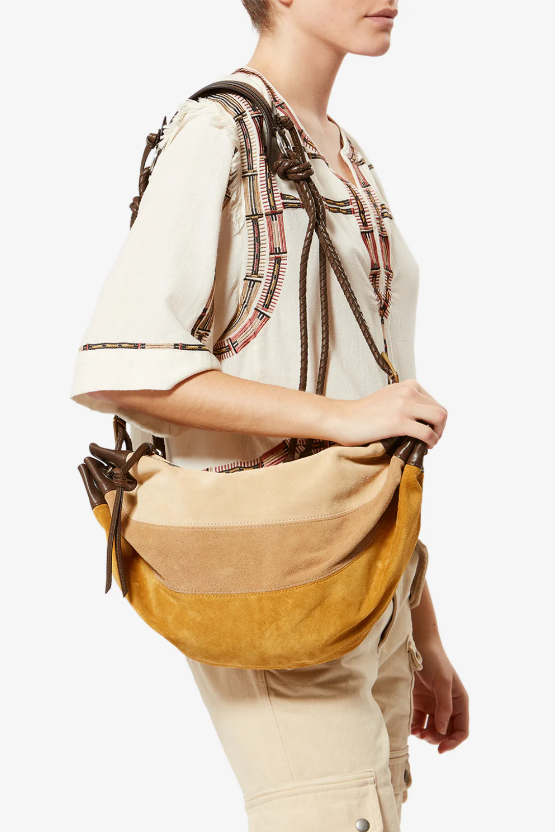 Pleated patchwork beige suede calfskin and smooth chocolate leather half-moon bag.