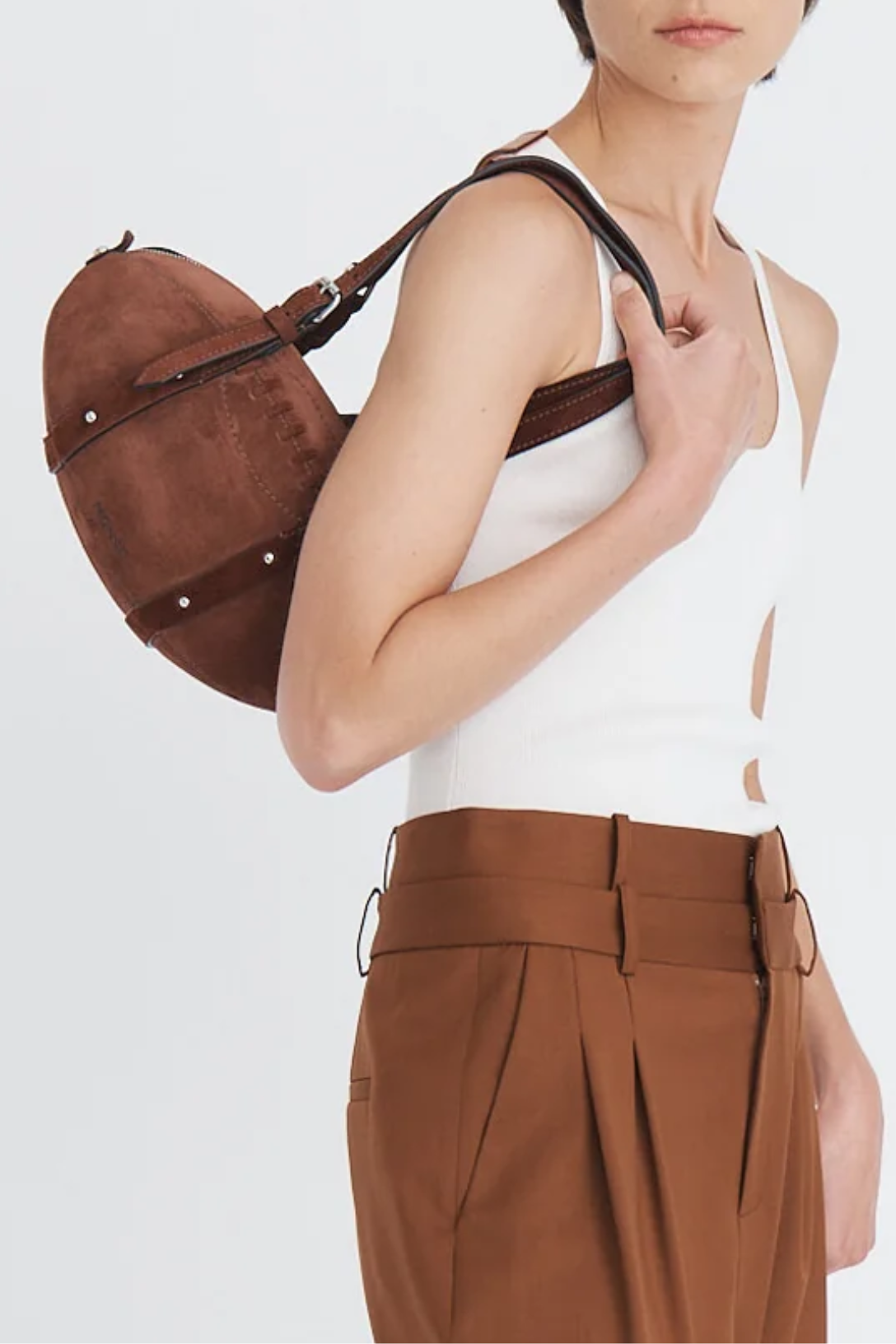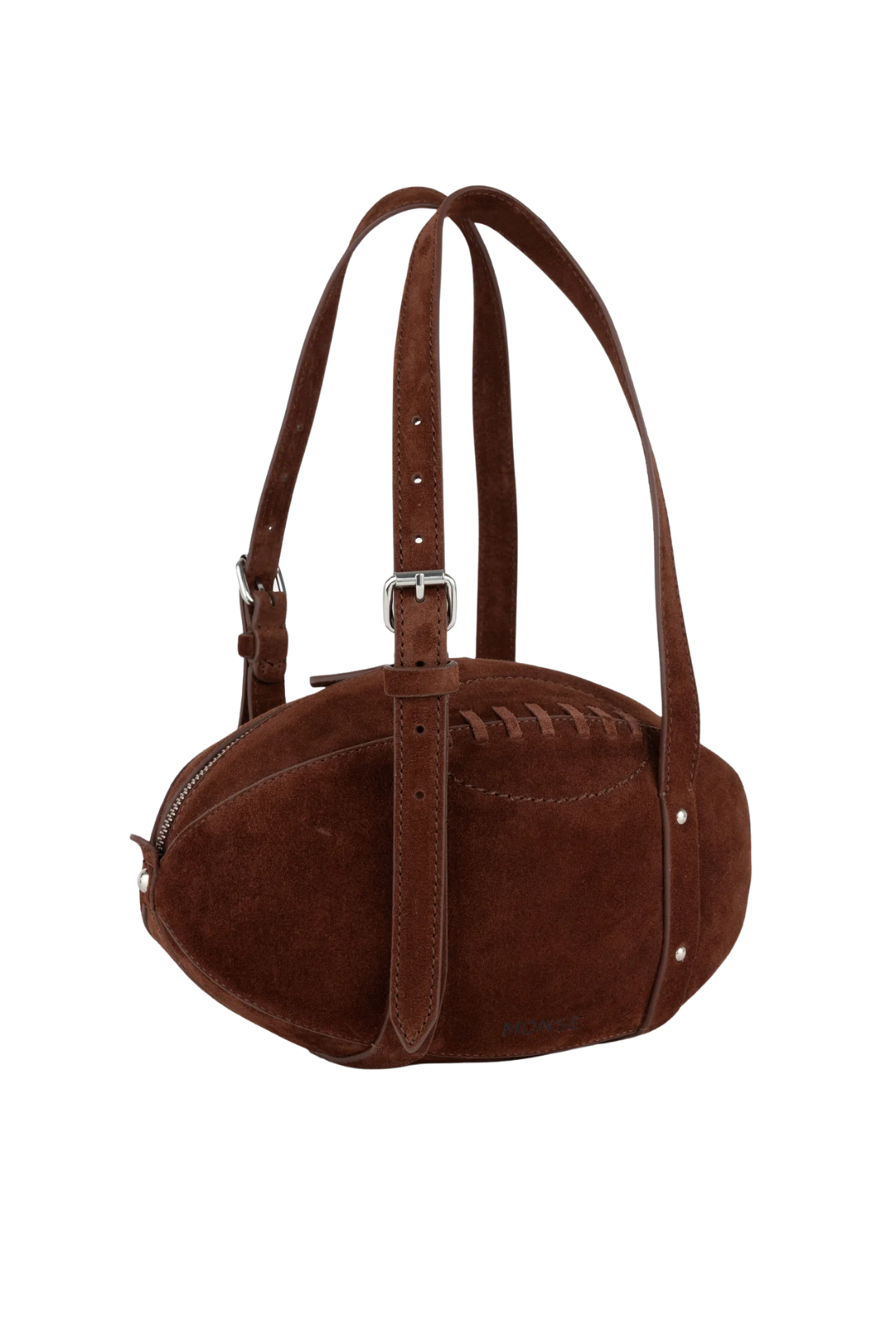 The cult-favorite Football Bag gets a luxe update in rich suede - playful, refined, and totally unexpected. Shaped like a football, this bag is crafted from deep brown suede with tonal stitching, silver hardware, and adjustable leather shoulder straps. Finished with a subtle MONSE logo embossed on the front.