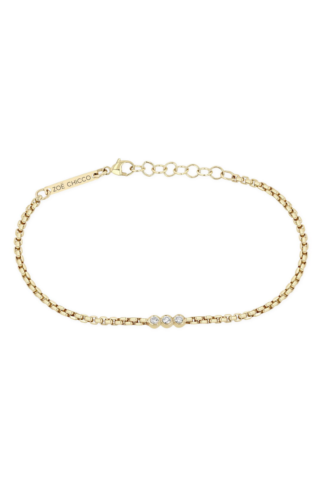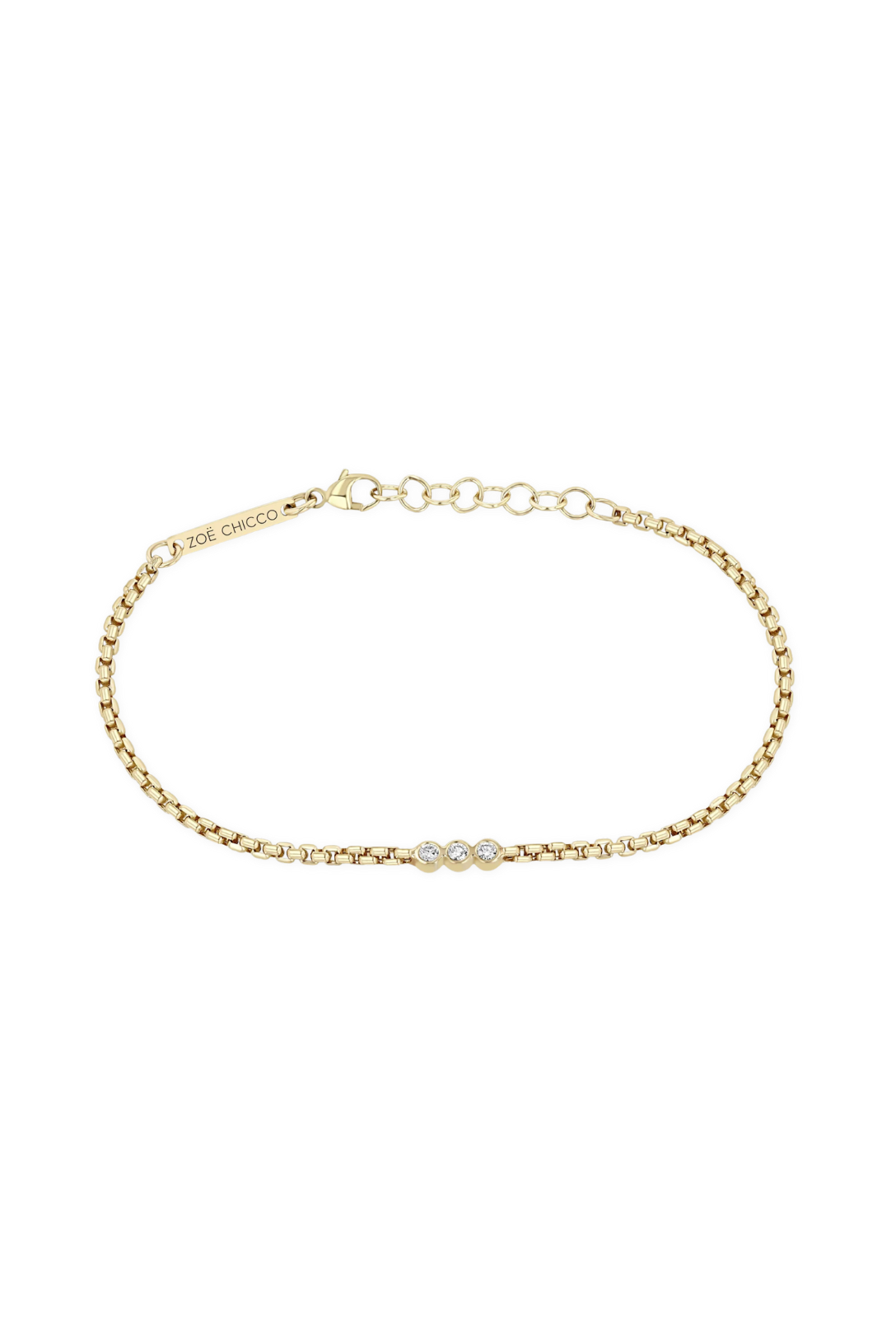 14K Yellow Gold small box chain bracelet with a row of three bezel set round diamonds set together in the chain.