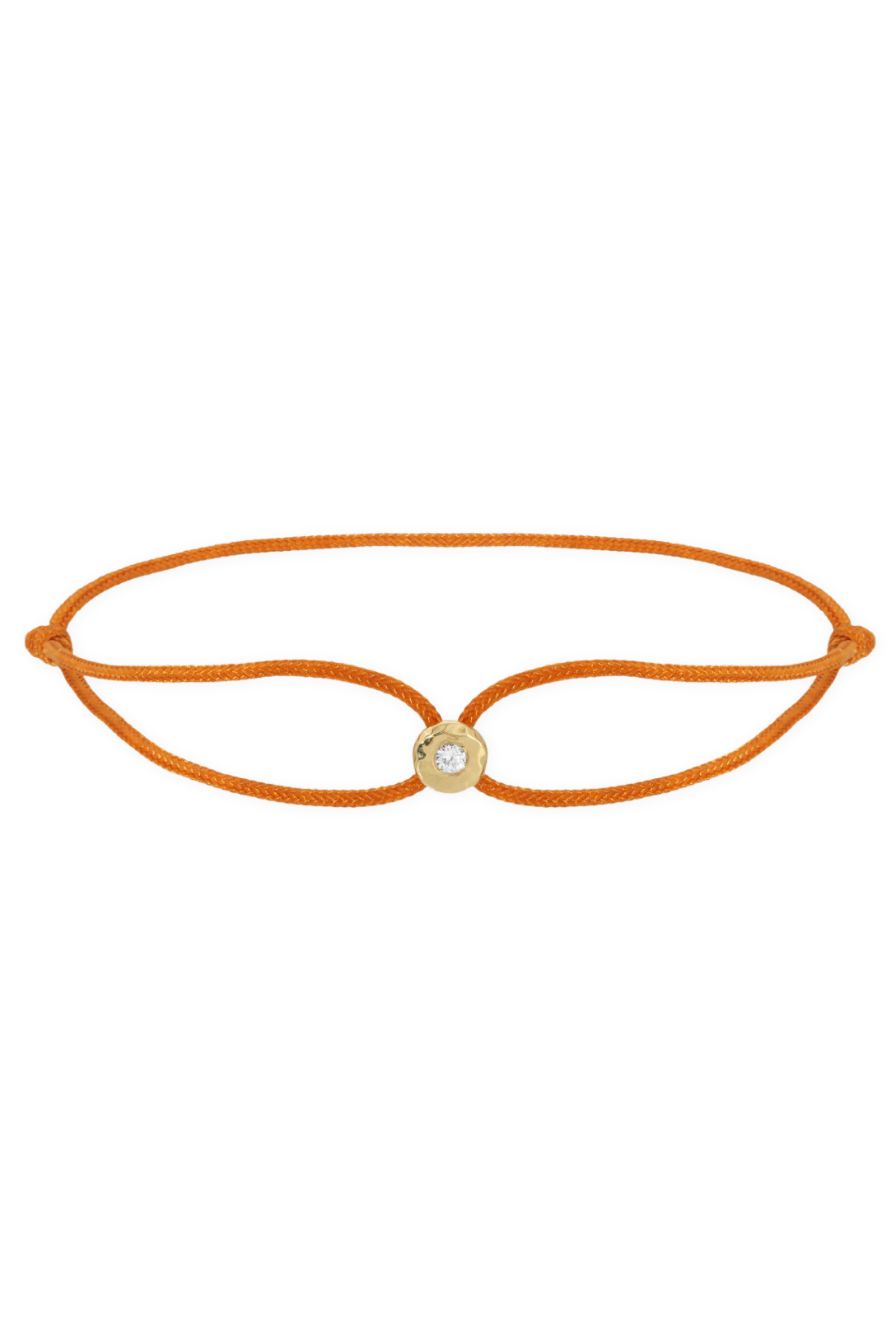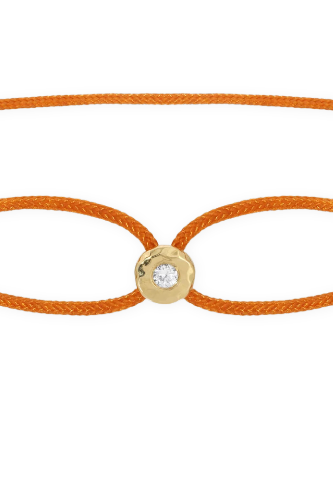 From Octavia Elizabeth's capsule Nesting Gem Collection, rich 18K Yellow Gold surrounds a diamond. Each bezel is finished by hand in the Octavia Elizabeth signature hammer finish. The Parachute Bracelet is adjustable and when open, the size fits most.