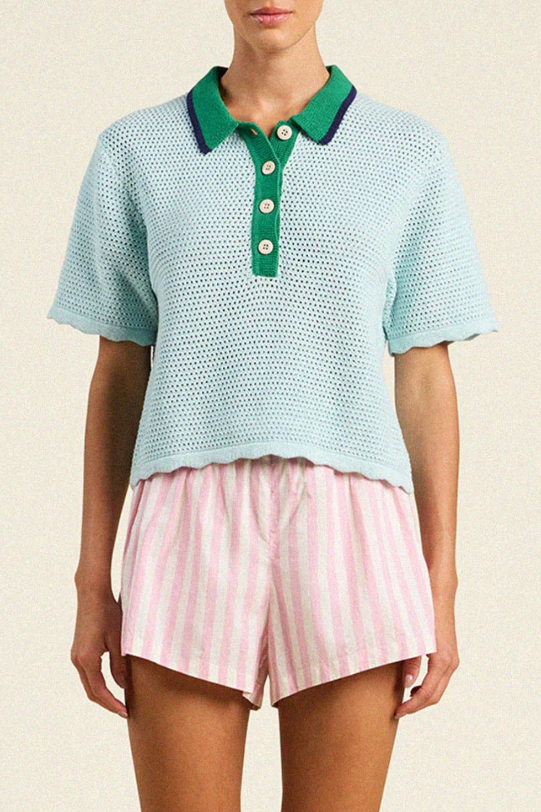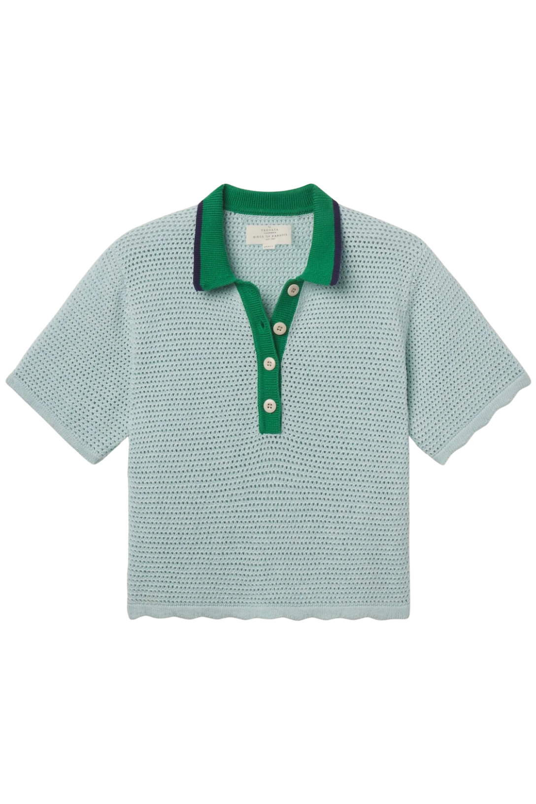 The Amalia Polo is a short-sleeve, loosely knit style inspired by TROVATA's beloved Jules Sweater T-Shirt. Made in a lightweight, textured cotton, it features a contrast collar and buttoned placket, scalloped-trimmed hems, and a subtle stripe of color along the collar’s edge. Shown here in Light Blue and made from TROVATA's cotton.
