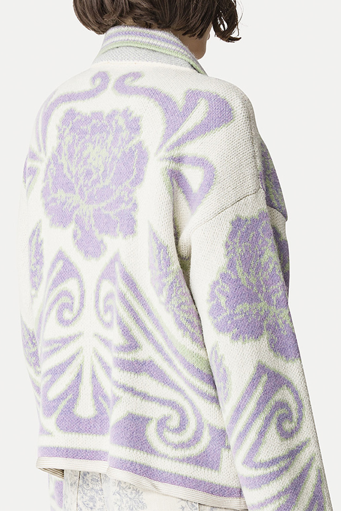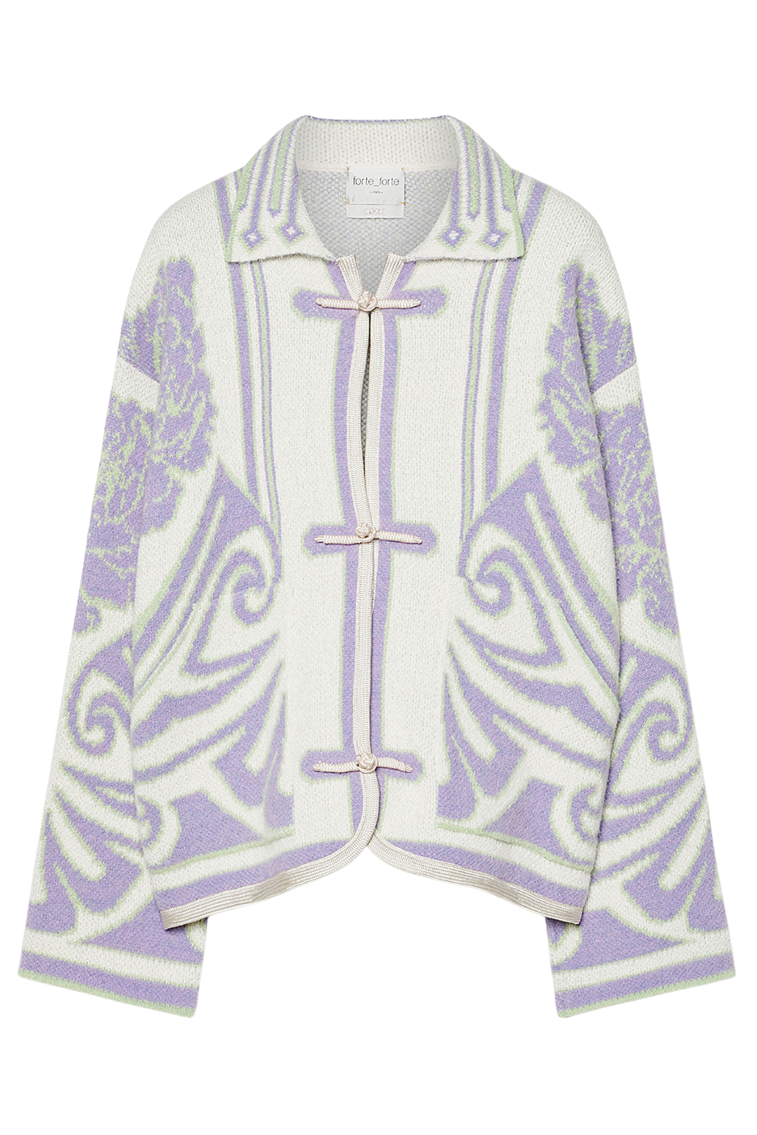 Jacket with hand—tied toggles, crafted from warm, enveloping jacquard knit with a mélange yarn of bouclé cotton, chenille, and alpaca. The richness of the workmanship, featuring peonies and botanical—inspired patterns, makes this toggle jacket a perfect layering piece over light tops.