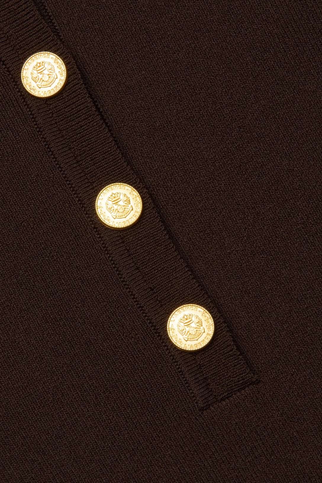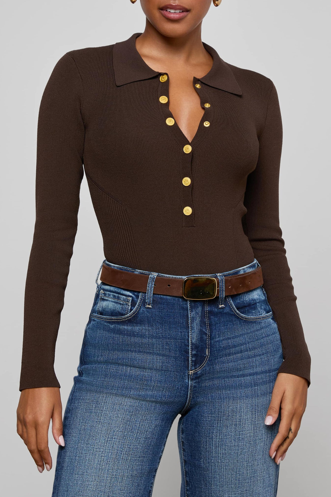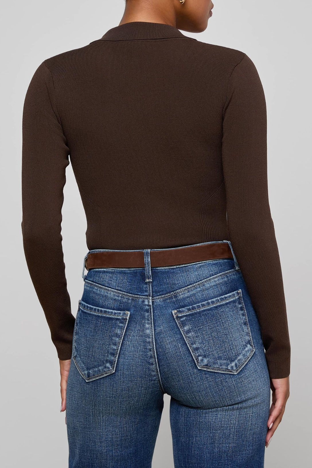 The long sleeve polo top in bodysuit form. The Elisabetta features a deep V-neckline, sharp collar, and snap button placket for a touch of polish. Designed in a stretch ribbed knit, it offers a smooth, body-hugging fit that layers perfectly under jeans, skirts, or suiting. Now back in chocolate brown.