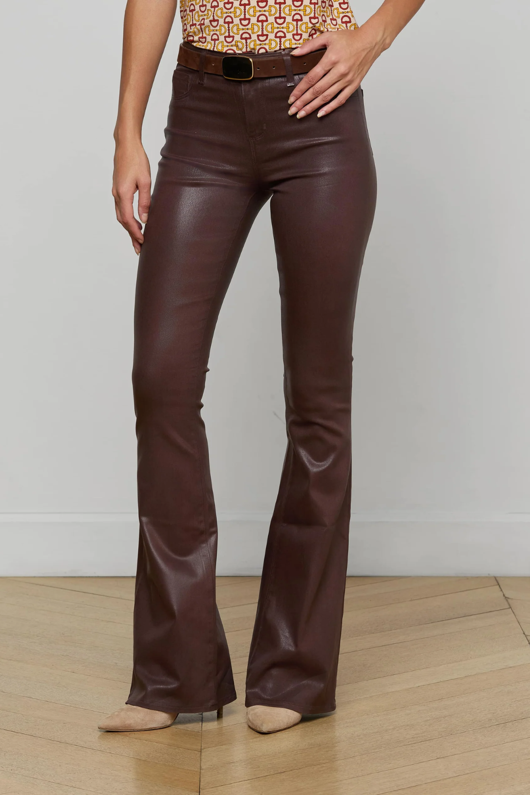 A perfectly proportioned fit in a modern fabrication. The Marty flare jean is now back in a chocolate brown shade of L'AGENCE's leather alternative coated denim.