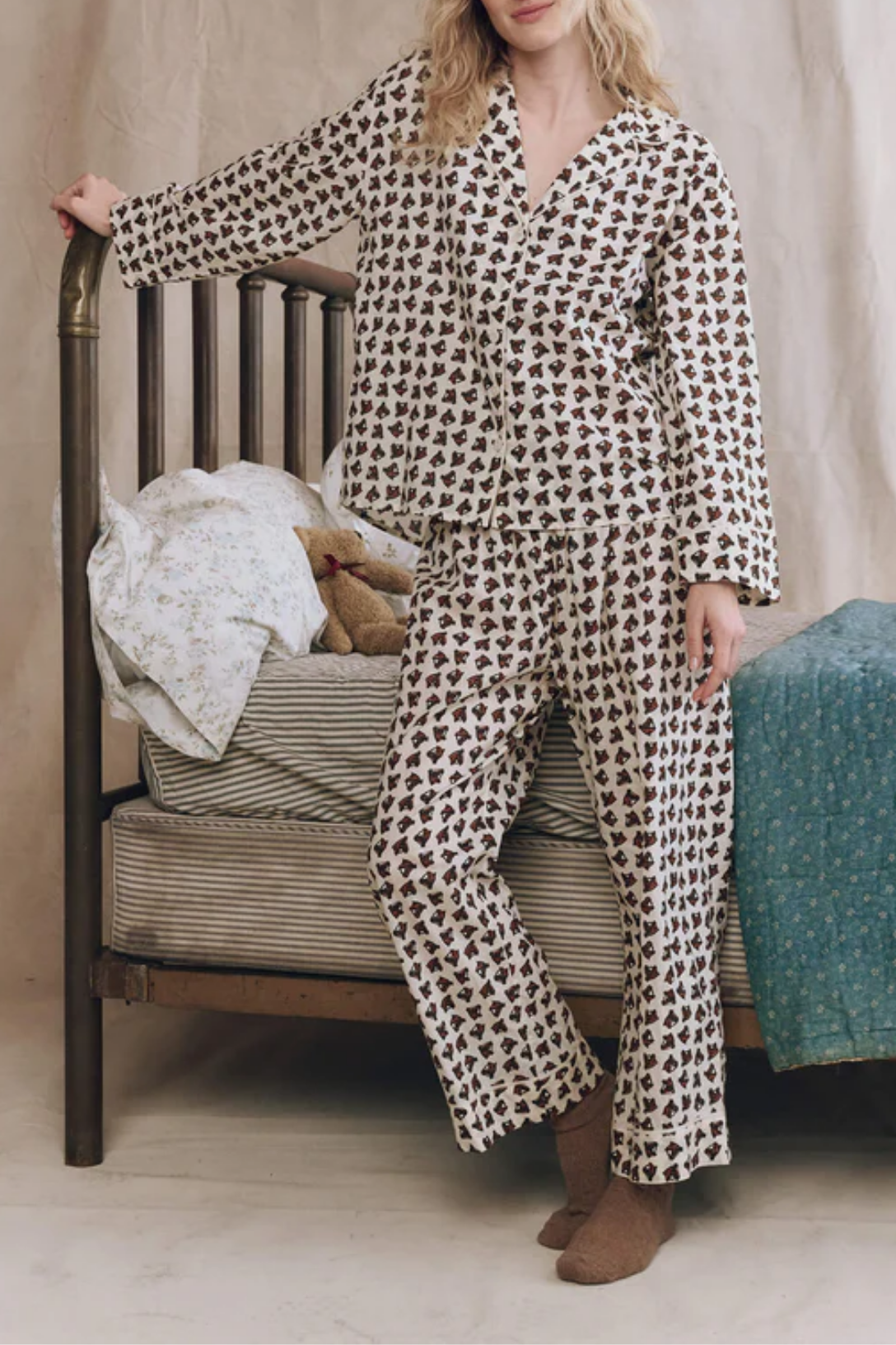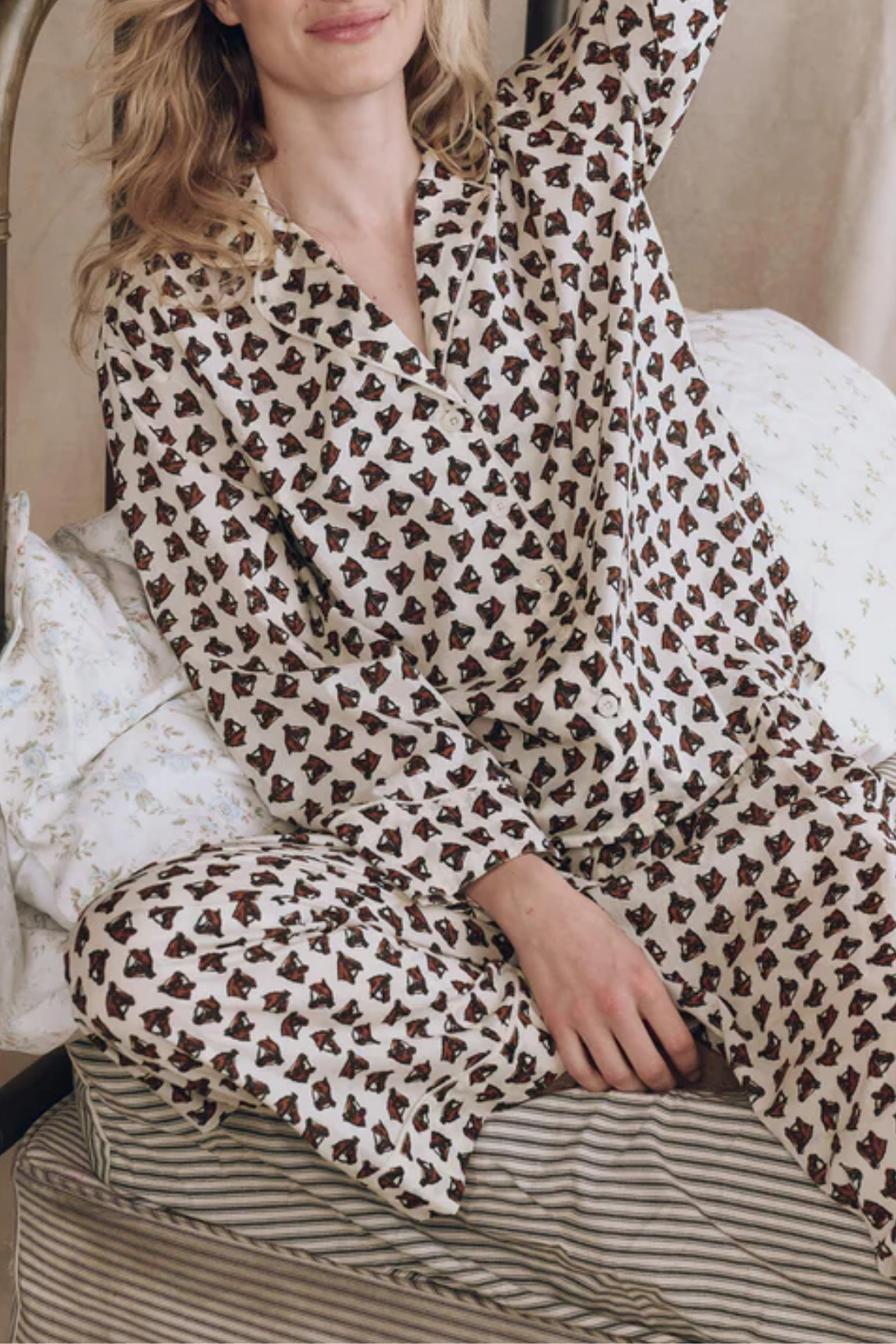 Made for cozy moments at home, The Pajama Shirt references men’s vintage pajama tops that we’ve always loved to borrow. Roomy and drapey, it features an open neckline, button front, and nostalgic sleepwear details. Made from printed cotton and trimmed with piping.