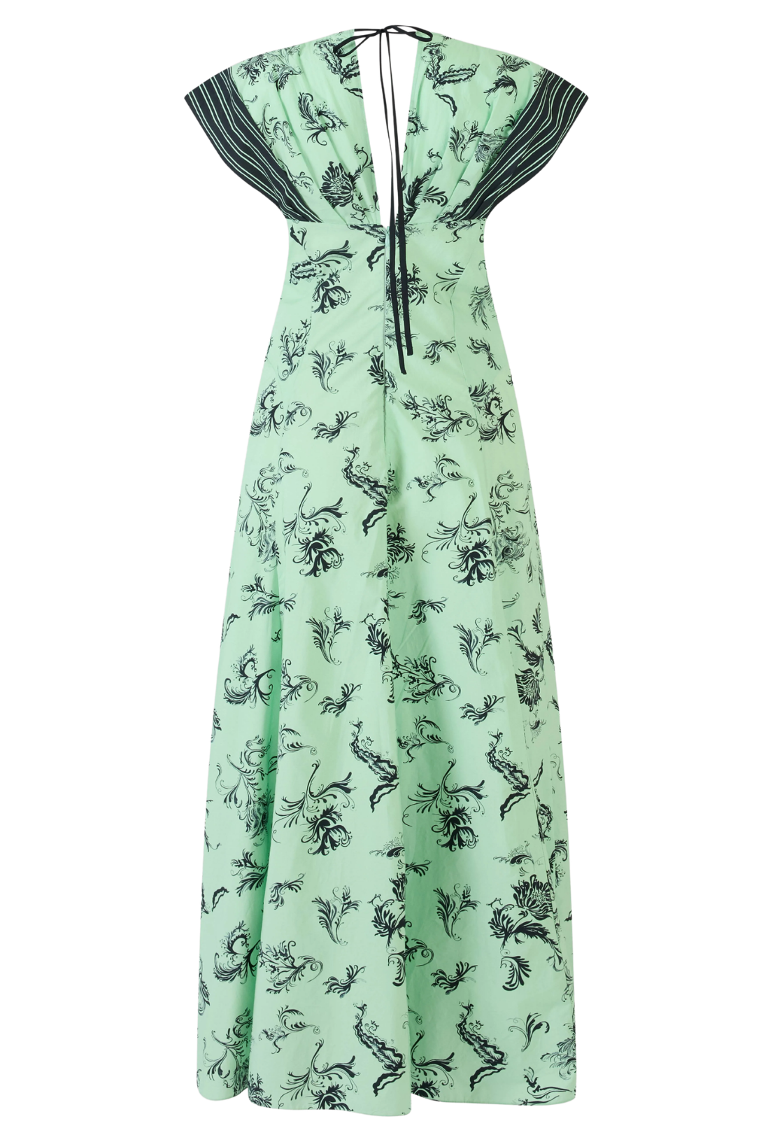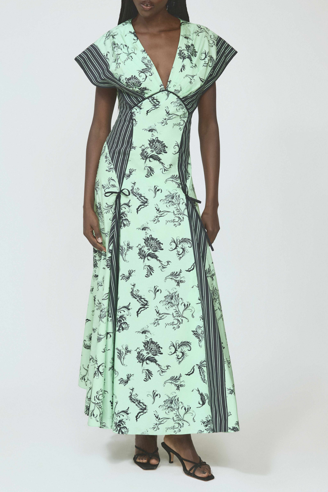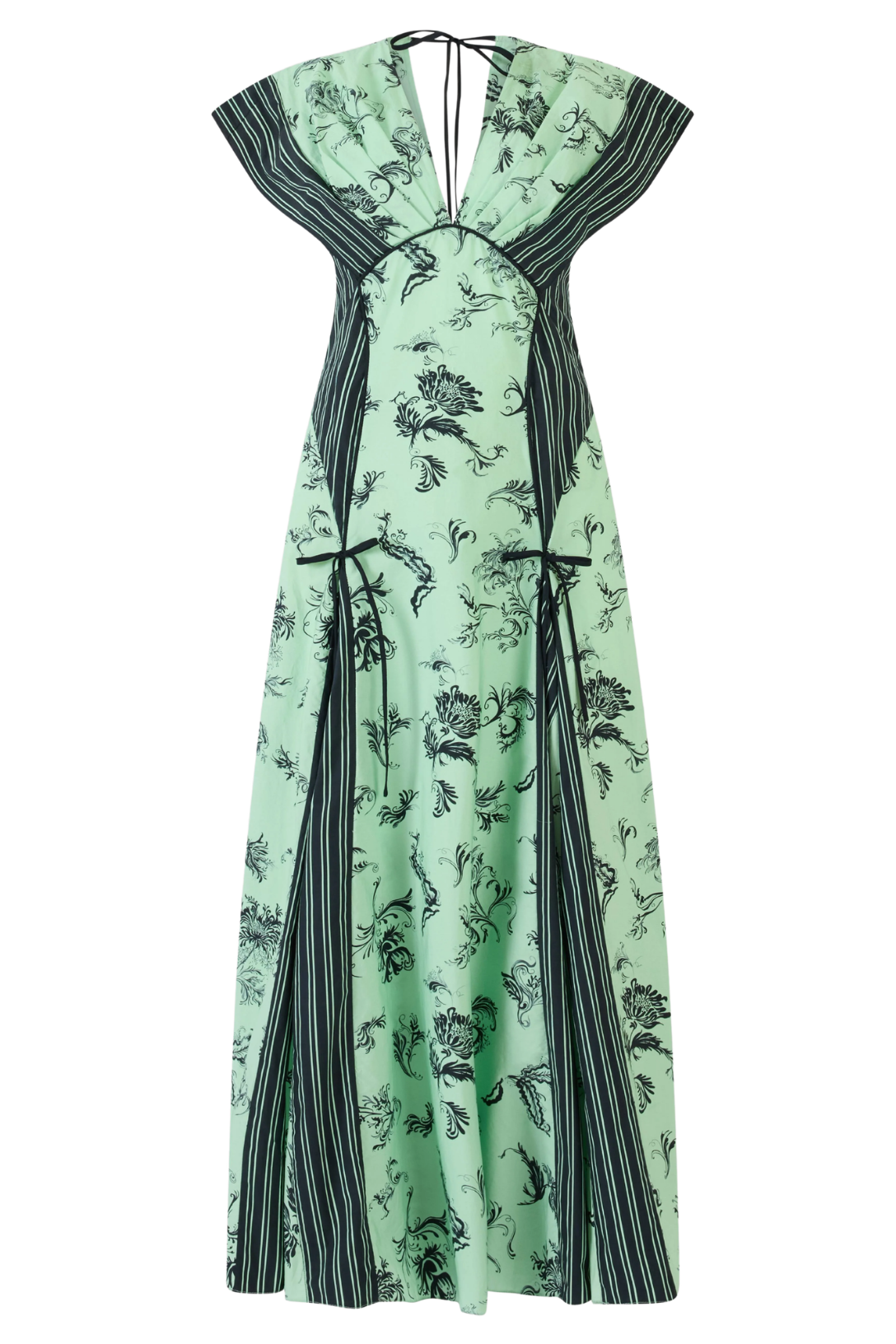 A fluid V-neck dress in tossed floral cotton poplin, cut with contrast striped panels for graphic movement. Softly shaped through the waist with adjustable side bows, it balances ease and structure in one effortless silhouette.