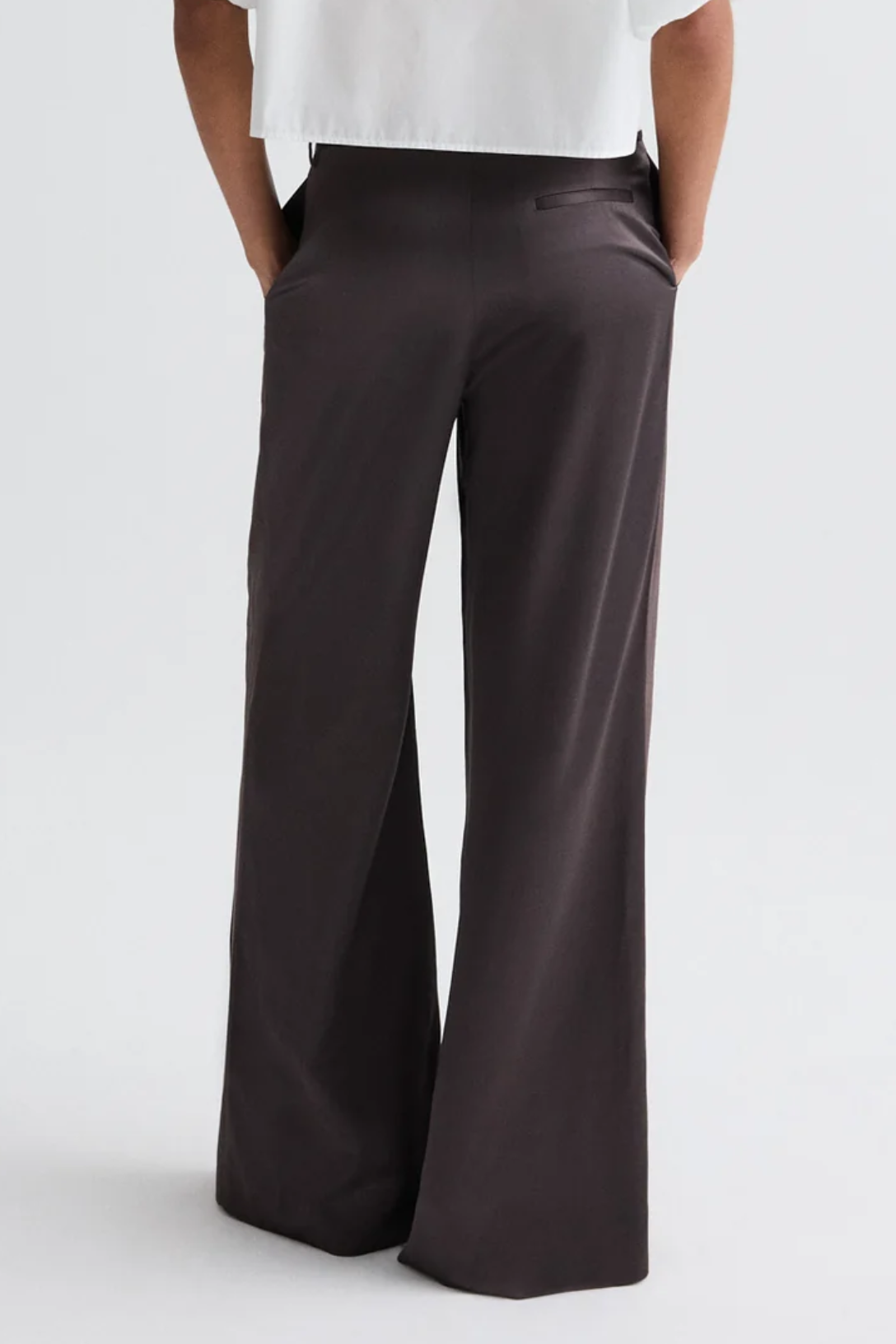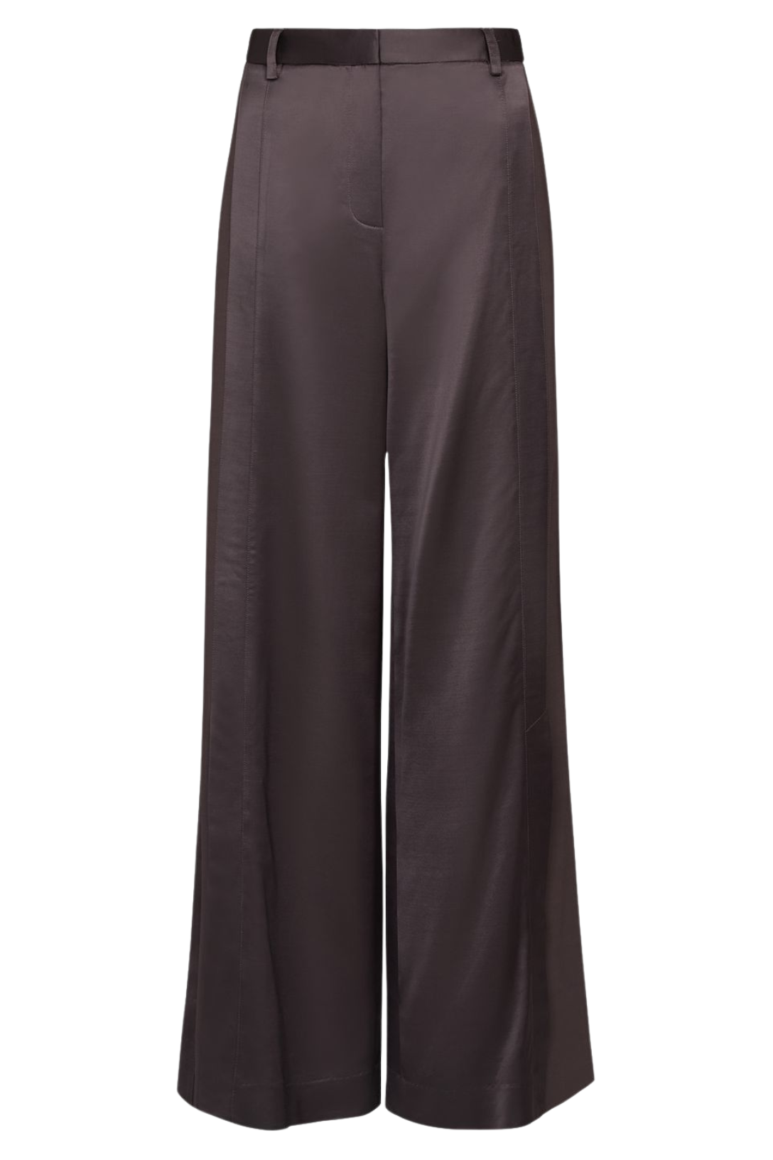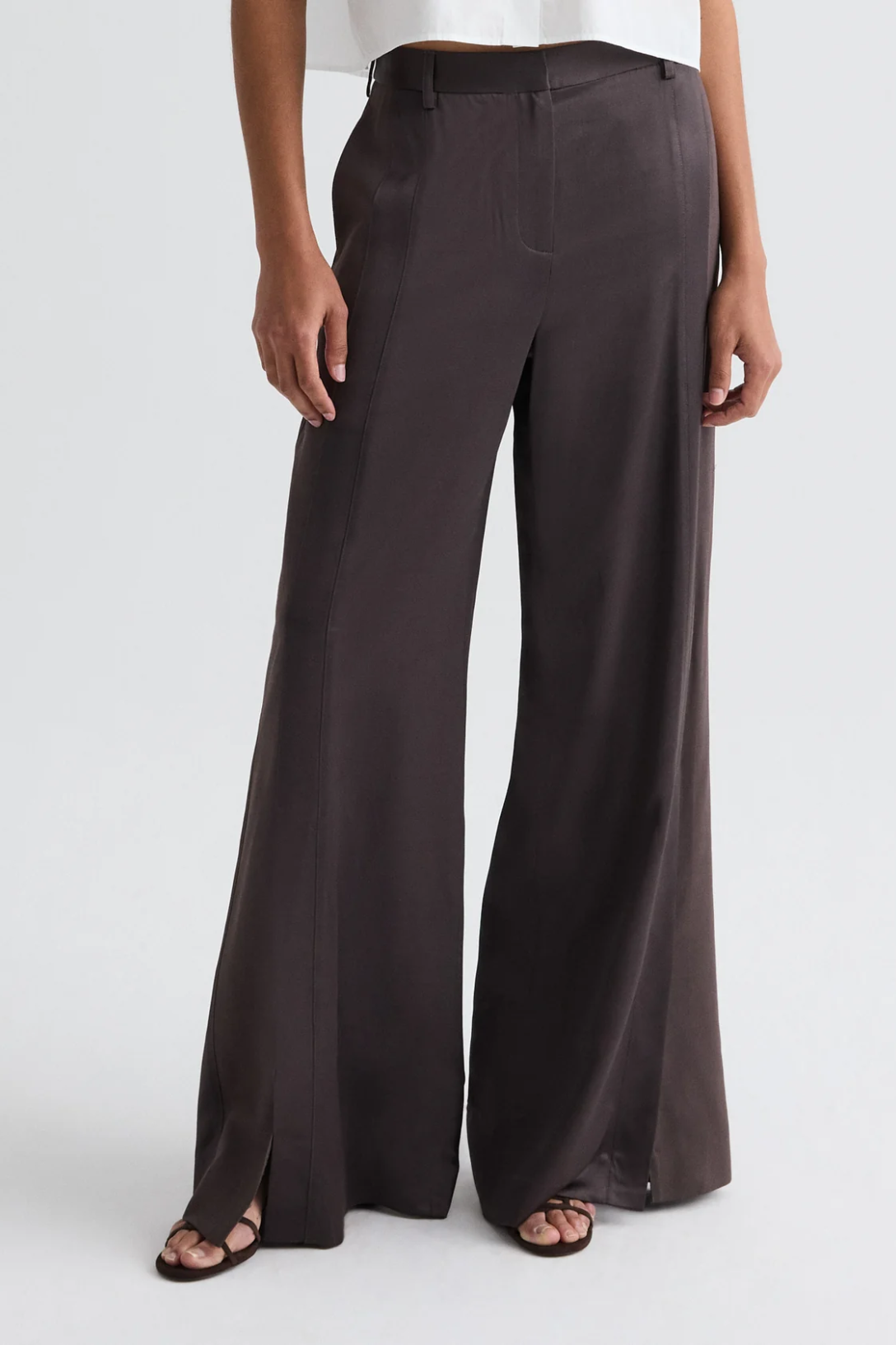 High rise, wide leg pants in shiny viscose wool satin. Fabric is viscose wool satin with a lustrous finish and soft, structured drape. The Taite Pant is a fluid silhouette with pressed front creases and satin tuxedo side stripes. Designed with front slits at the hem for movement. Complete with belt loops, side pockets, back welt pockets, and a concealed zip and hook closure.