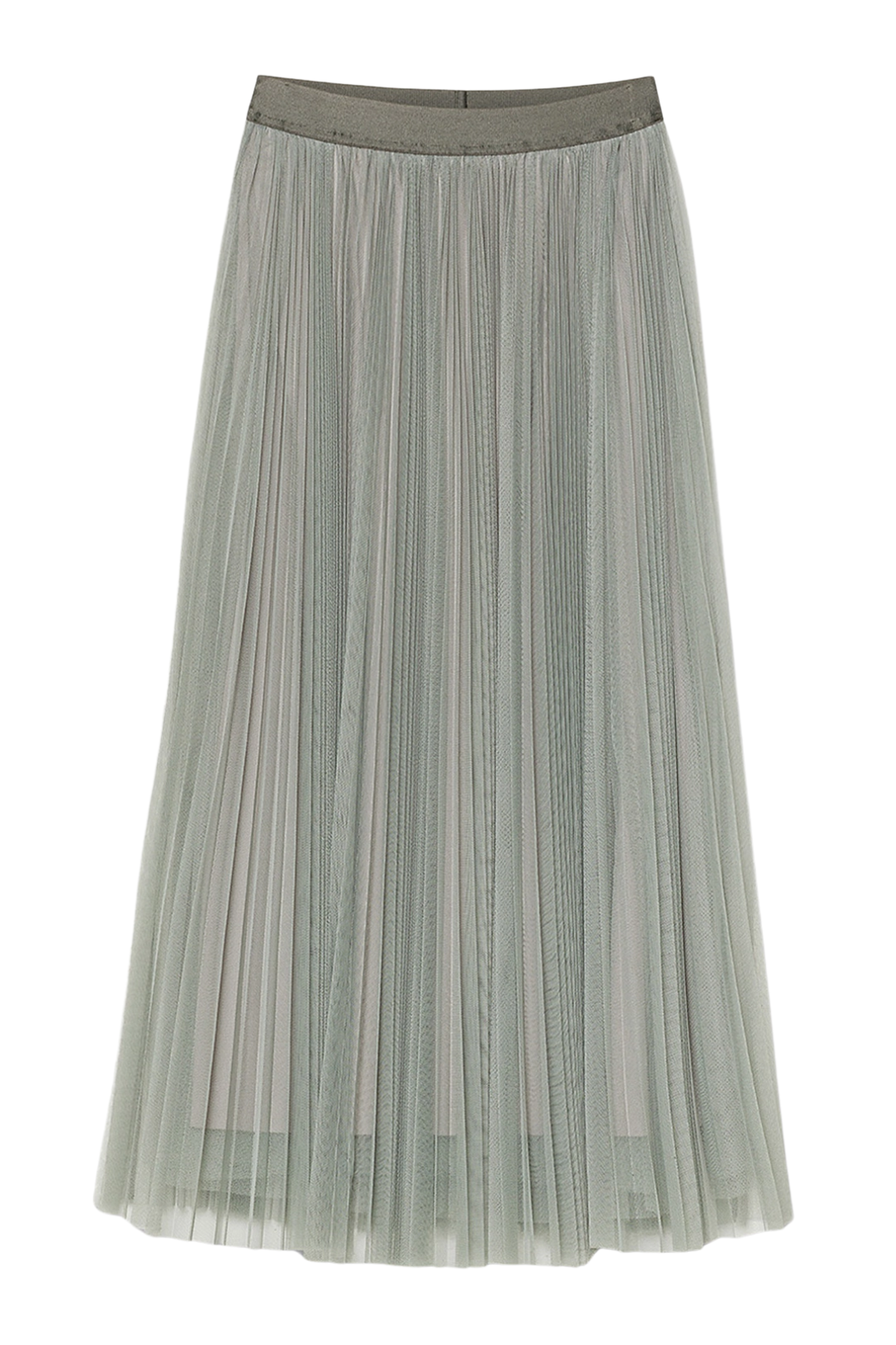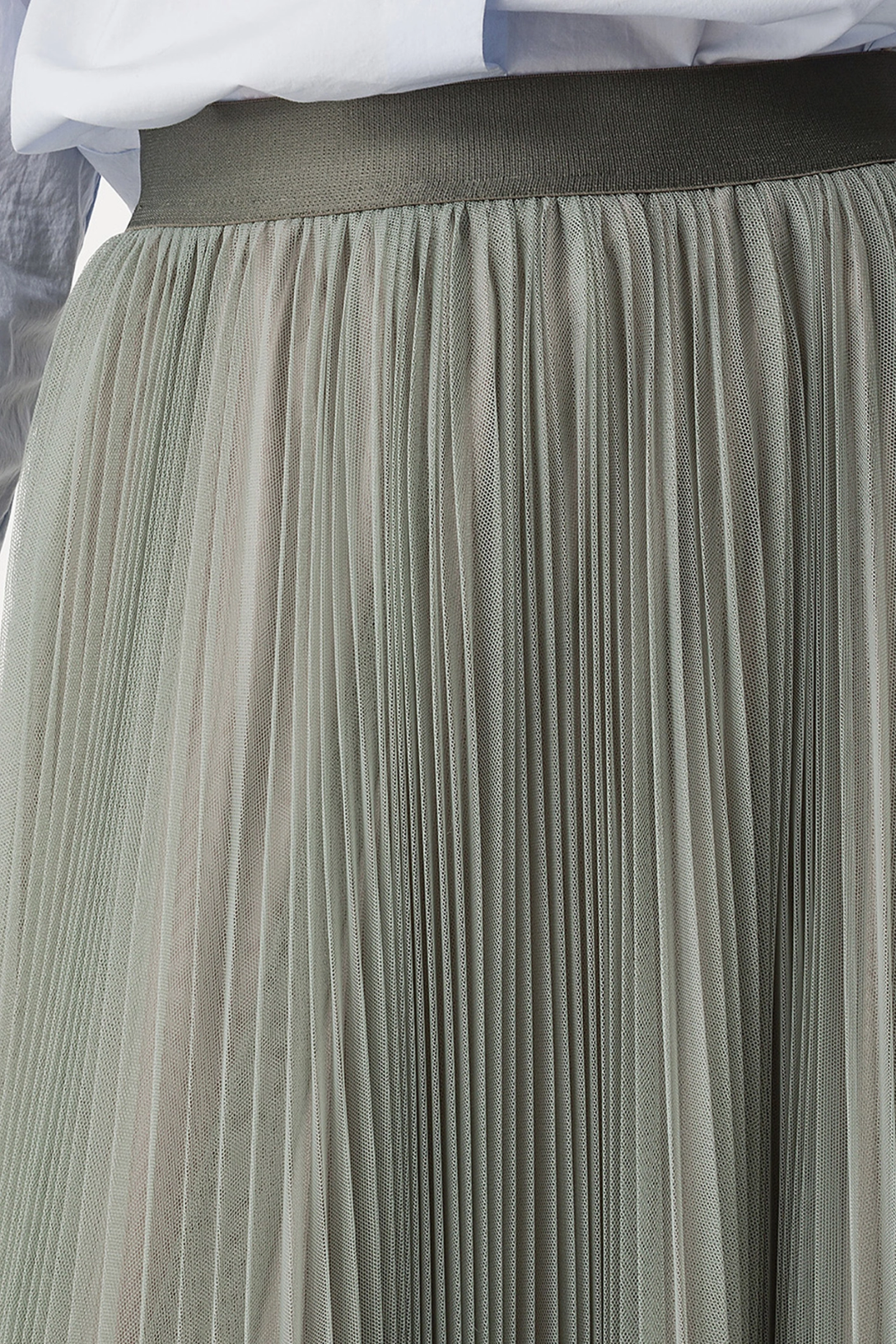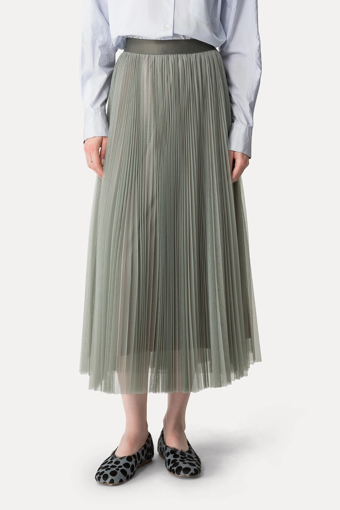 Diaphanous delicacy and gentle feminine flair are the defining characteristics of the tulle skirt with sunray pleating doused in the subtle shades of the season. Completed with an elasticated waistband, it has a double fabric layer and lined interior that create a romantic swishy swirl.