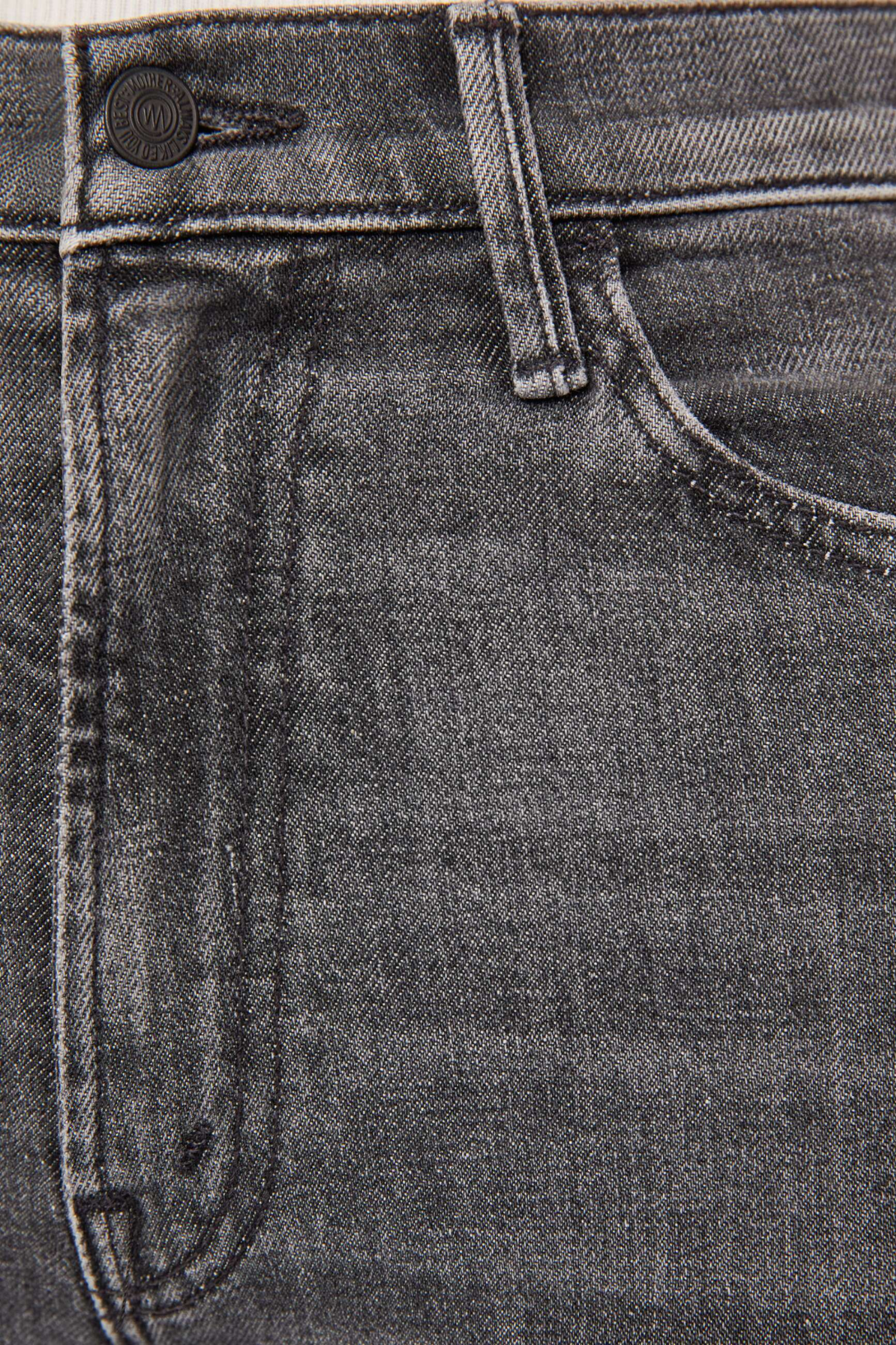 Playing the field. This high-rise flare has an 28.25-inch inseam and a clean hem. Made from denim with a touch of stretch, Under The Bleachers is a dark grey with whiskering and fading at the knees.