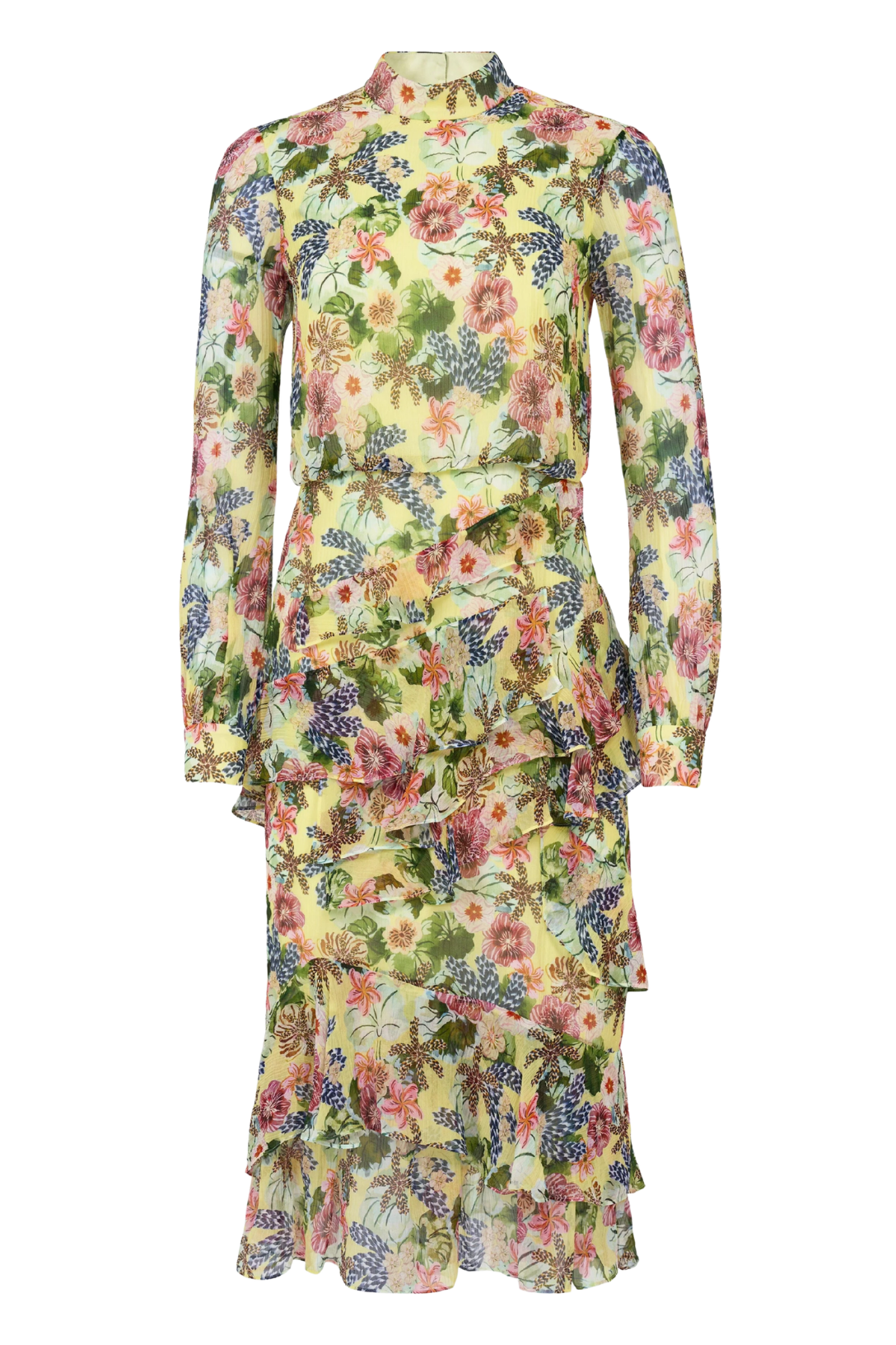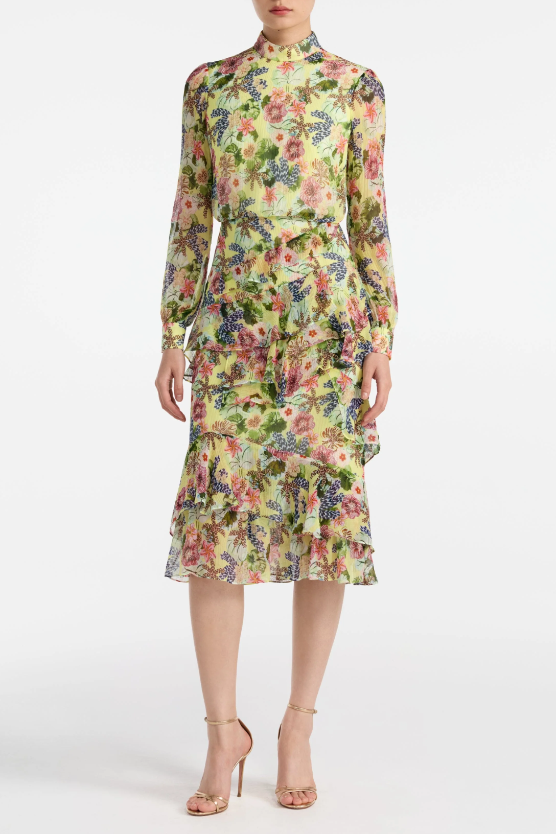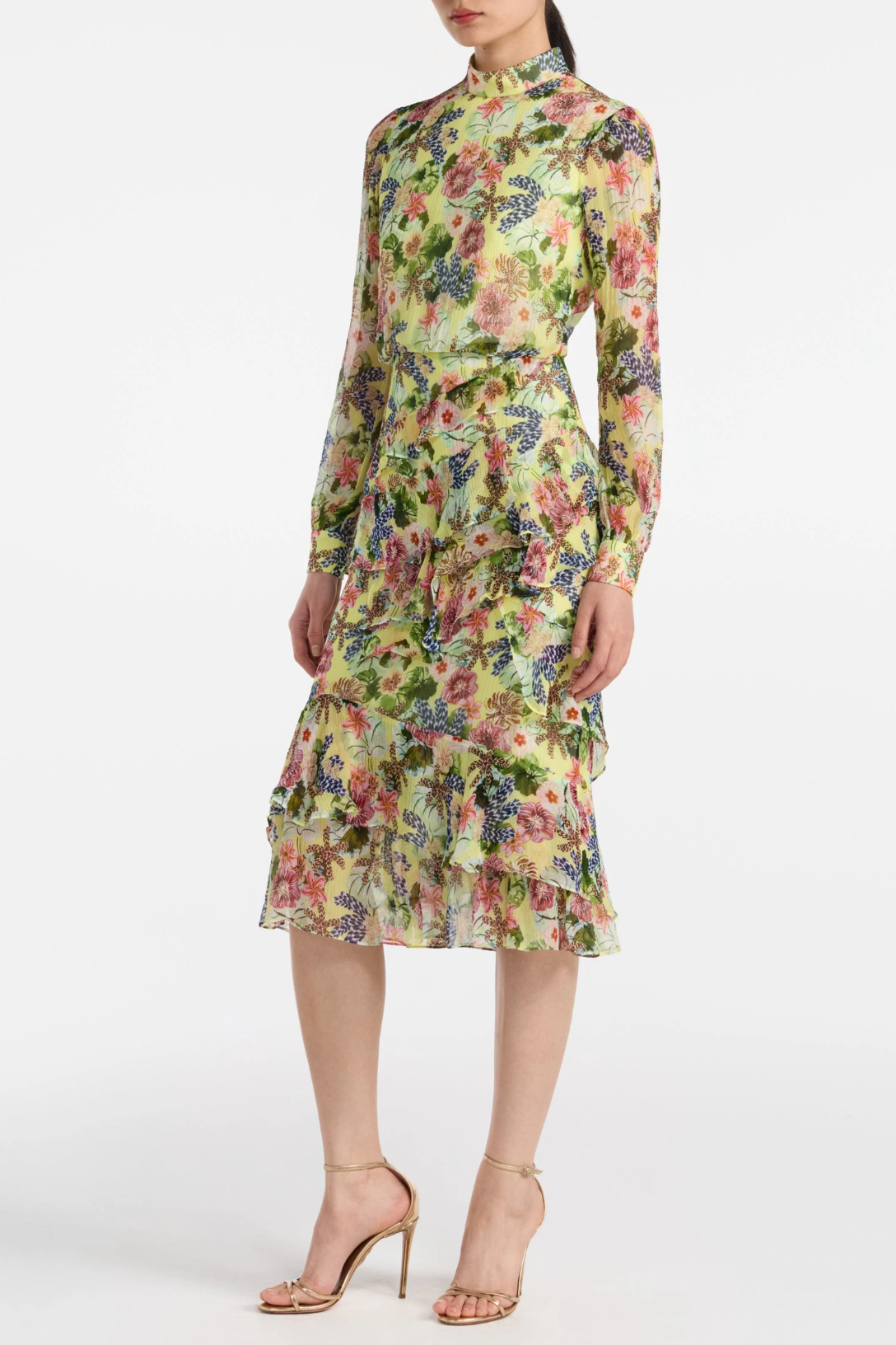 A signature SALONI shape, the Isa Ruffle Dress returns this season in the vibrant Plumeria Lemon print. Its asymmetrical frill spirals around the skirt and hem, adding a playful sense of movement with every step. Covered in all-over plumeria motifs atop a fresh lemon base, it perfectly balances joy, femininity, and ease.
