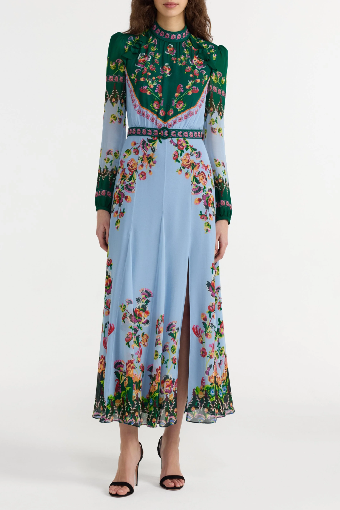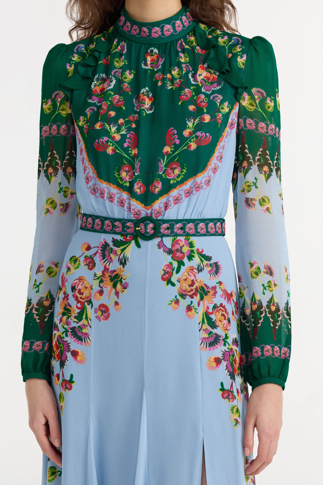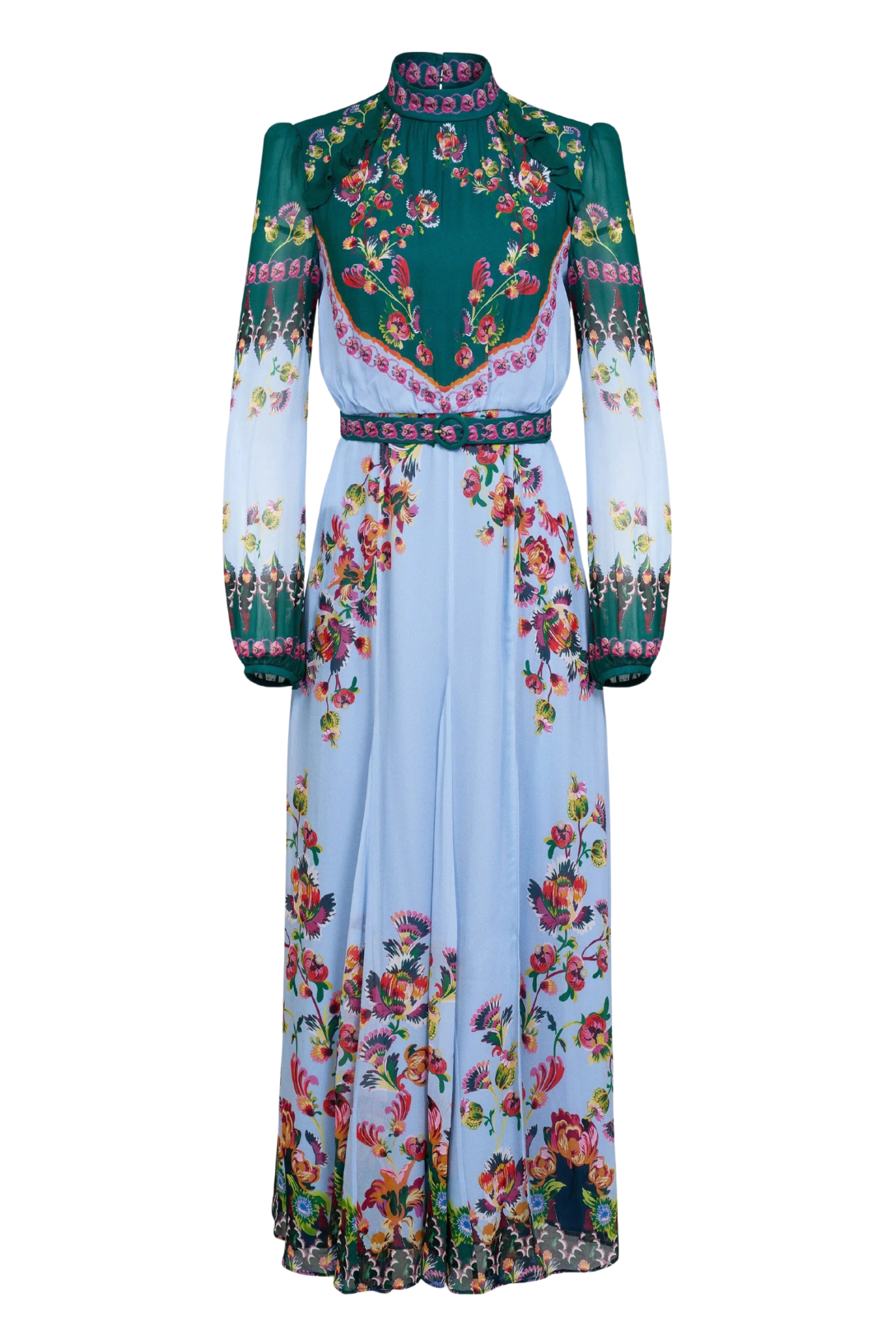 The Jacqui-B Dress combines elegance with intense glamour. It features a decorative high collar and a matching belt, which accentuate the fitted waist. Contrasting wine green and pale blue, accented with tumbling floral sprays and curlicue godets, add bold emphasis to the elegant SHAPE. A timeless and unique statement piece for day or evening occasions.
