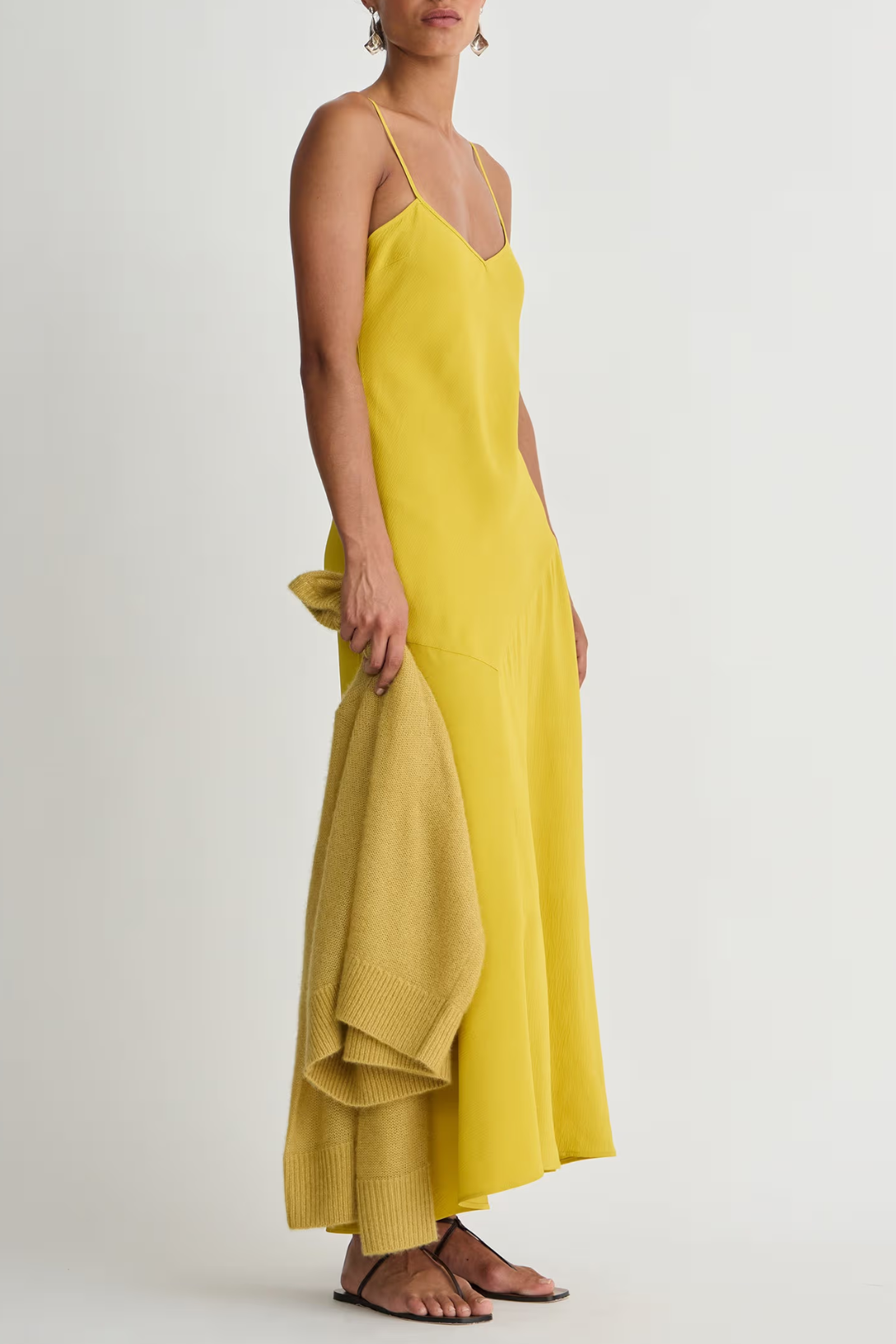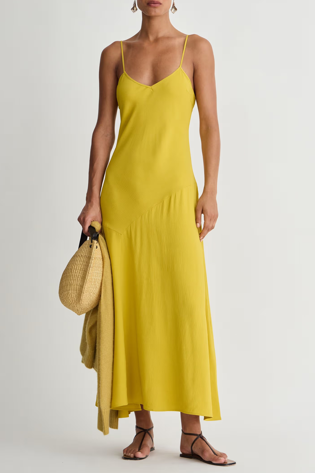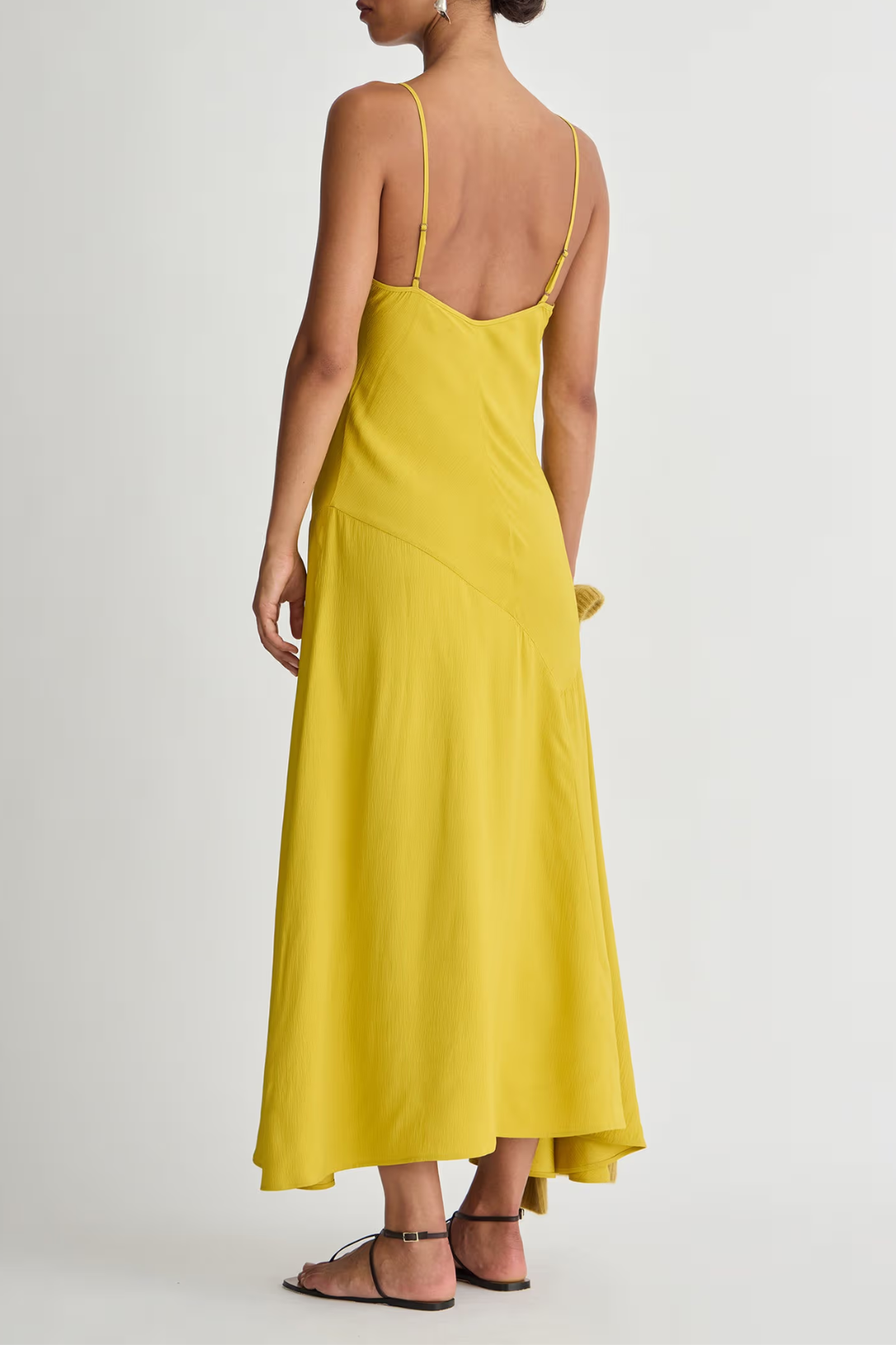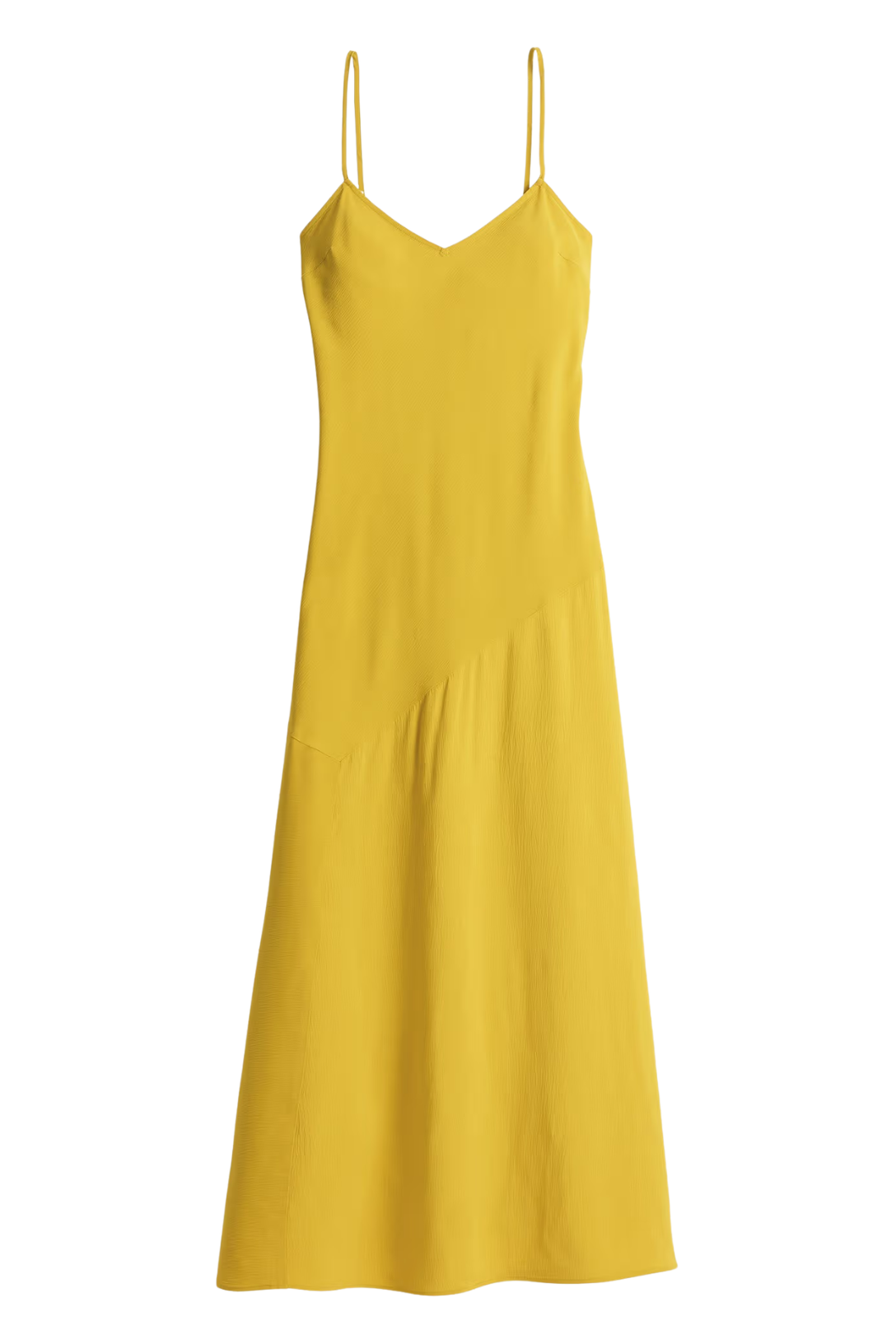 - Fit and flare slip dress, V-neckline, adjustable straps, midi length, asymmetrical hem