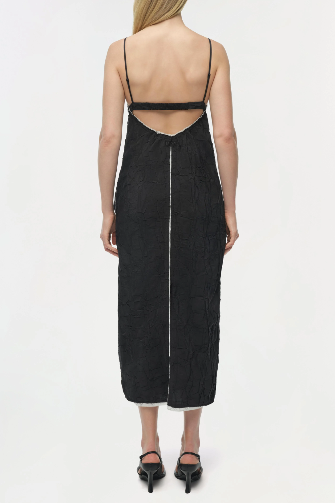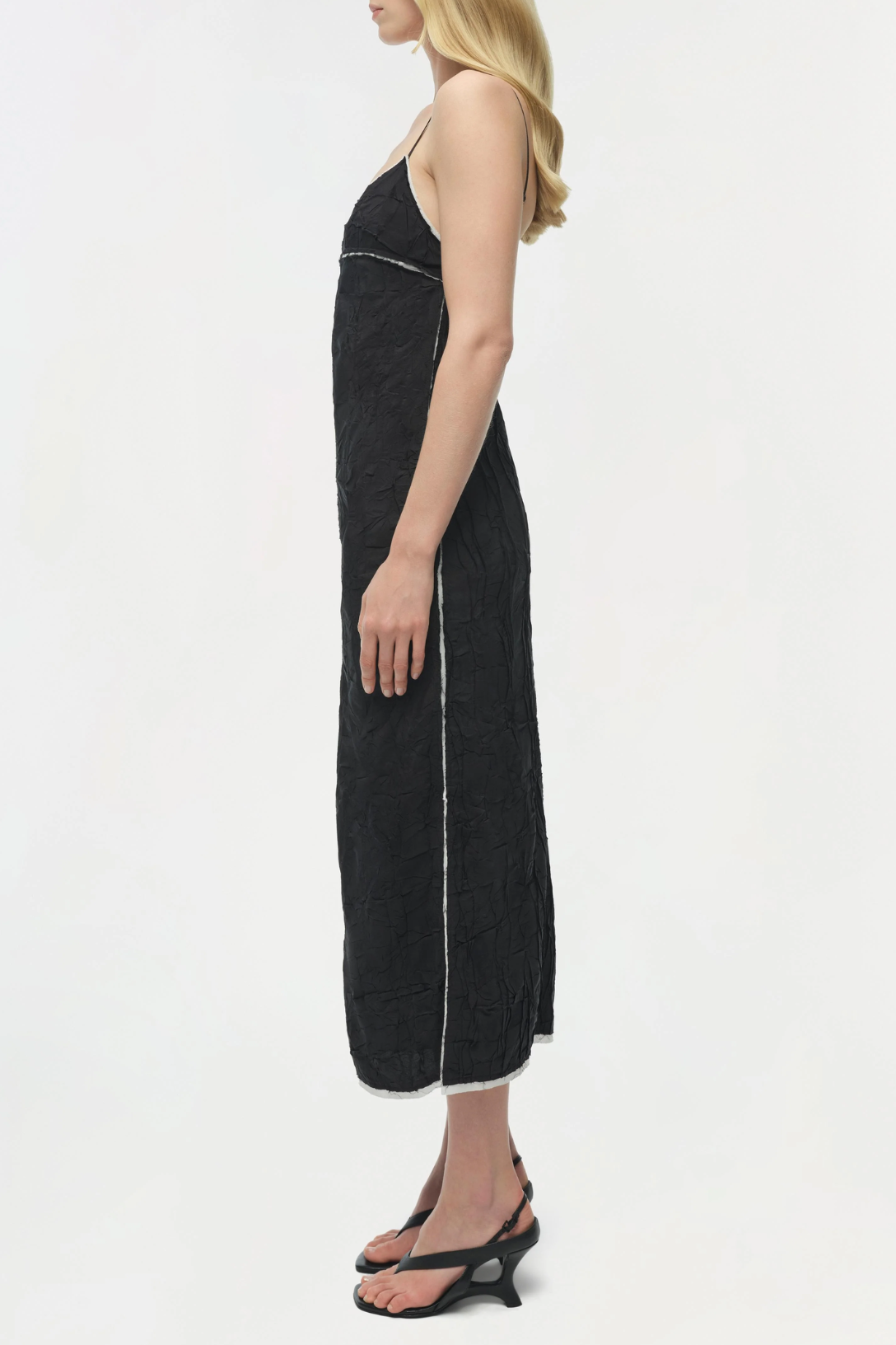 The Leah Midi Dress in Black Multi. Effortless and refined, this midi dress features a soft wave texture cotton-blend construction. A gentle sweetheart neckline and structured seams create a streamlined, flattering shape.