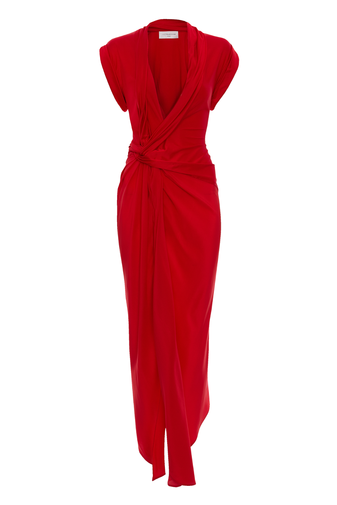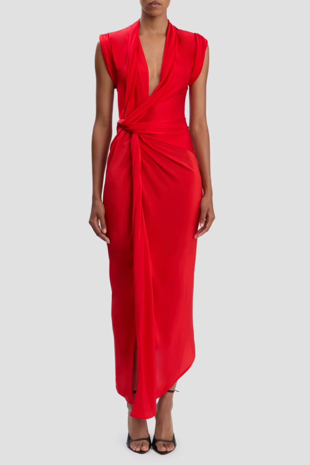Tactile talking points, including a short sleeve with rolled hem, twisted drape neckline and high-shine bodice, bring a subtle sensuality to the Twist Dress. Presented in confident Cardinal Red, it has a wrap-front neckline with button closure, front skirt split and directional asymmetric hemline.