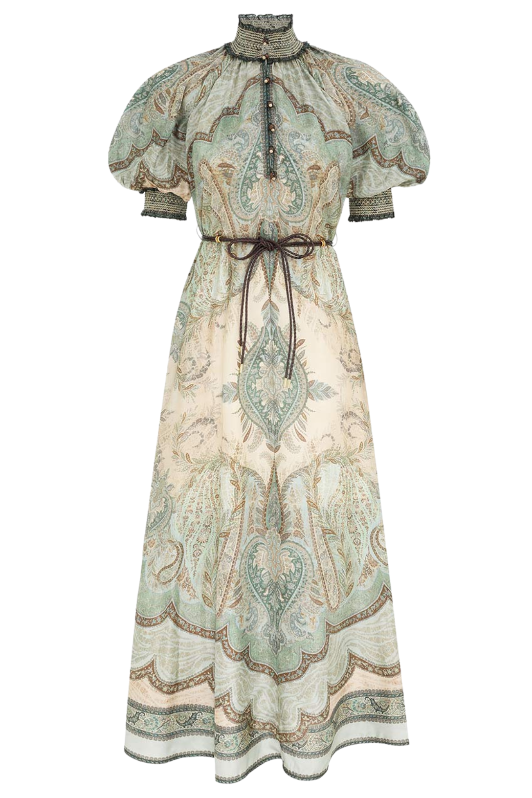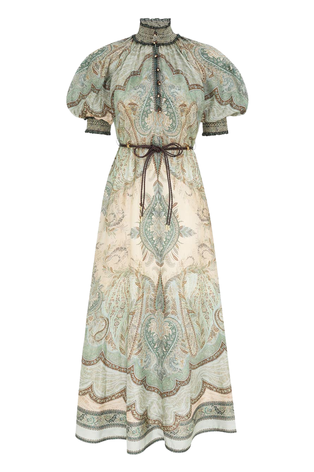 The Wanderlust Billow Dress in Tapestry Teal Multi from Zimmermann's Resort Swim 2026 Collection. A silk maxi dress featuring a shirred stand collar, short billowed sleeves, finished with functional side pockets and frill trim.