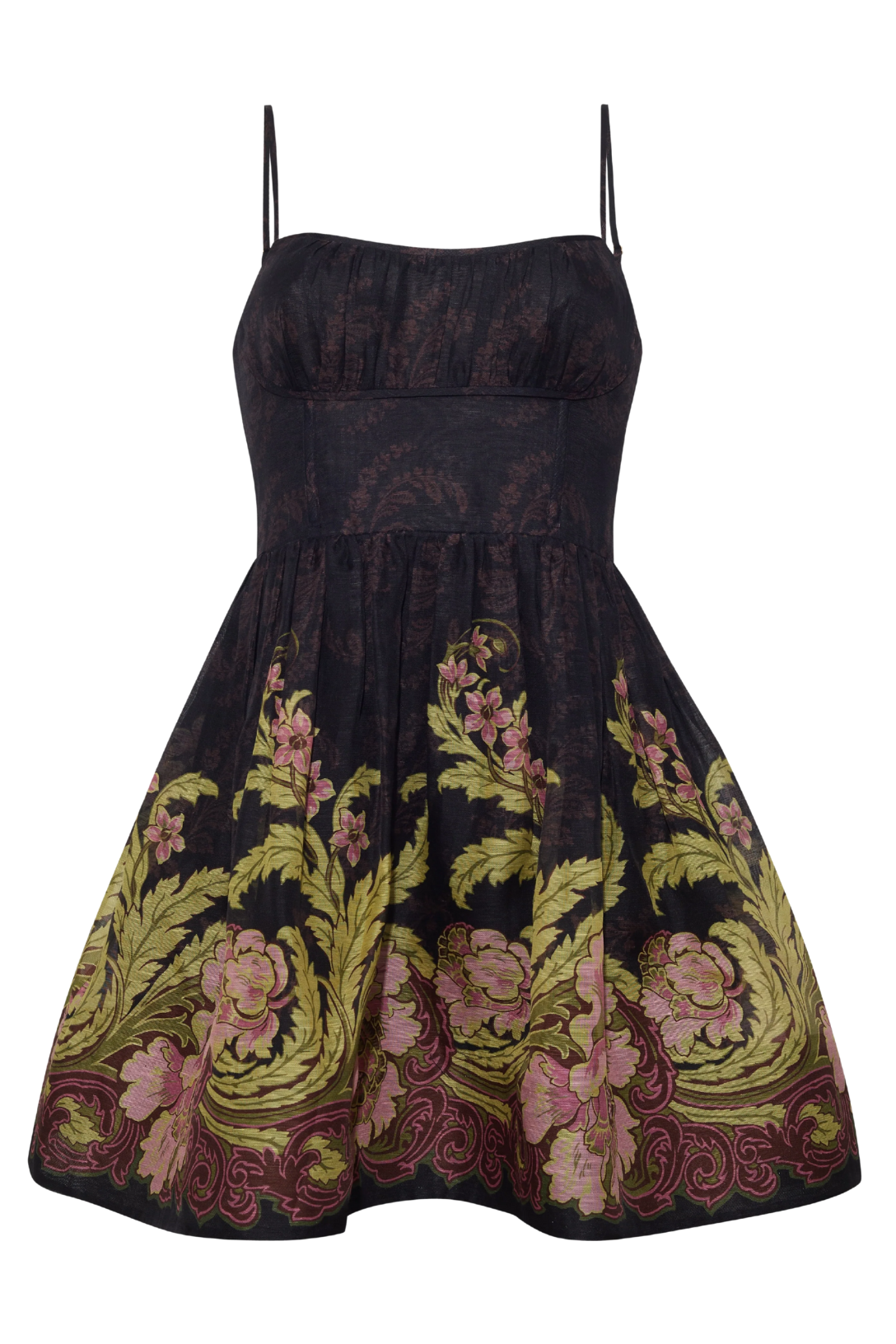 Mini length fit-and-flare dress with spaghetti straps and ruched bodice.