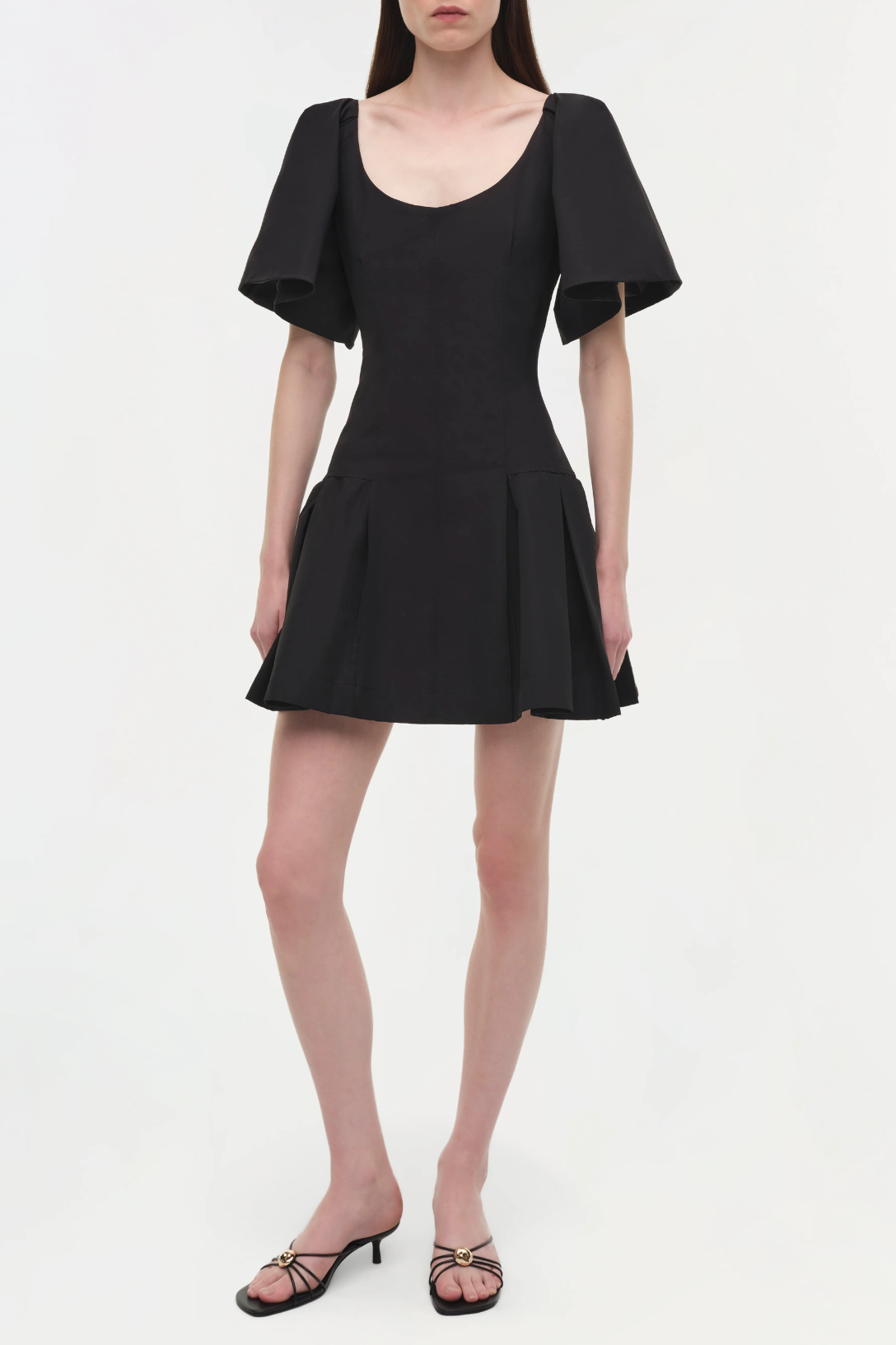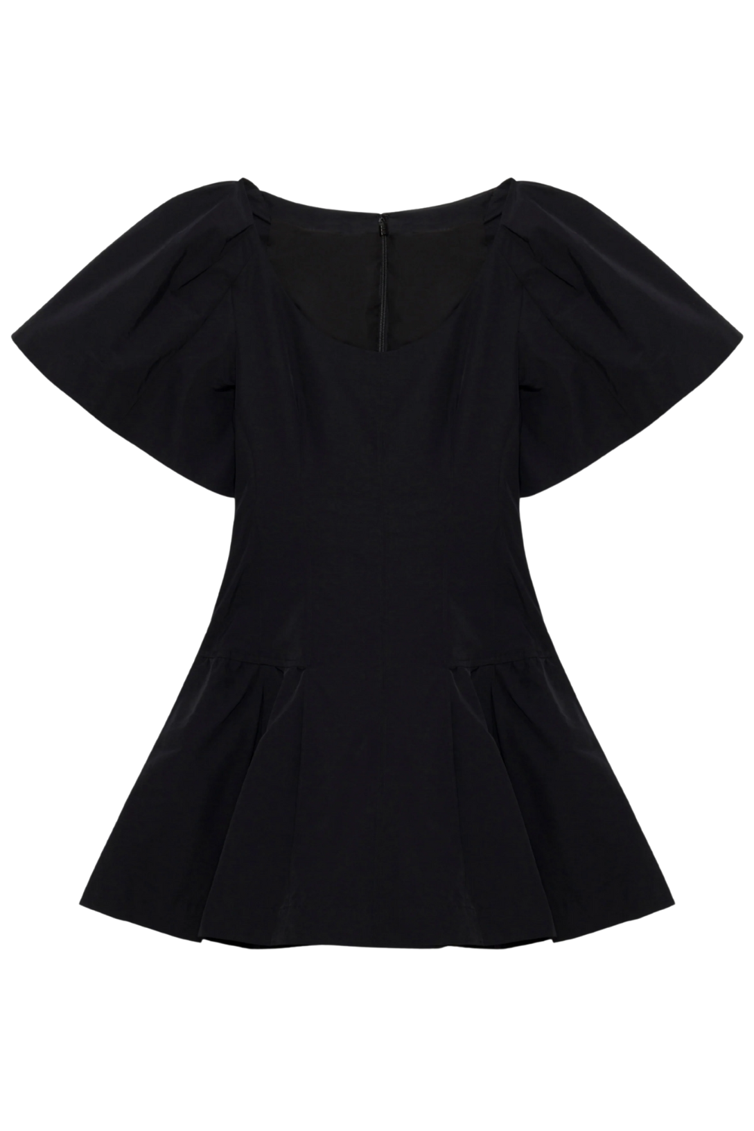 The Hattie Cotton Faille Mini Dress in Black. Crafted in structured tech cotton, this mini dress features precise seaming through the bodice and a softly flared skirt. Voluminous sleeves lend movement to its clean, architectural shape. A modern silhouette defined by ease and form.