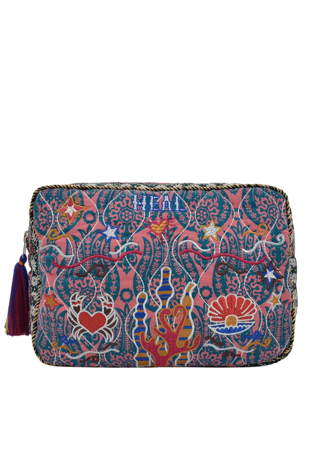 Cotton zipped pouch, quilted, embroidered front and back.