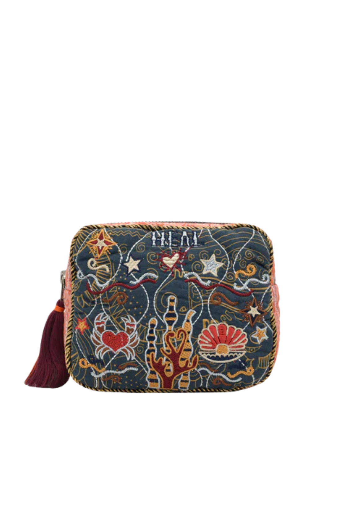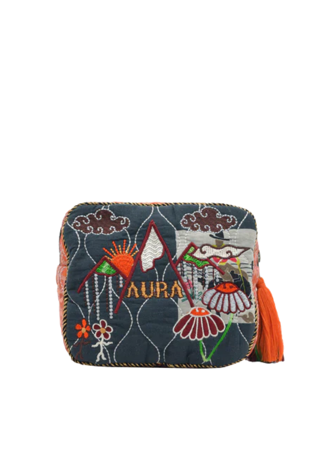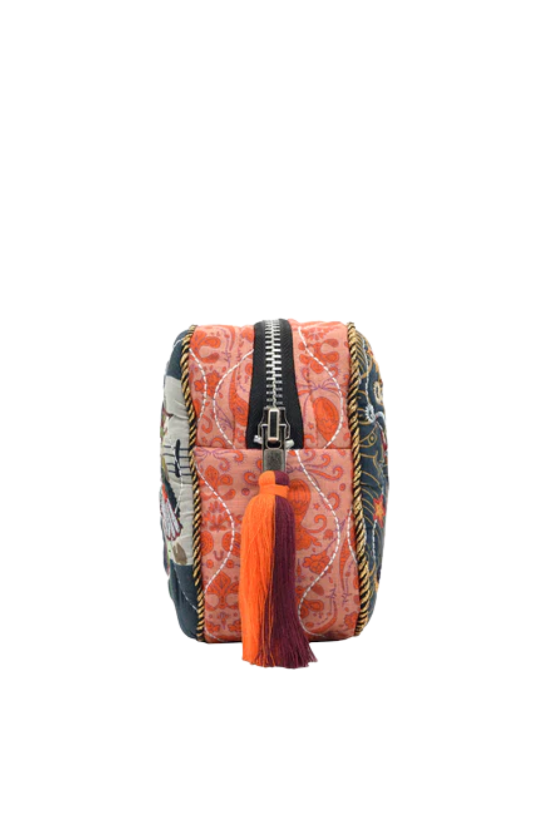 Quilted printed cotton pouch with intricate embroidery on both sides. Compact and stylish with soft grey panels and peach edges.