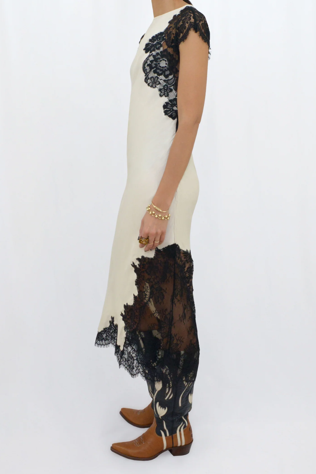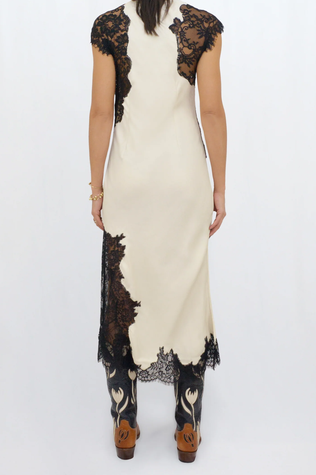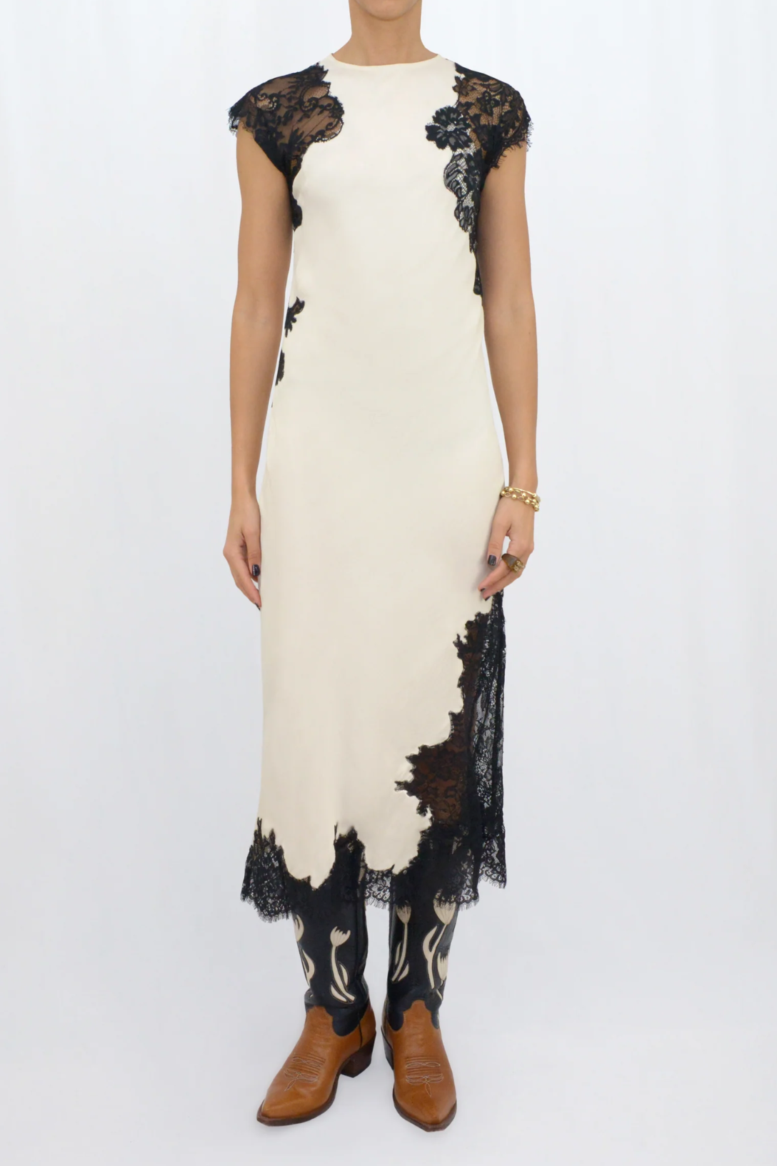 The Snow Dress is a sophisticated off white midi piece, featuring delicate black lace accents on the sleeves, hem, and sides. It includes a discreet side zipper for a seamless fit, perfect for making a statement at any special event.