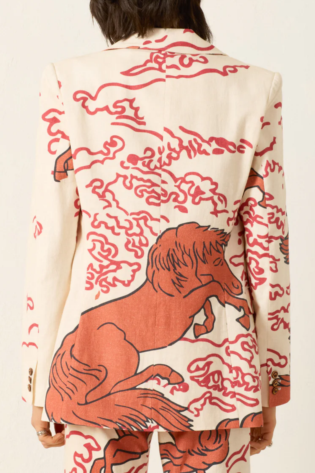 Cut from Khadi cotton, Alix of Bohemia's printed blazer is tailored with a notched lapel and subtle darts to structure the silhouette. It features a large-scale mythical horse motif and wooden buttons. Pair it with the matching Bunny Rouge Pegasus Jean.