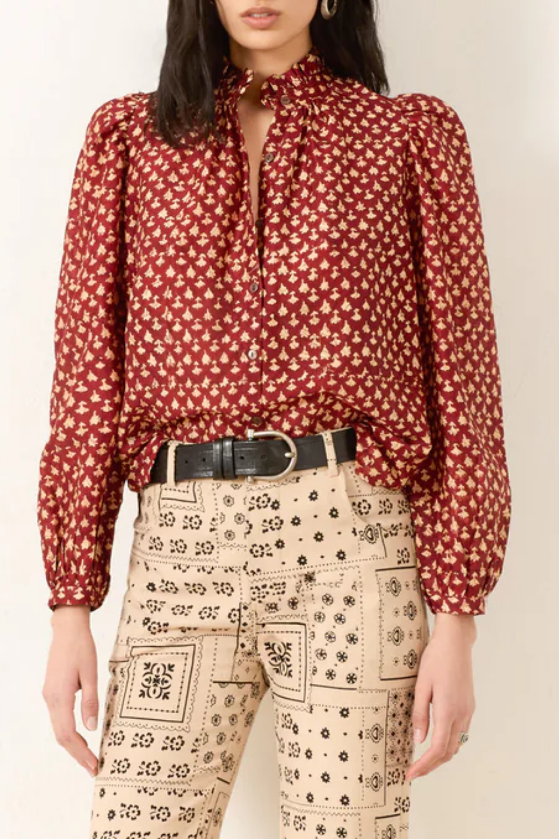 Inspired by a ’70s silhouette, the Annabel has puff shoulders and a feminine ruffled collar. The cotton-silk blend shirt is hand-block printed with a floral motif.