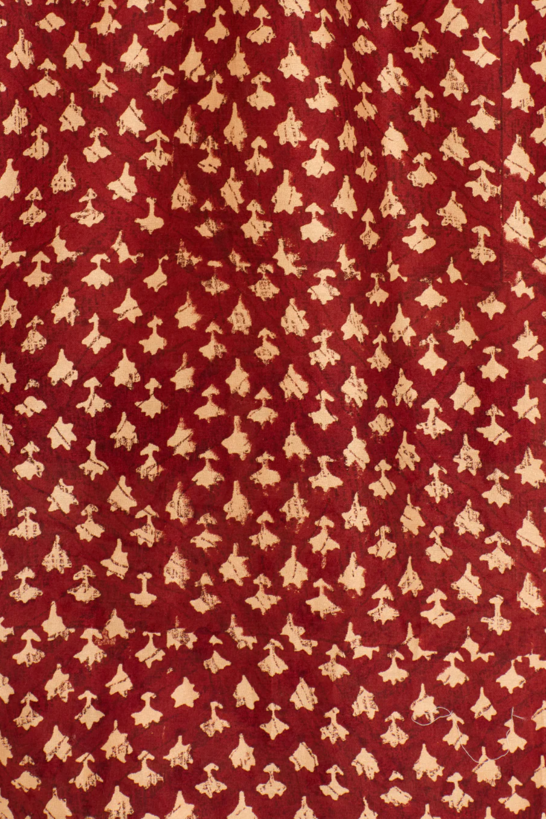This textile was block-printed by hand. Subtle printing and dye variations are part of the unique beauty of the garment and a signature of the artisan's hand.
