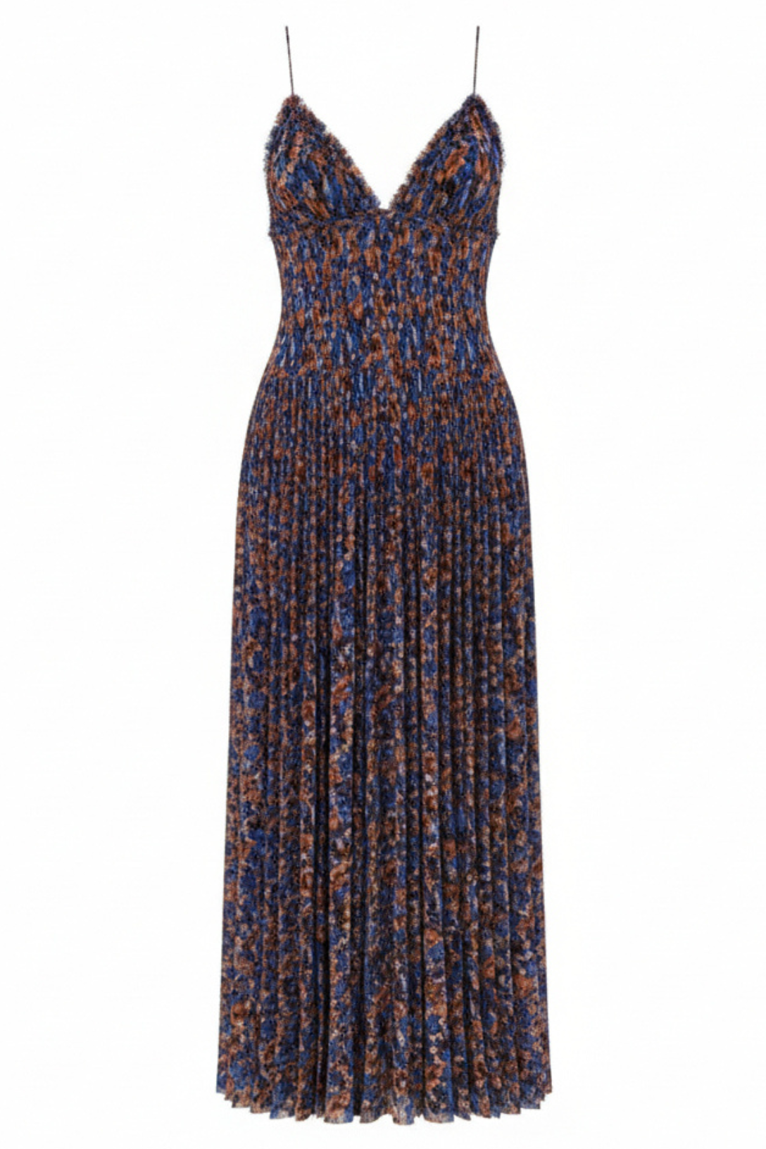 Billowing across the SS26 Runway in Look 49, the Atrani Gown is cut from crinkled chiffon with soft florals reminiscent of traditional pointillist artwork. With a sense of occasion, this gown has a plunging neckline with delicate ruffles and transforms into a gathered skirt with sweeping volume.