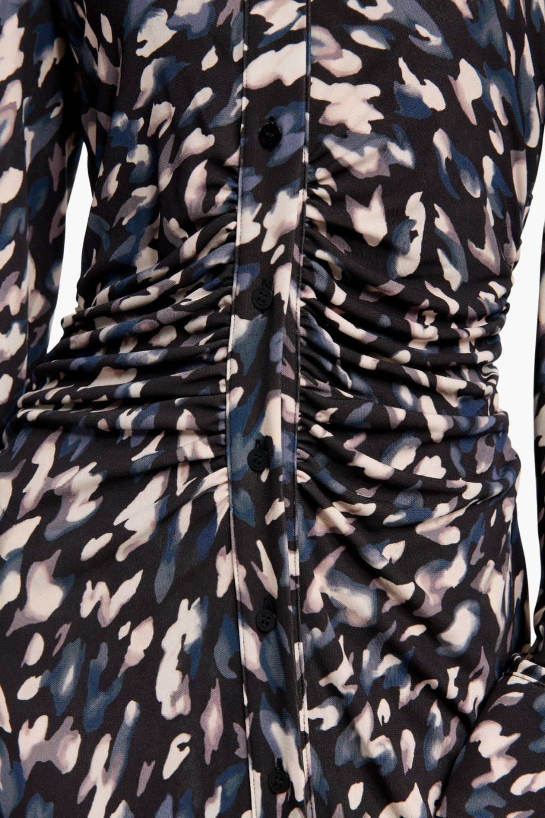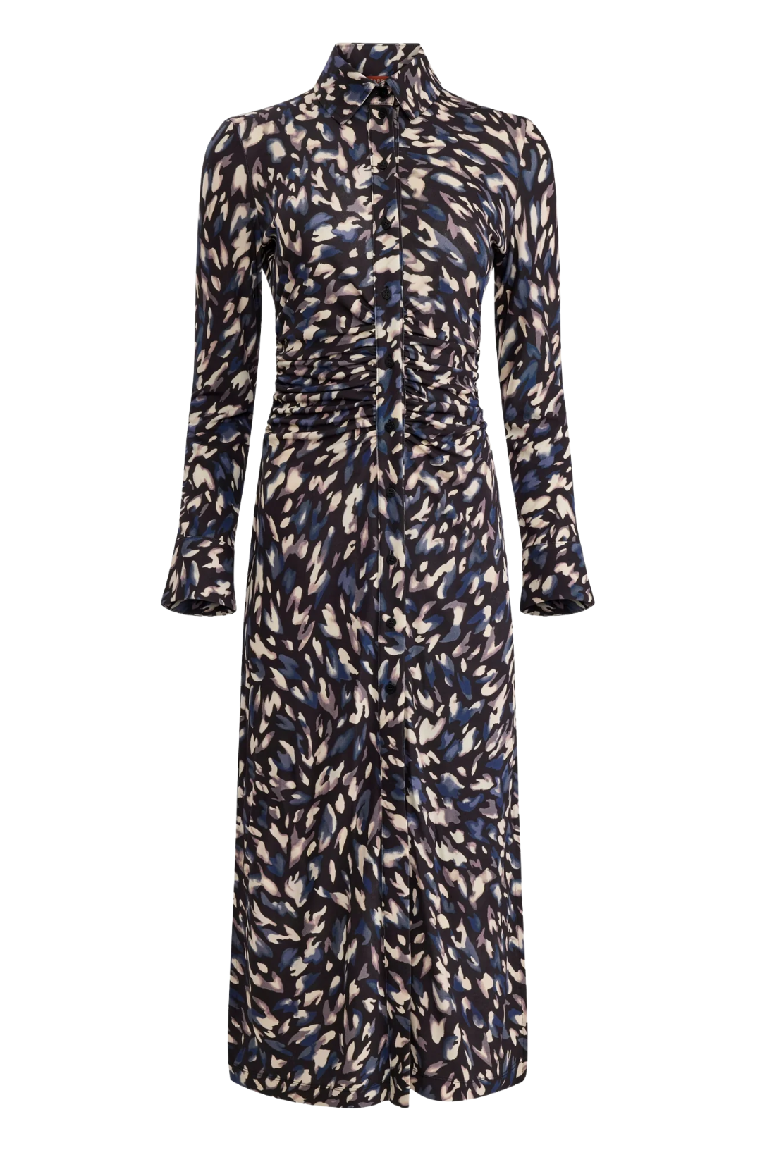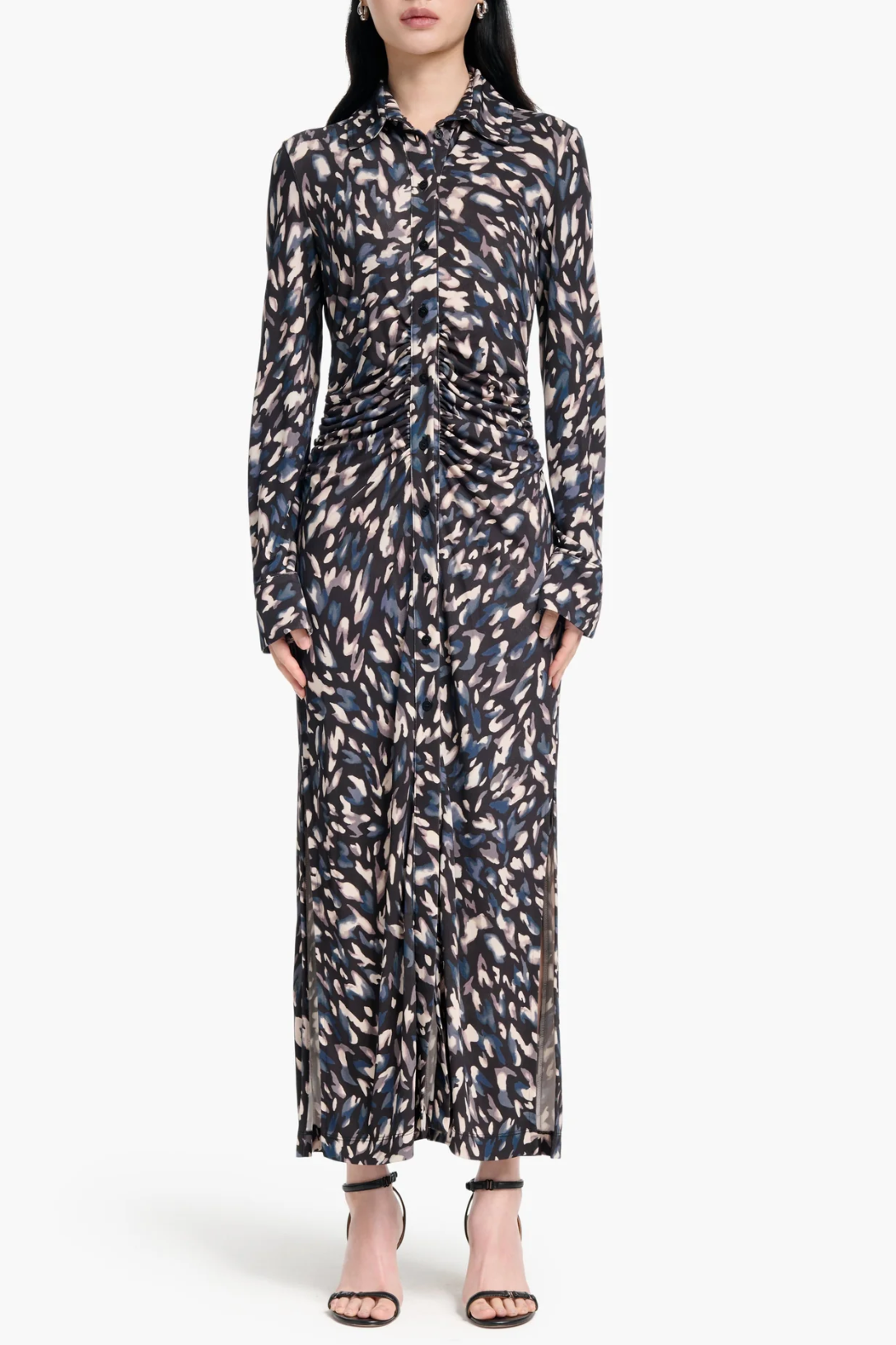The Claudia dress is designed with Altuzarra's signature abstract animal pattern. The shirt silhouette features a point collar, long sleeves, and a ruched waist, creating a flattering look.