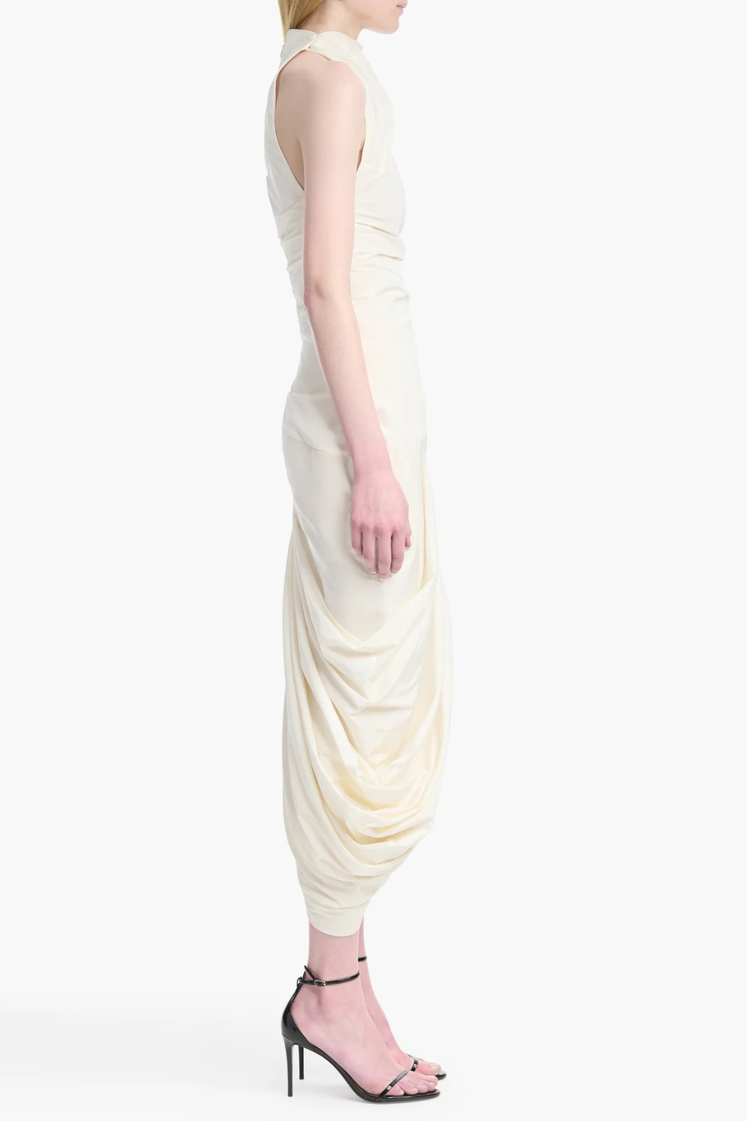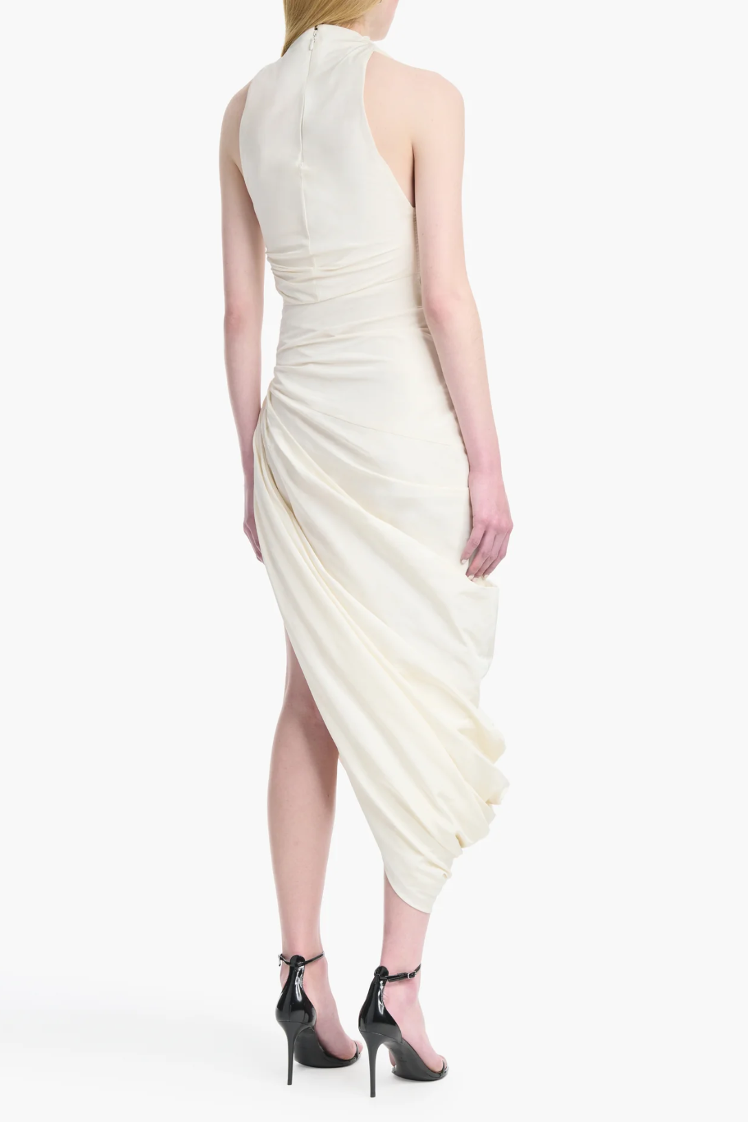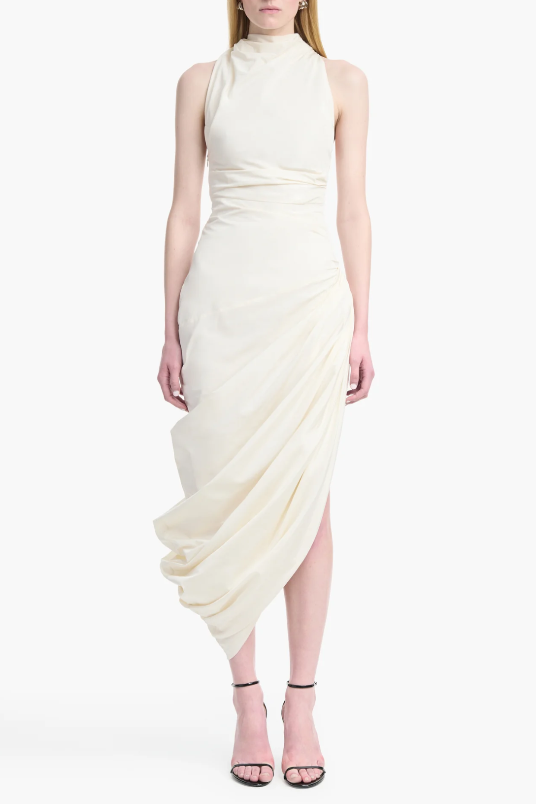 The Dora dress features a high neckline, a fitted bodice, and gathered detailing that creates soft draping throughout. The skirt falls with relaxed volume and includes a side slit for ease.