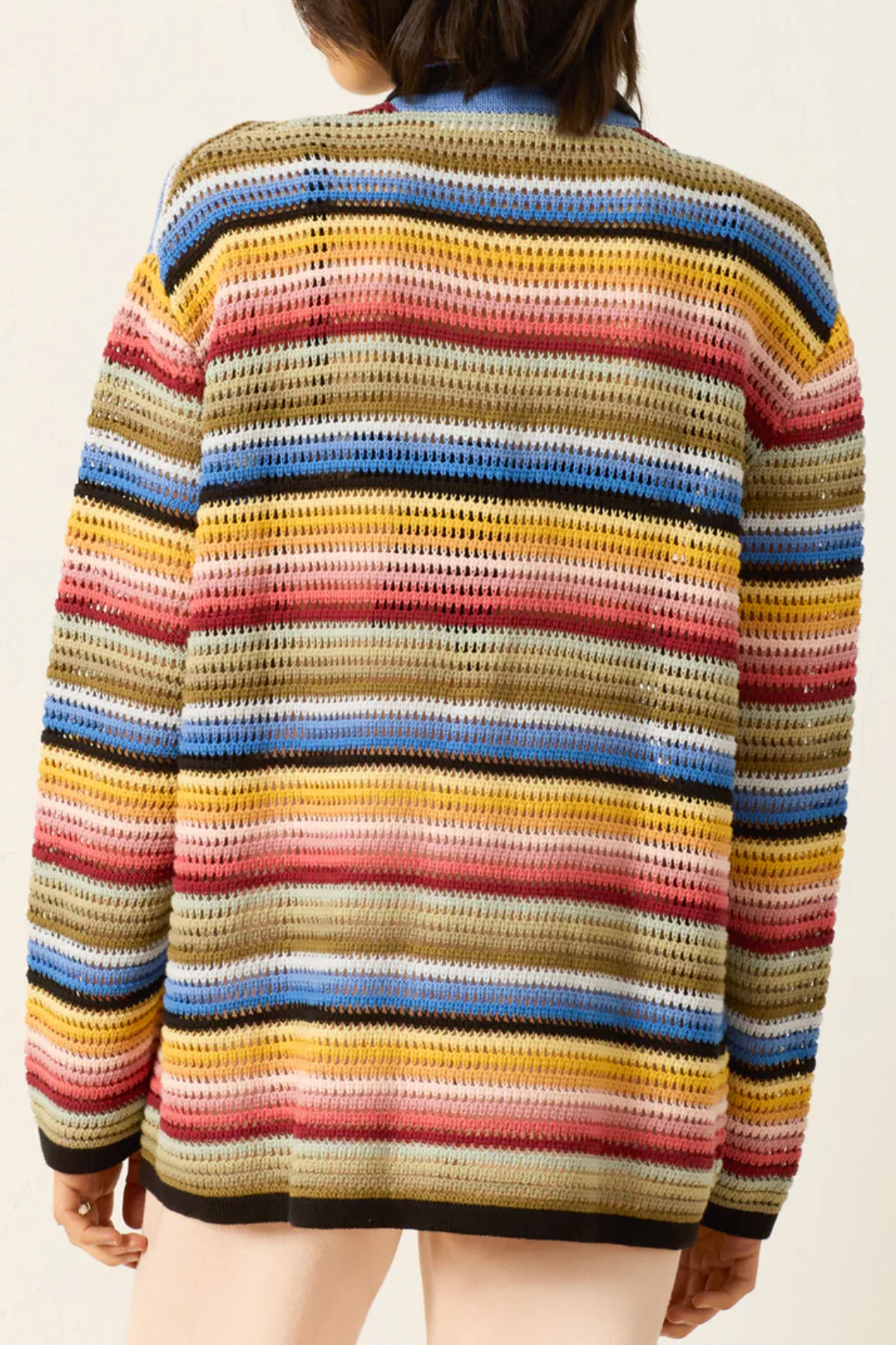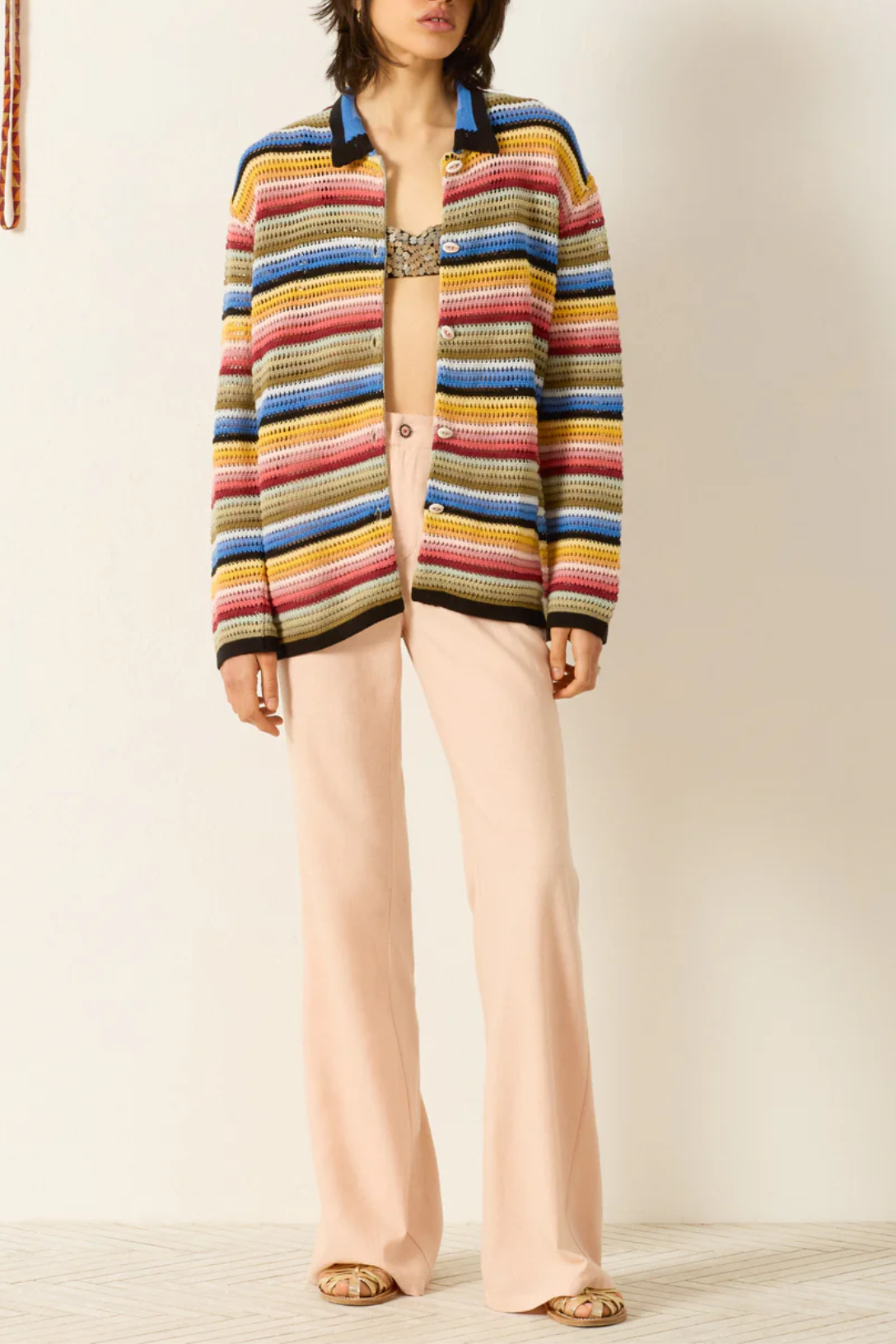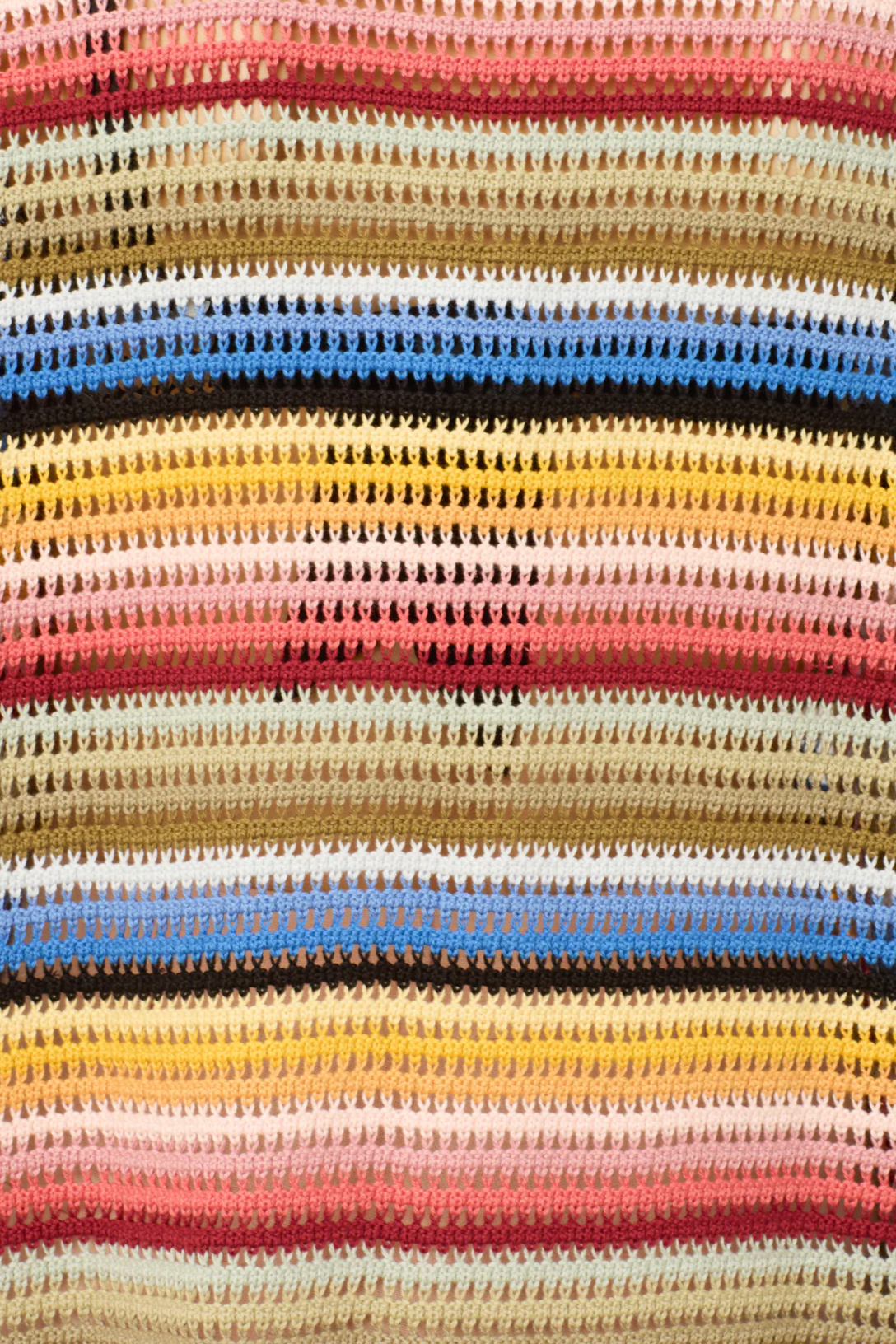Crocheted from cotton, Alix of Bohemia's open-knit shirt features rainbow stripes and handmade cowrie-shaped buttons by ceramist Daphné Verley. Cut for a relaxed fit, it channels a beachy ‘70s vibe.