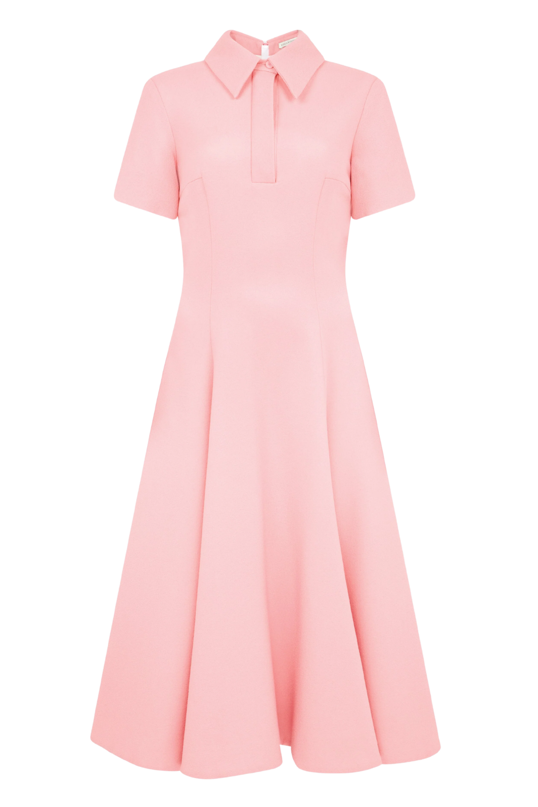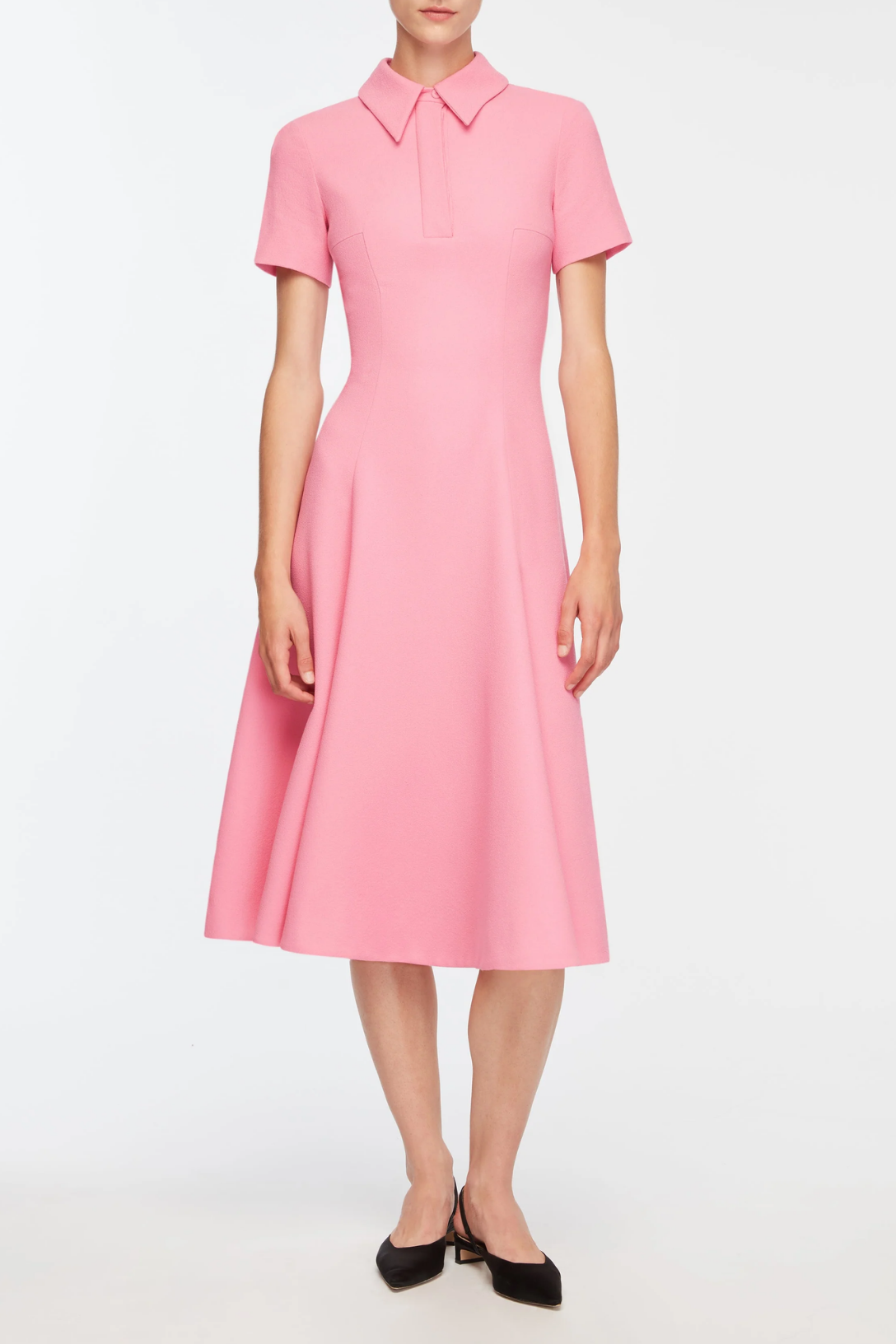 The Feliciana Dress is crafted from structured pink sorbet single wool crepe, giving it a clean, sculpted silhouette. The fitted bodice is defined by subtle panel detailing and leads into a softly flared A-line skirt that moves with ease while maintaining shape. A tailored collar and short sleeves add a refined, polished finish. An elegant choice for daytime events, refined lunches, or occasions that call for a crisp, feminine silhouette.