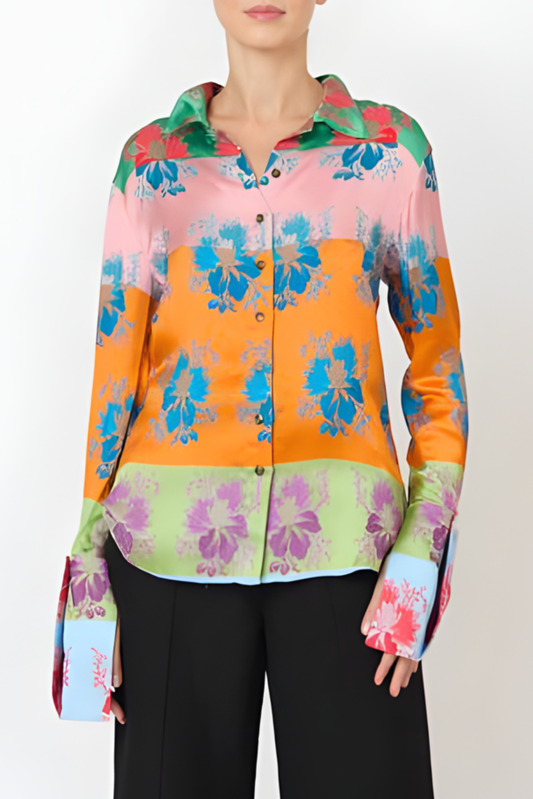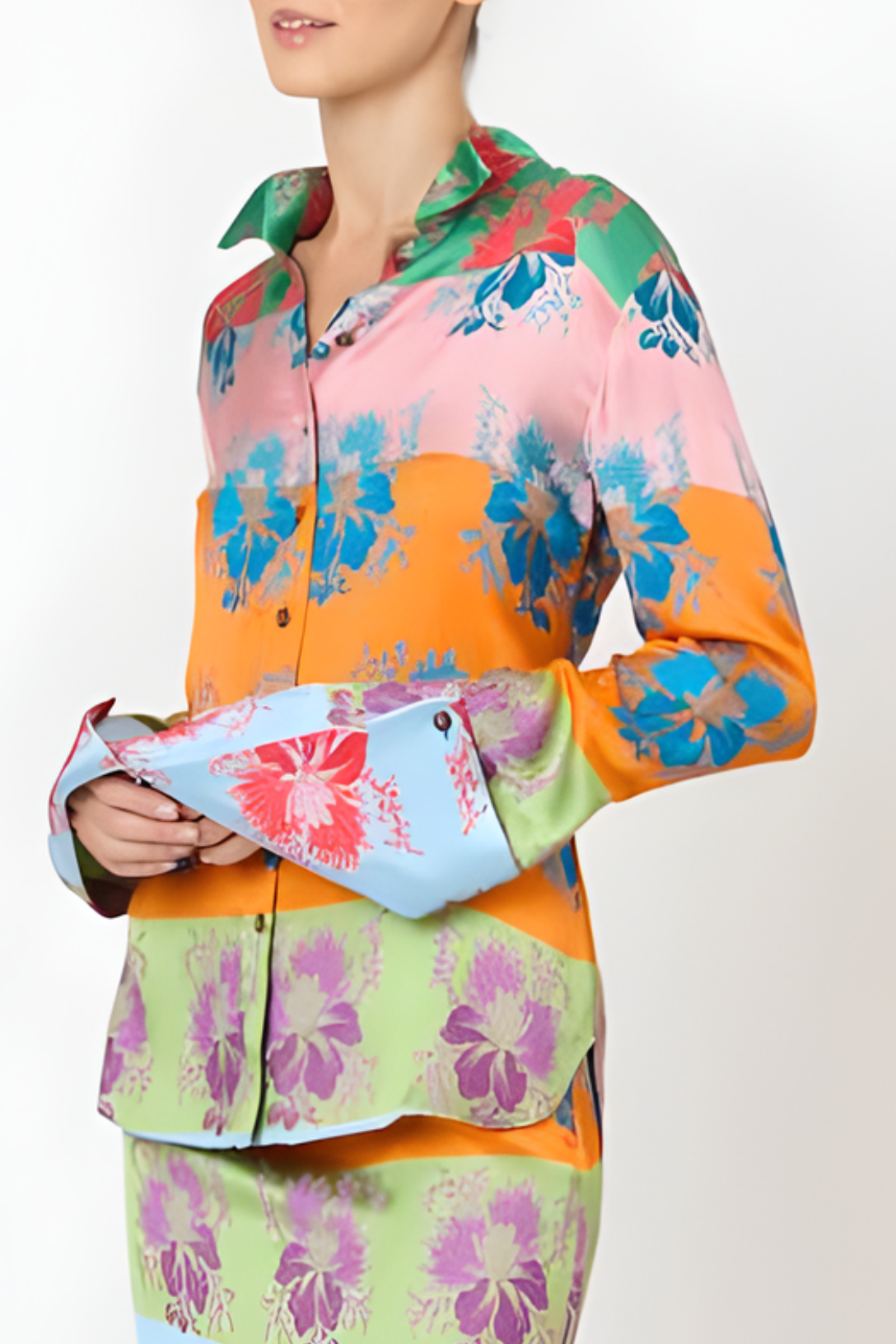 Sharp cuffs and a clean button front keep the structure grounded, letting the silk do the talking. Polished yet playful, it is the kind of piece that turns dressing into an art form rather than a routine.