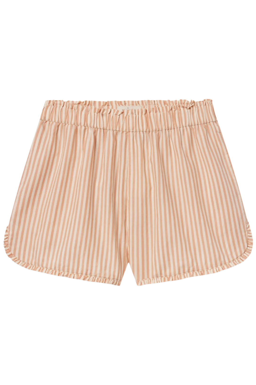 The Lucille Shirt is a pull-on short with curved hems at the side seams, a wide elastic waistband and delicate ruffle trim. Featuring TROVATA's signature hidden side seam pockets. Shown here in Maple Stripe and made from TROVATA's coastal cotton.