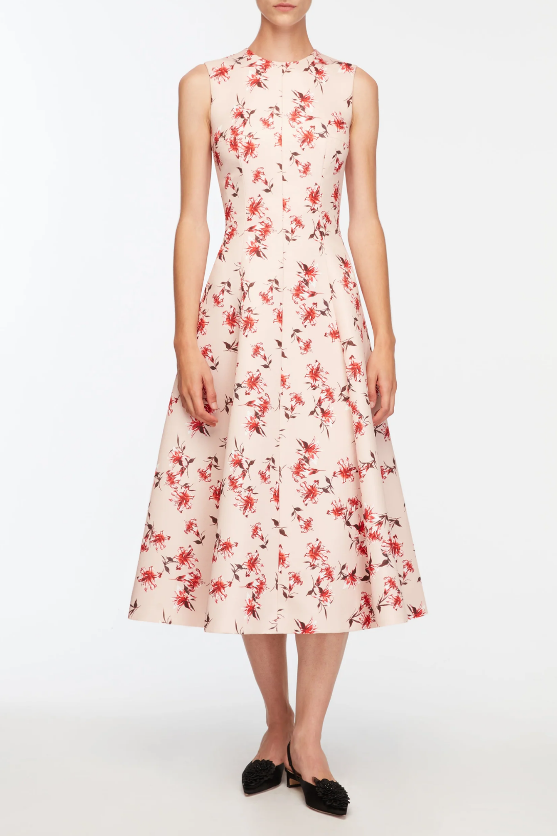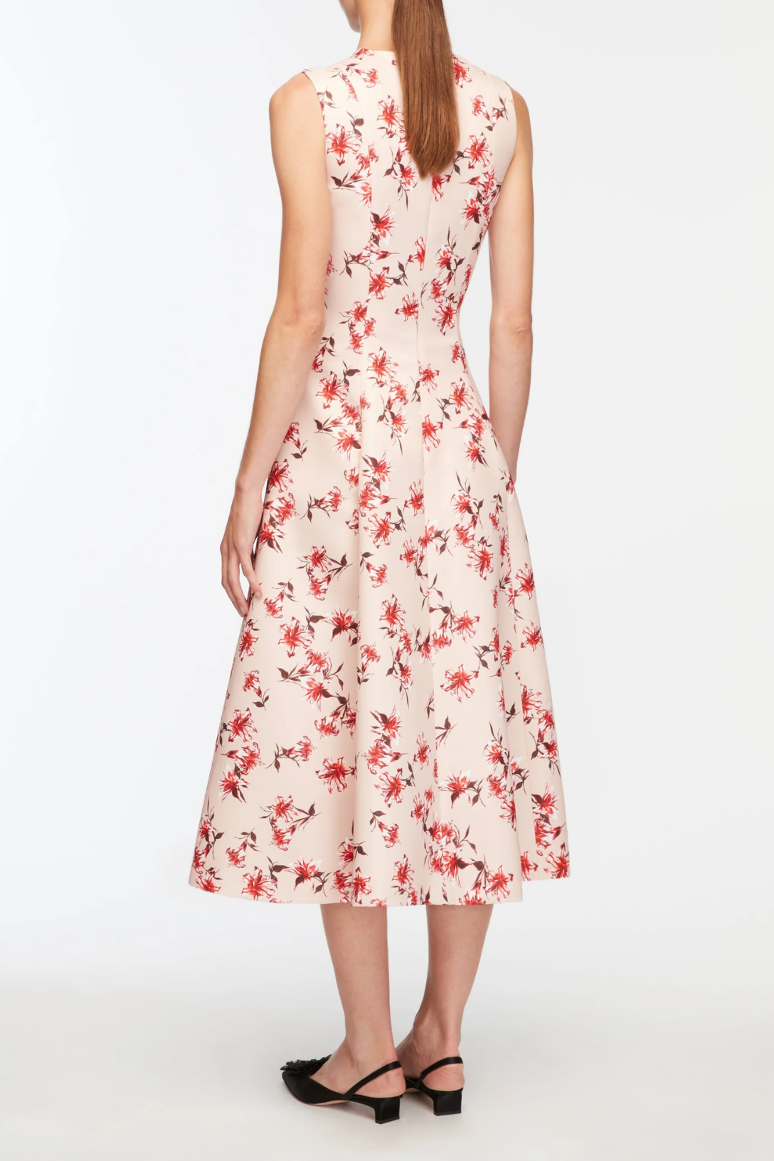 The Mara Dress is crafted in pink taffeta faille and printed with red Summer Lilies, offering a fresh, feminine take on occasion dressing. The sleeveless bodice is clean and structured, leading into a full A-line skirt with soft movement. Finished with precise panel detailing, it creates a flattering silhouette with ease. A versatile style ideal for daytime events, garden parties, and elegant celebrations.