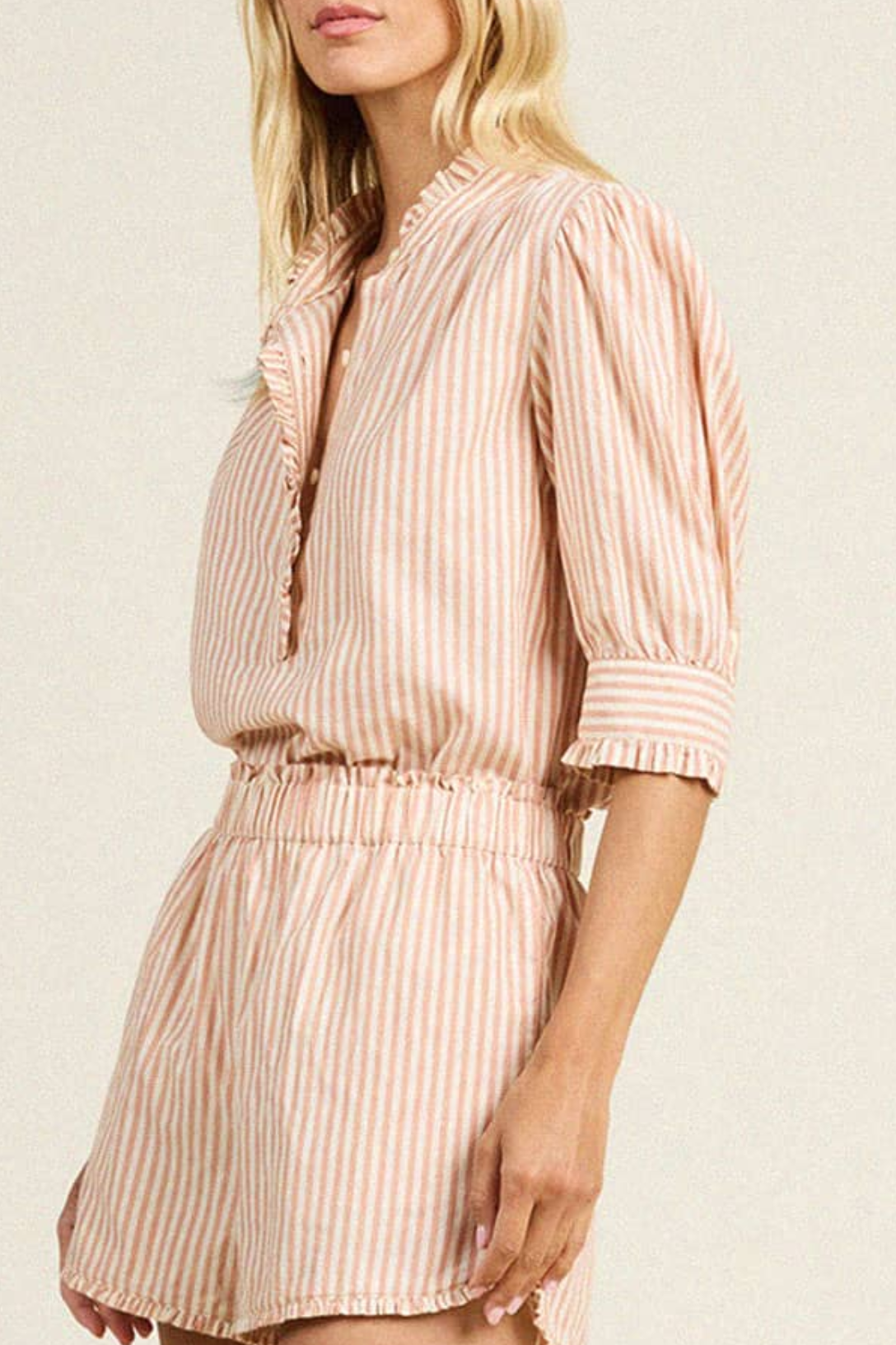 The Noah Shirt is TROVATA's classic button-down shirt with added feminine details. The standup collar and center front button placket have self-fabric ruffle details. Half Sleeves gather into cuffs with ruffle detailing. Shown here in Maple Stripe and made from TROVATA's coastal cotton.