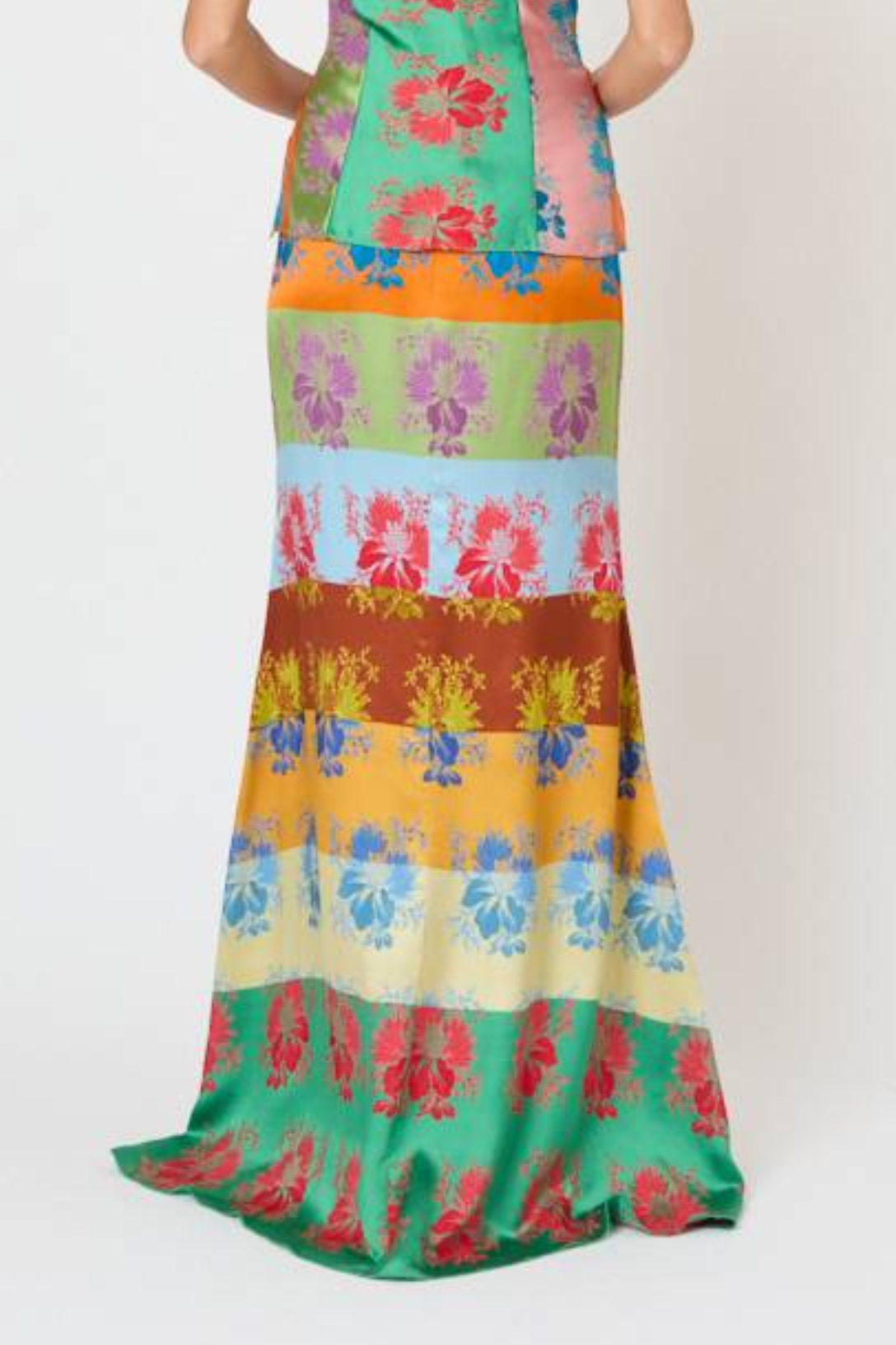 A study in color and movement, this skirt is cut from fluid hibiscus jacquard silk woven in saturated, horizontal stripes. The surface catches light with every step, creating a subtle shimmer that feels vibrant and alive.