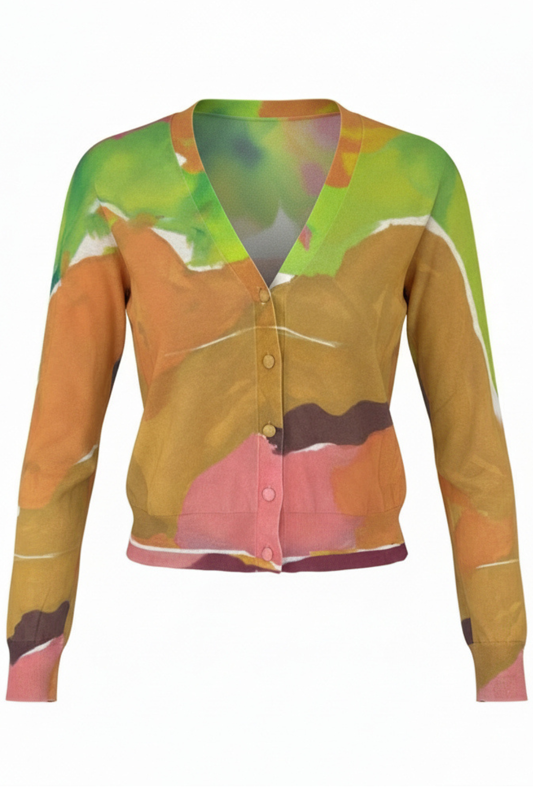 The Viviene Cardigan is saturated with vibrant fields of color from Helen Frankenthaler’s 1973 painting, “Nature Abhors a Vacuum.” Crafted from a light gauzy knit, this multicolored cardigan uplifts the everyday with an effortless fit that complements denim and tailoring.