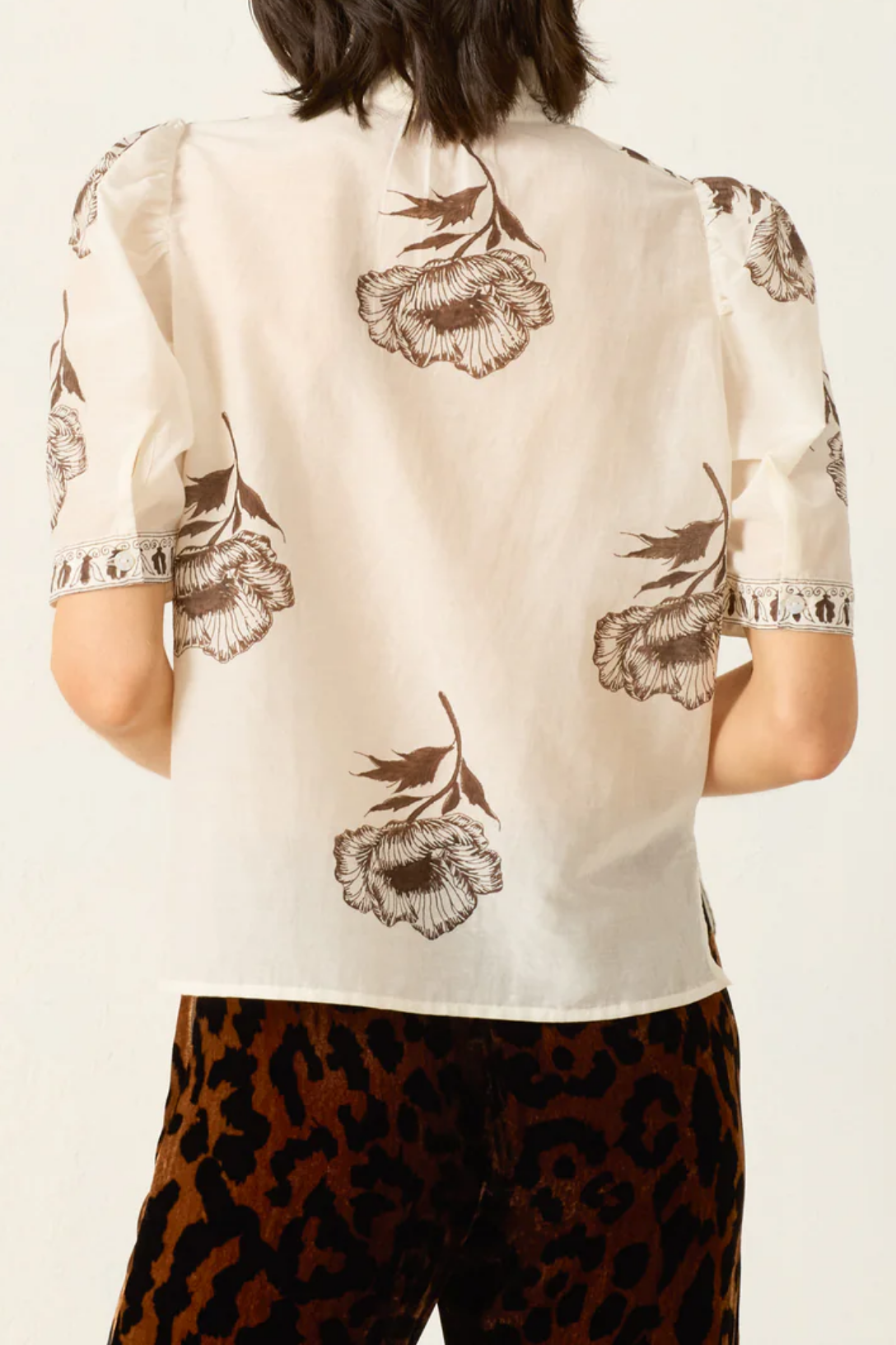 A perennial favorite, the Winn has puff shoulders and a feminine ruffled collar. Alix of Bohemia's cotton-silk blend shirt is hand-block-printed with a detailed poppy motif.