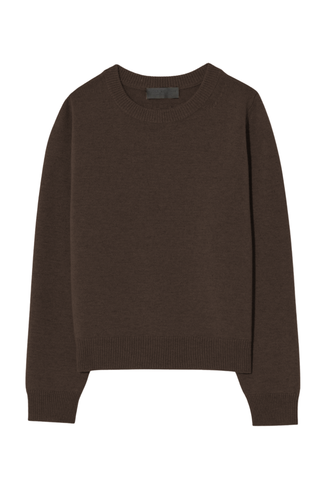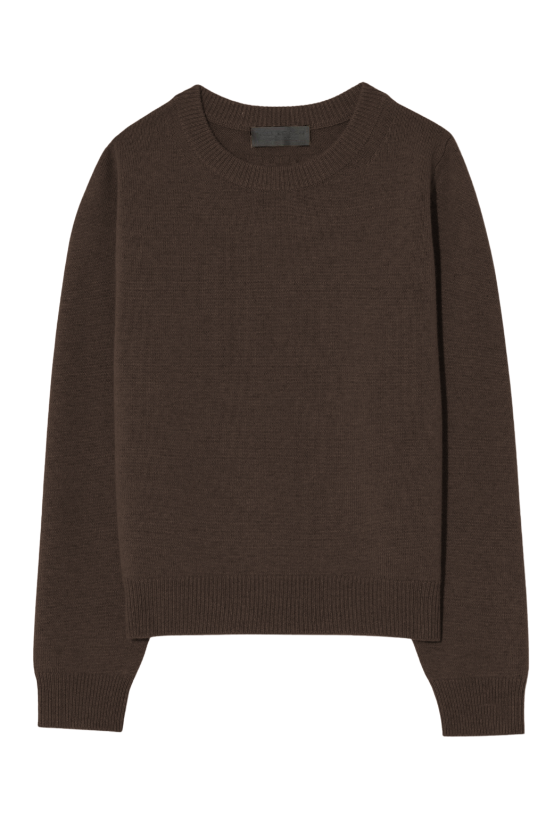 Light to medium weight sweater in cashmere. Straight body. Set in sleeve. Double layer rib at neckline. Fully fashioned along arm hole and shoulder. Wristlet sleeve length. Signature center back cable knit detail.