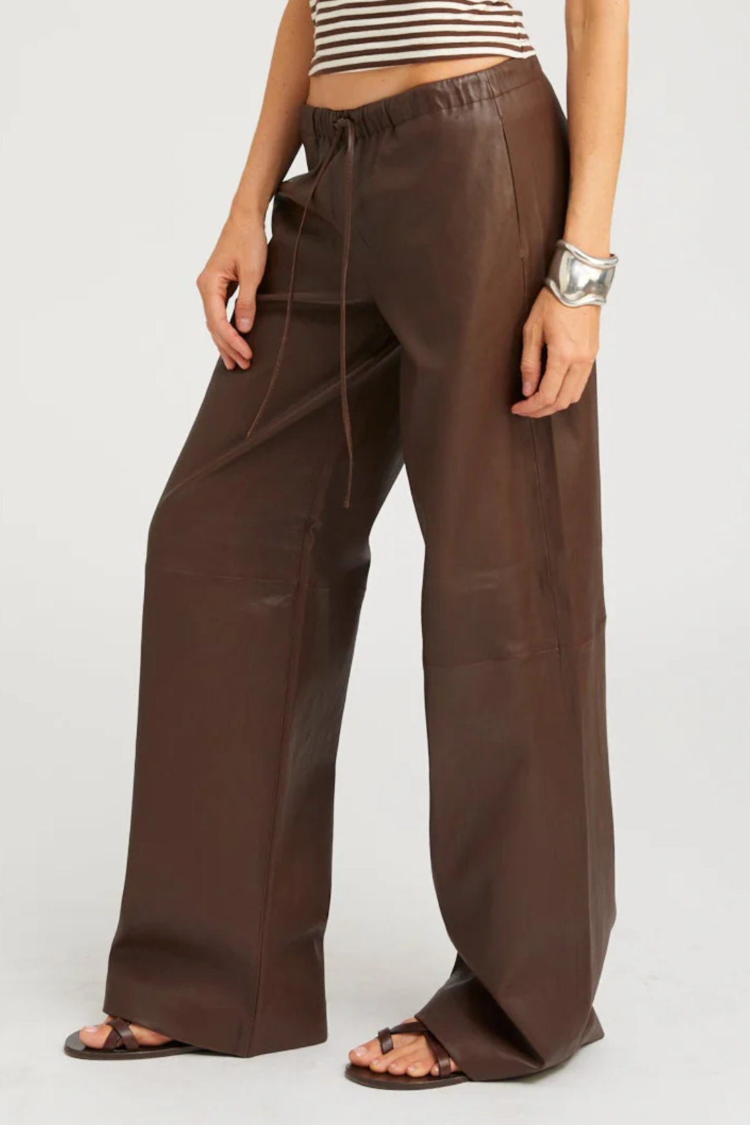 SPRWMN's Kauai pants, now made in their signature stretchy plongé leather. These pants feature a comfortable, loose fit with a stretchy drawstring waistband for effortless pull-on wear.